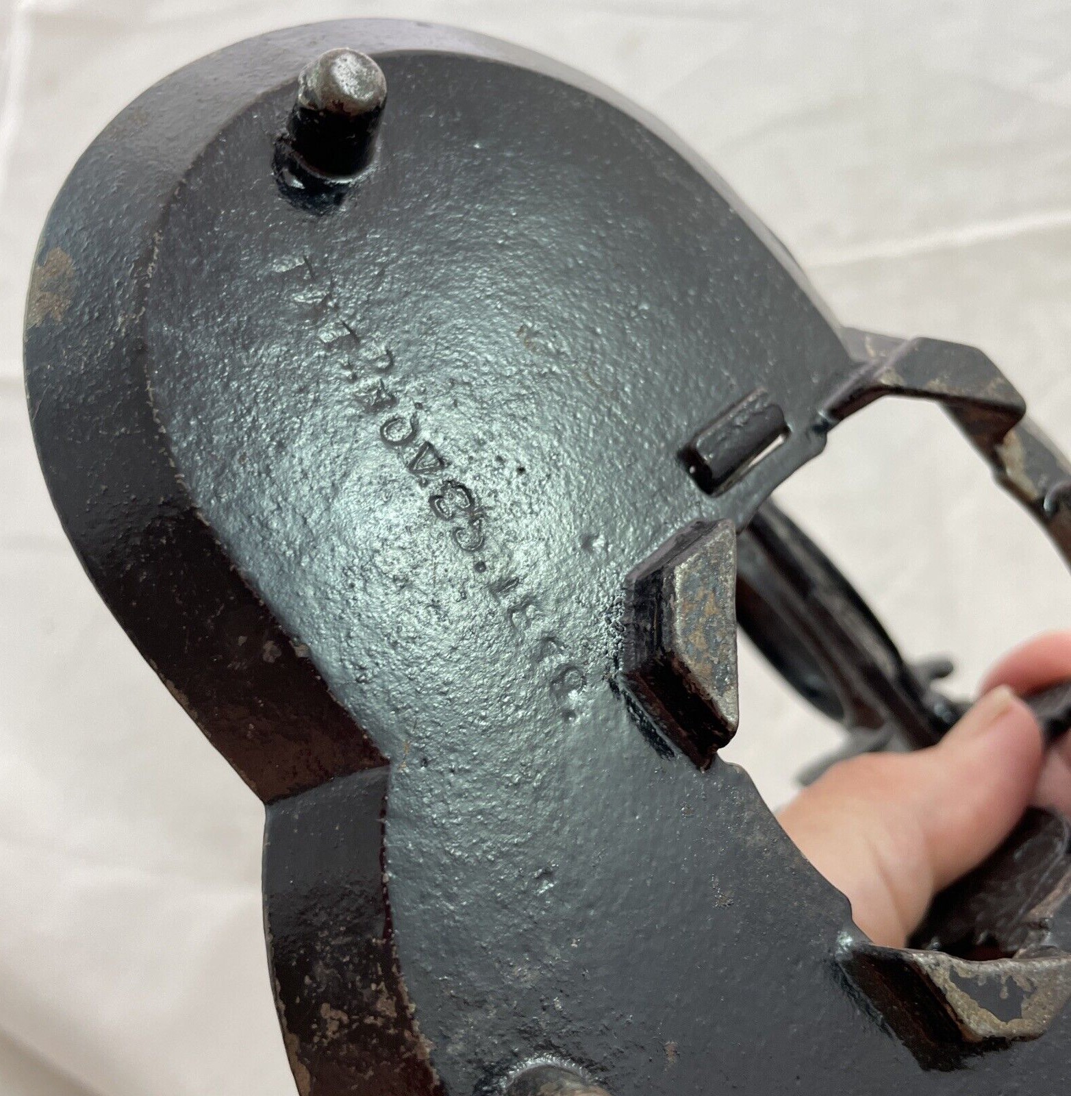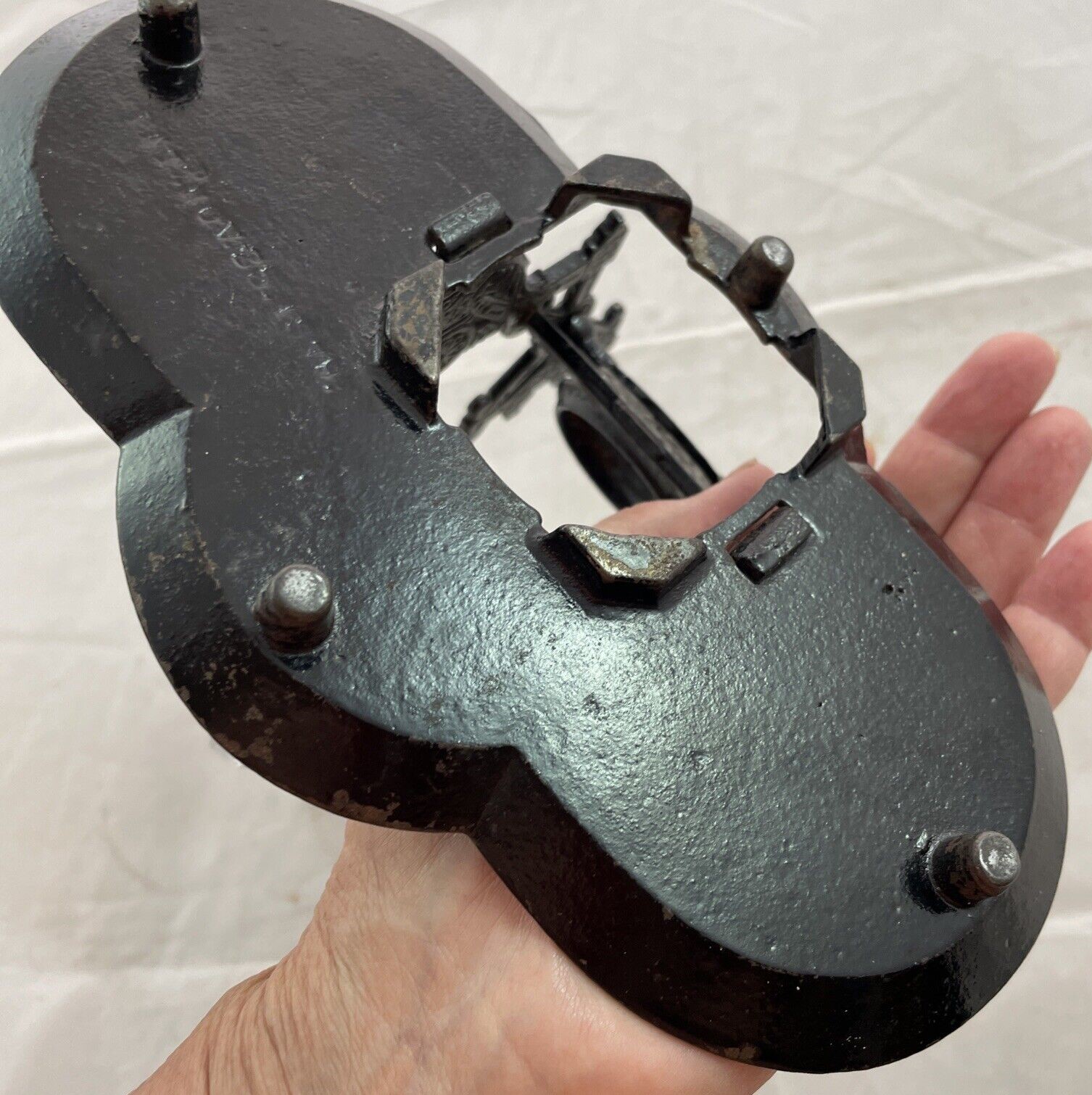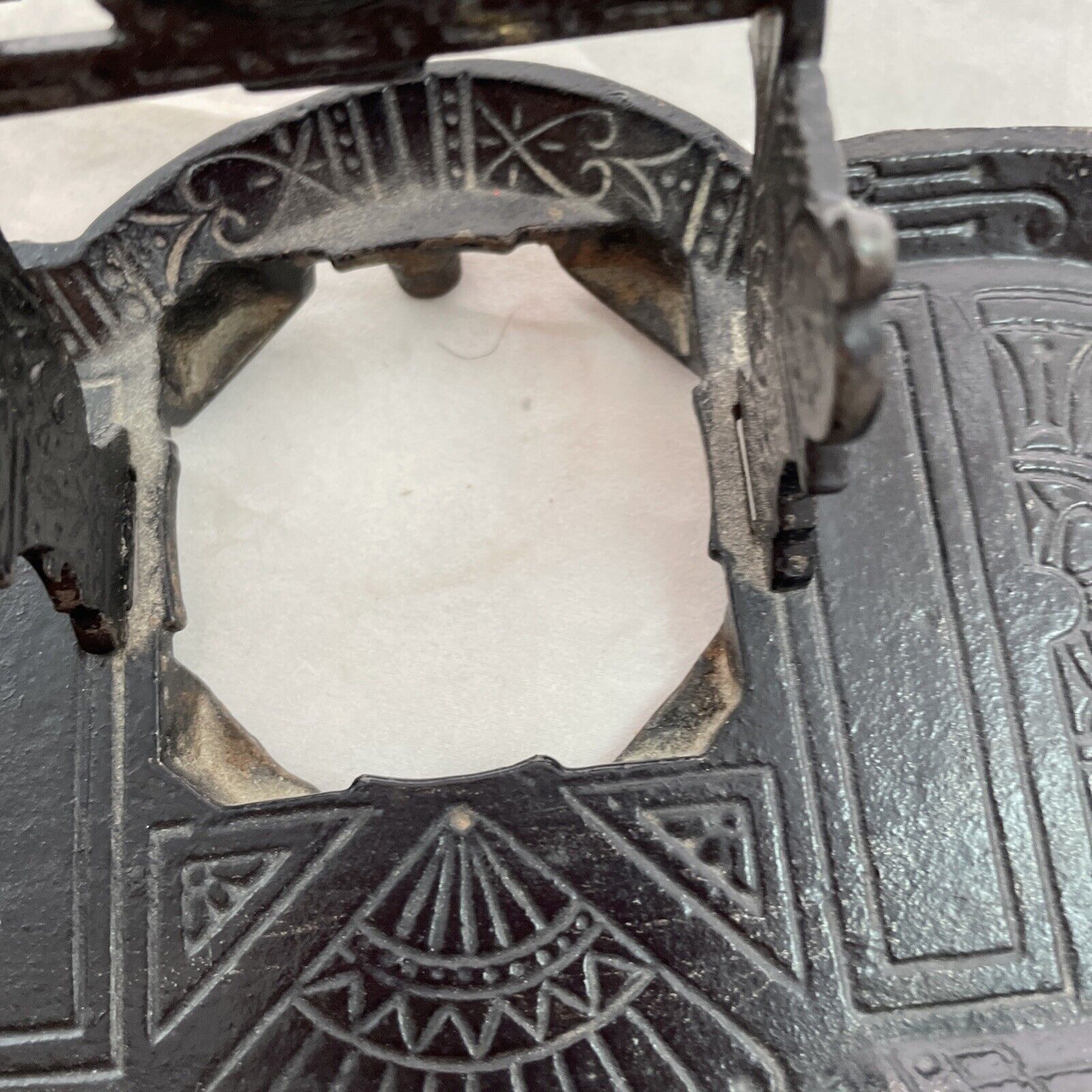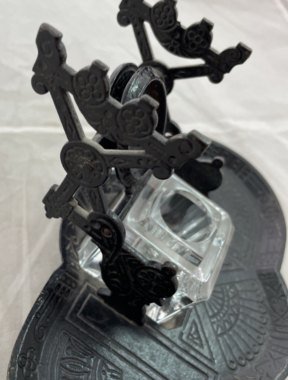 The pressed glass inkwell is held in a cast iron inkstand. The lid is attached to a bar on the frame and, when in use, lifts upright, resting on a disc. On top is a pen rack that can hold three pens. The circular shell base can hold writing implements.