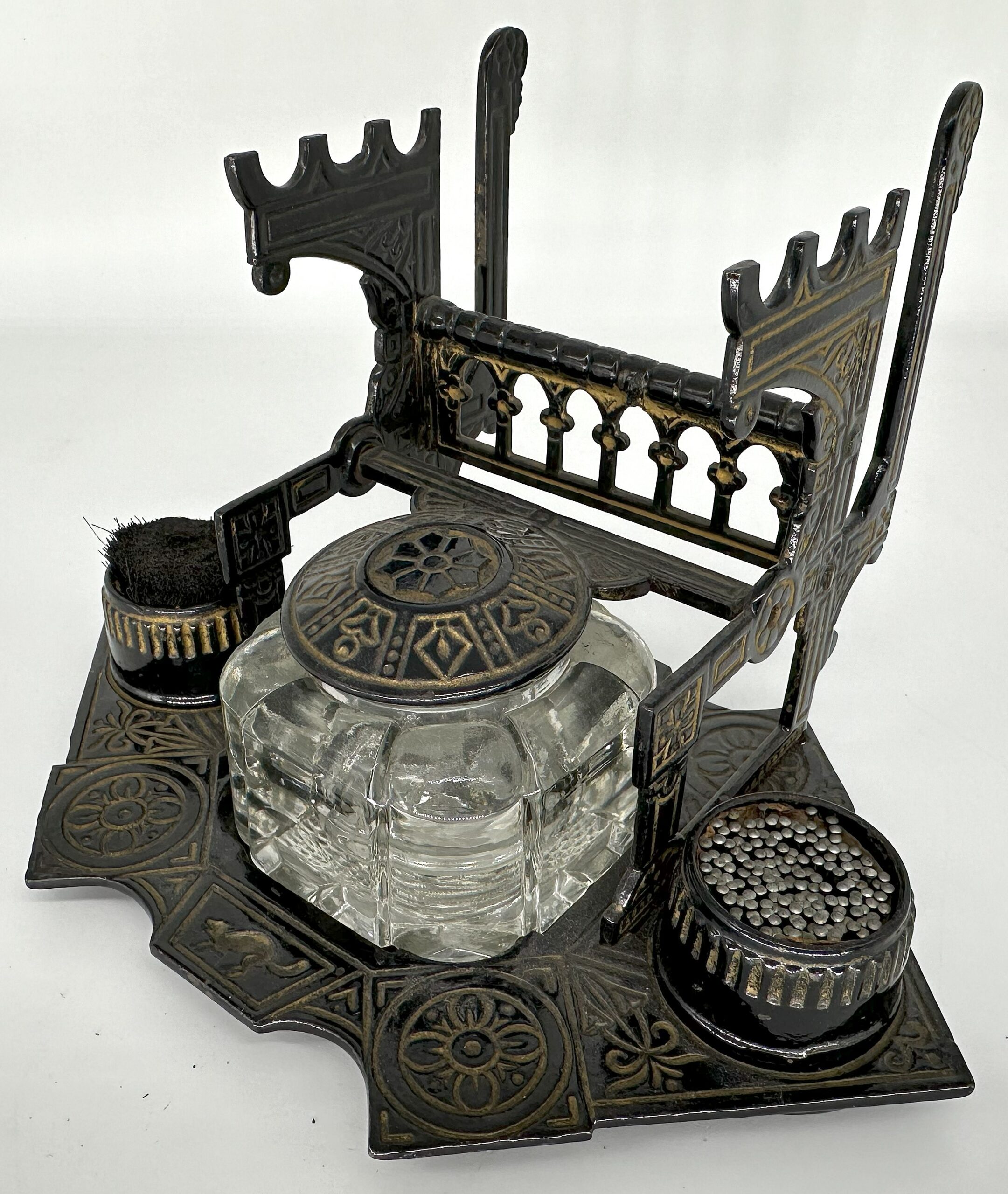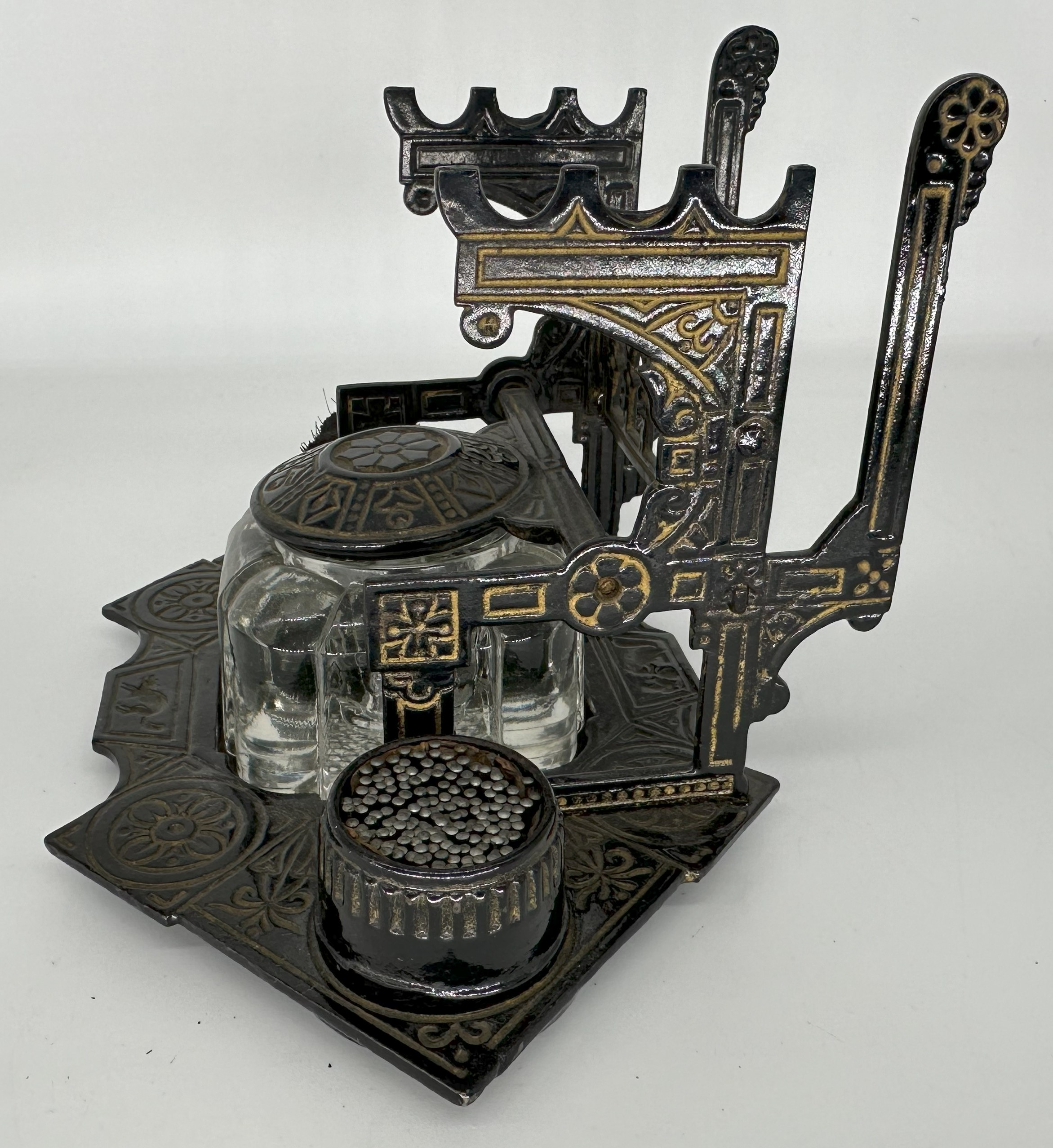 The pressed glass inkwell is held in a cast iron inkstand. The irregularly shaped base features incised decorations, including a small animal that looks like a cat or a ferret. The lid is attached to a bar on the frame and lifts upright when in use. On top is a three-station pen rack. In the rear is a slot to hold letters or a blotter. The backplate has a design of open arches. On the bottom, it is marked “Pat. Nov 25, 1879”. On the left side is a pen wipe. On the right side is a container holding needles. Needles were used like staples to bind sheets of paper together.