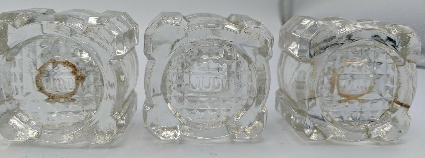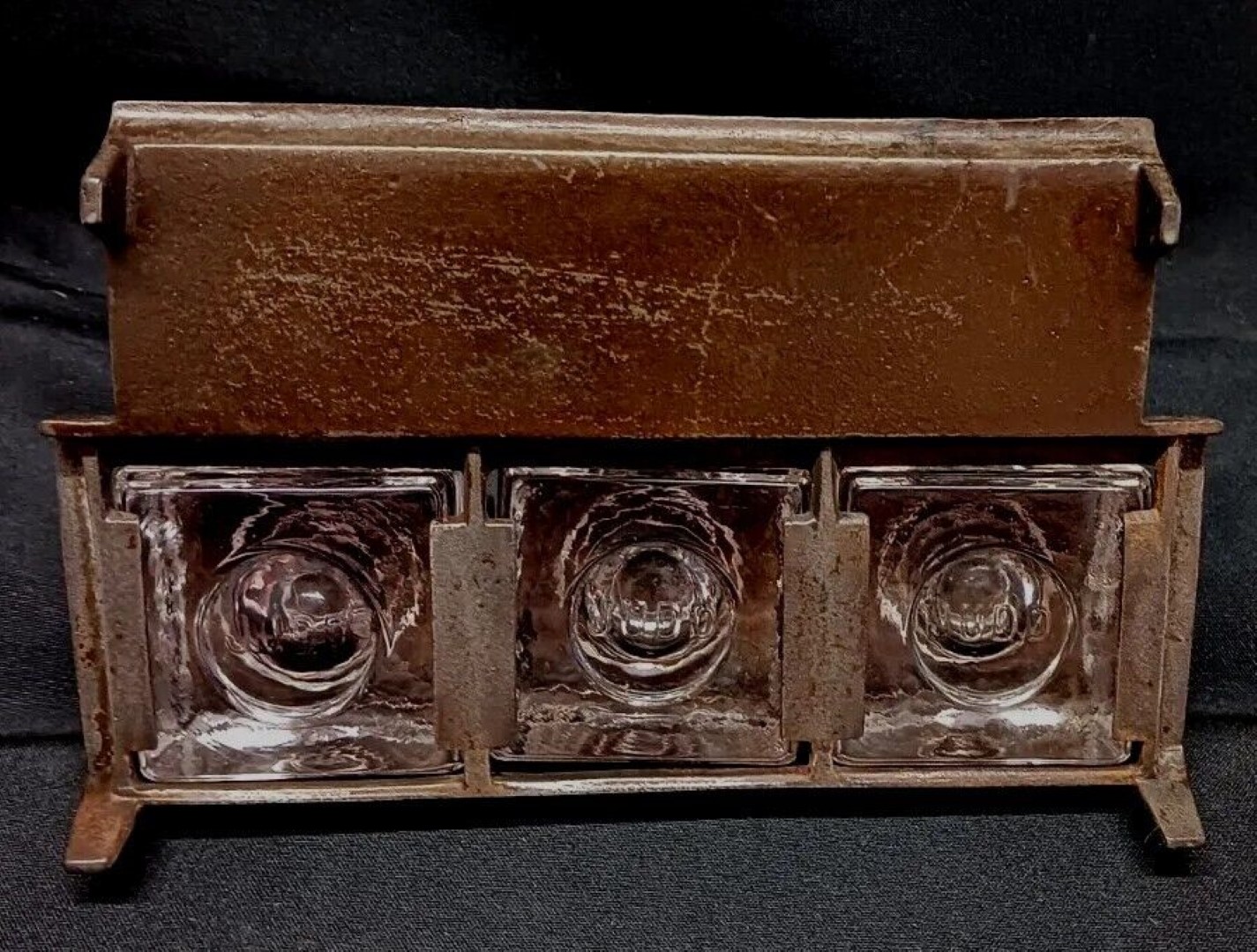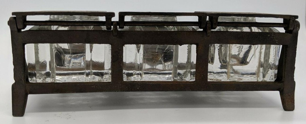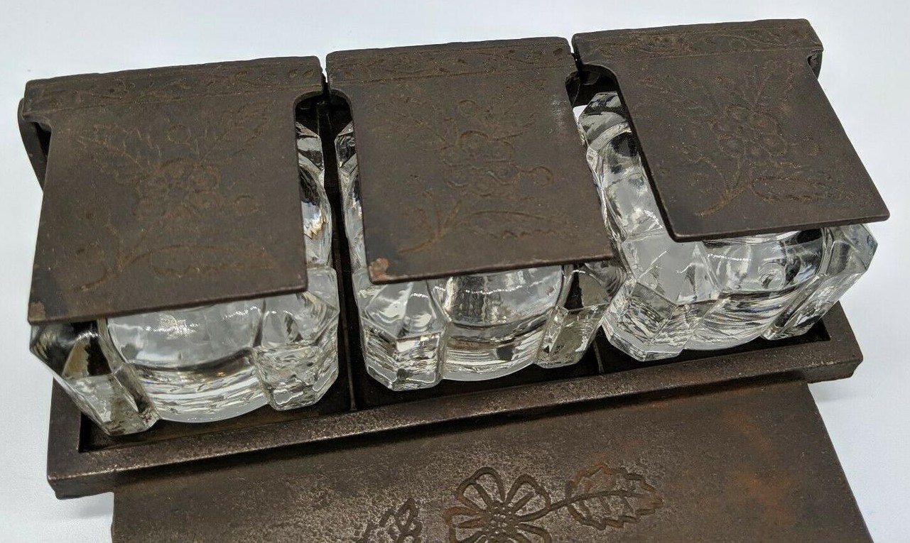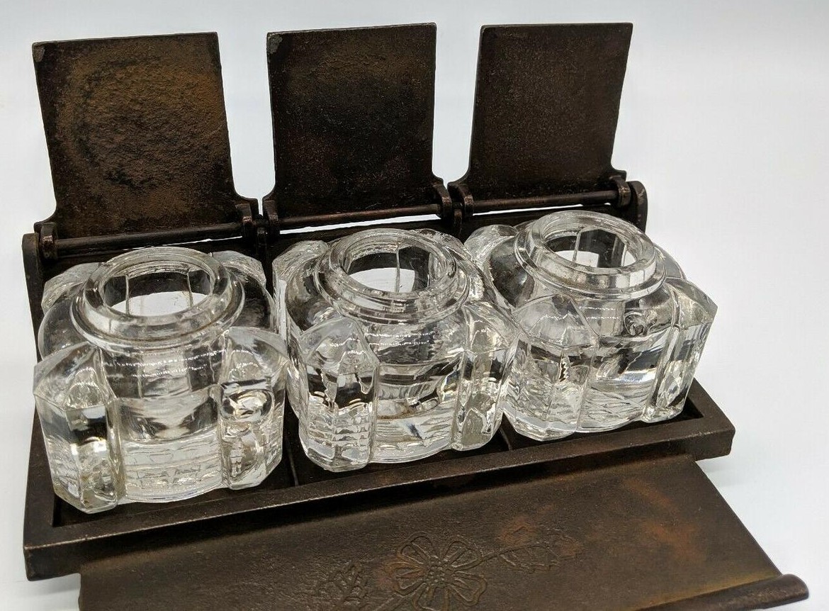 Cast iron inkstand with three glass inkwells. The lids are hinged to the base, covering each inkwell separately. Embossed pattern of flowers & berries on each lid. All three inkwells are marked “Judd”. A pen tray in front completes the inkstand.