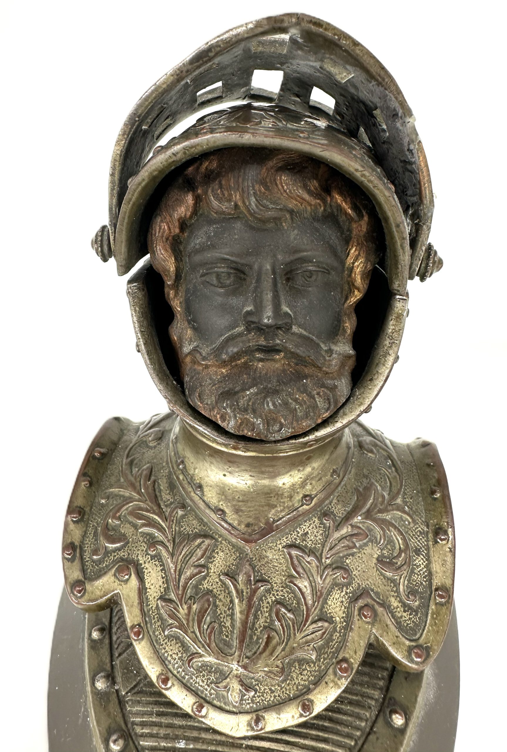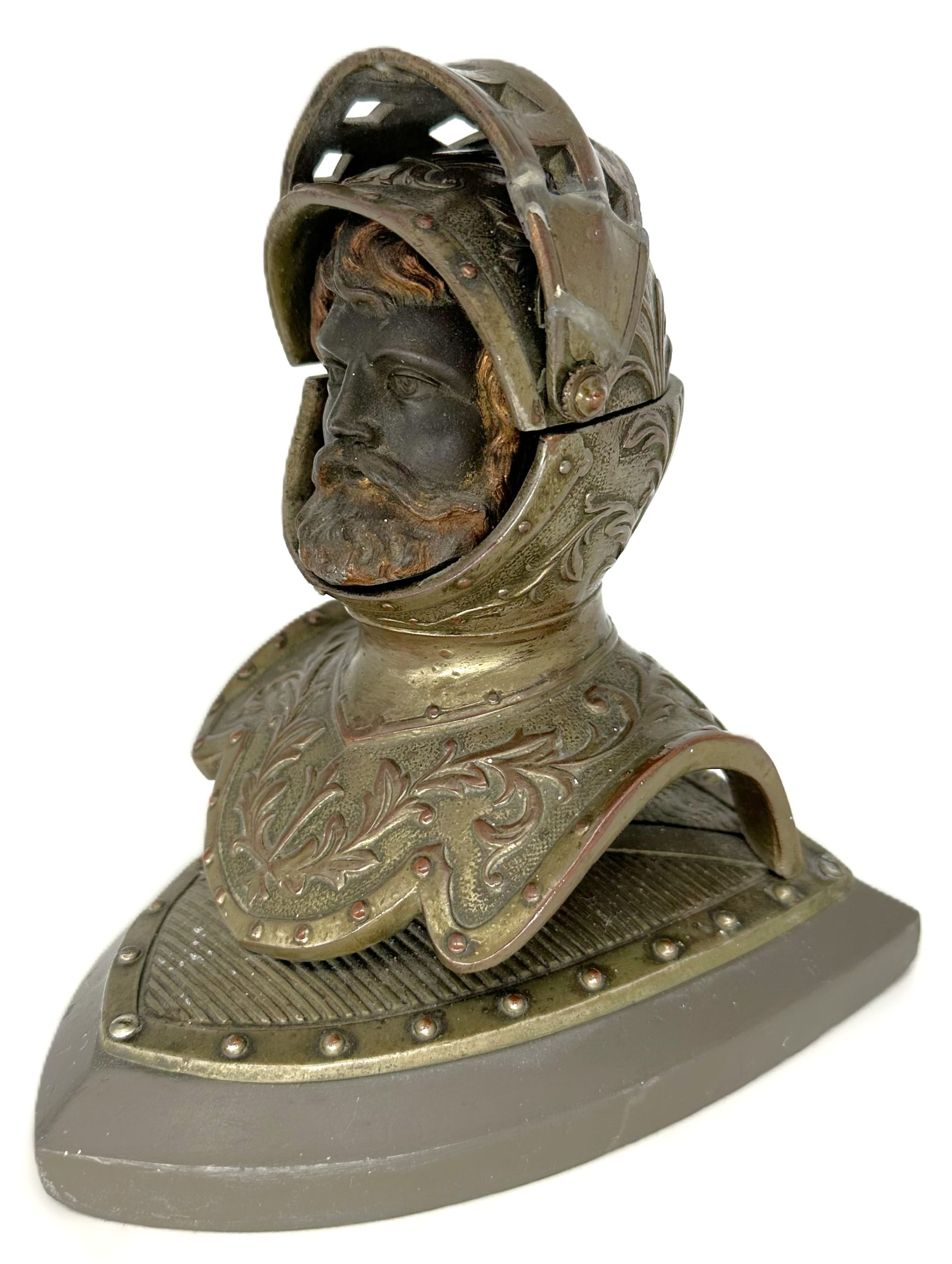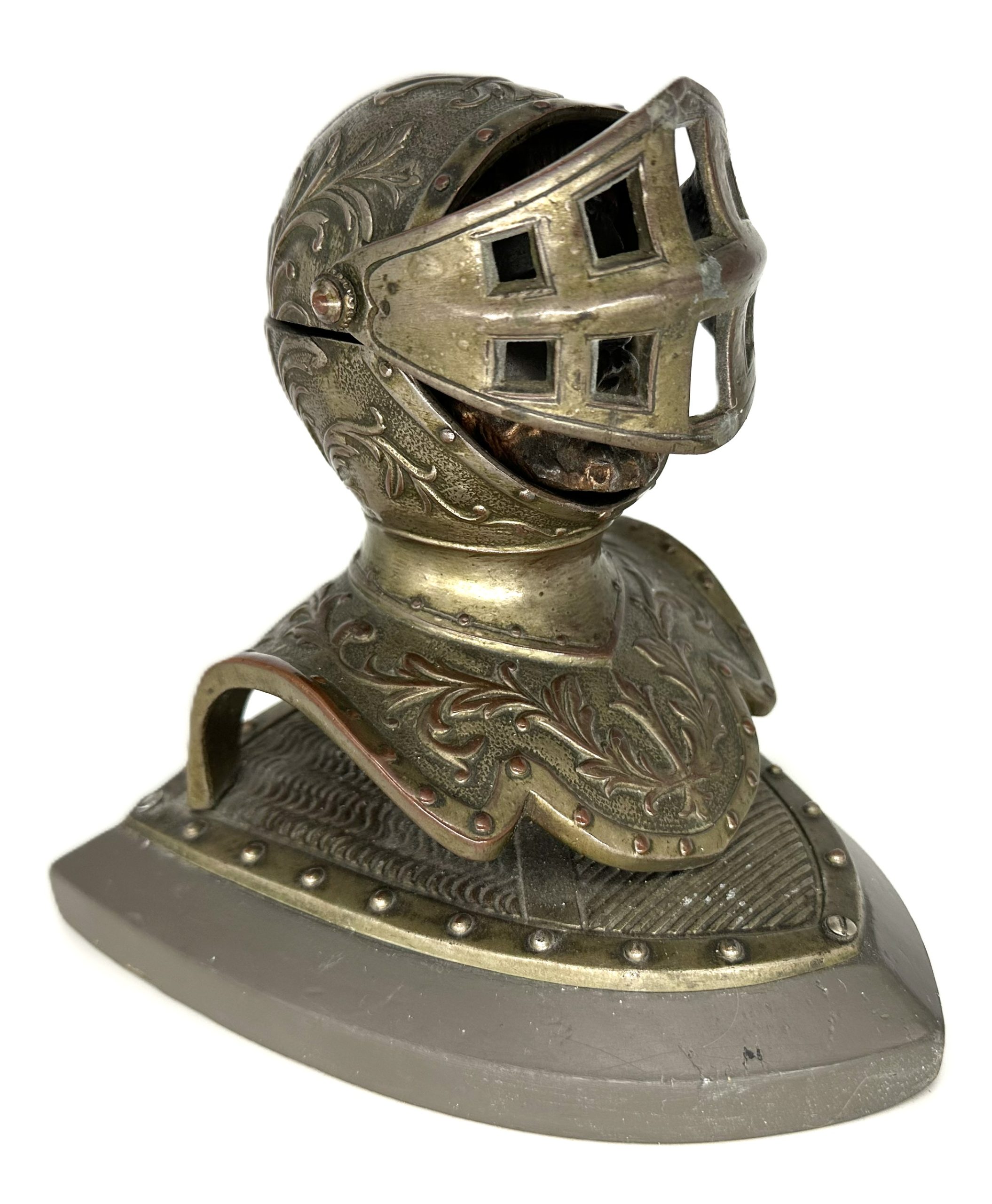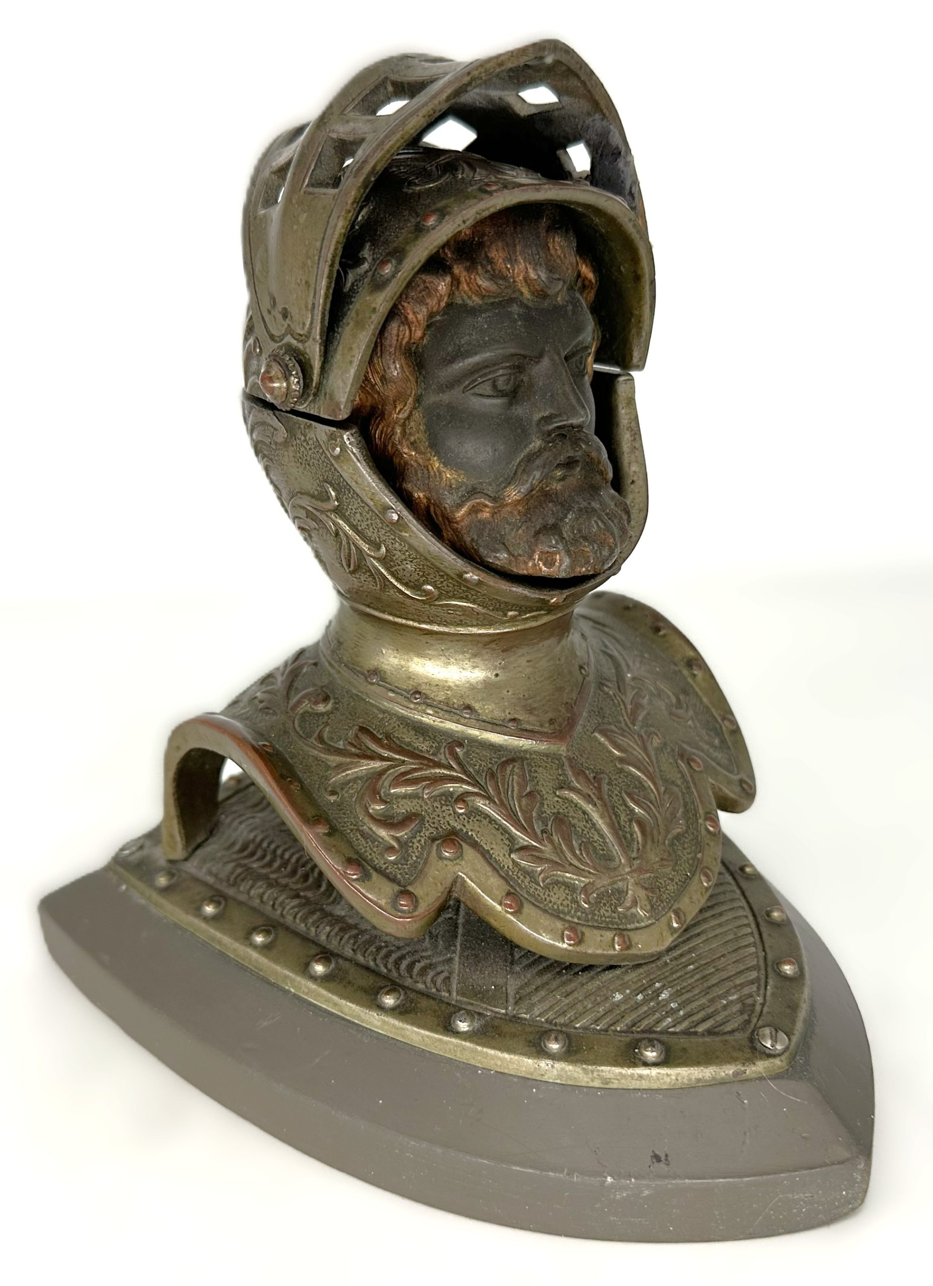 • Form: A bust of a knight wearing a Close Helmet (specifically a “bellows face” style, characterized by the horizontal ventilation slits).