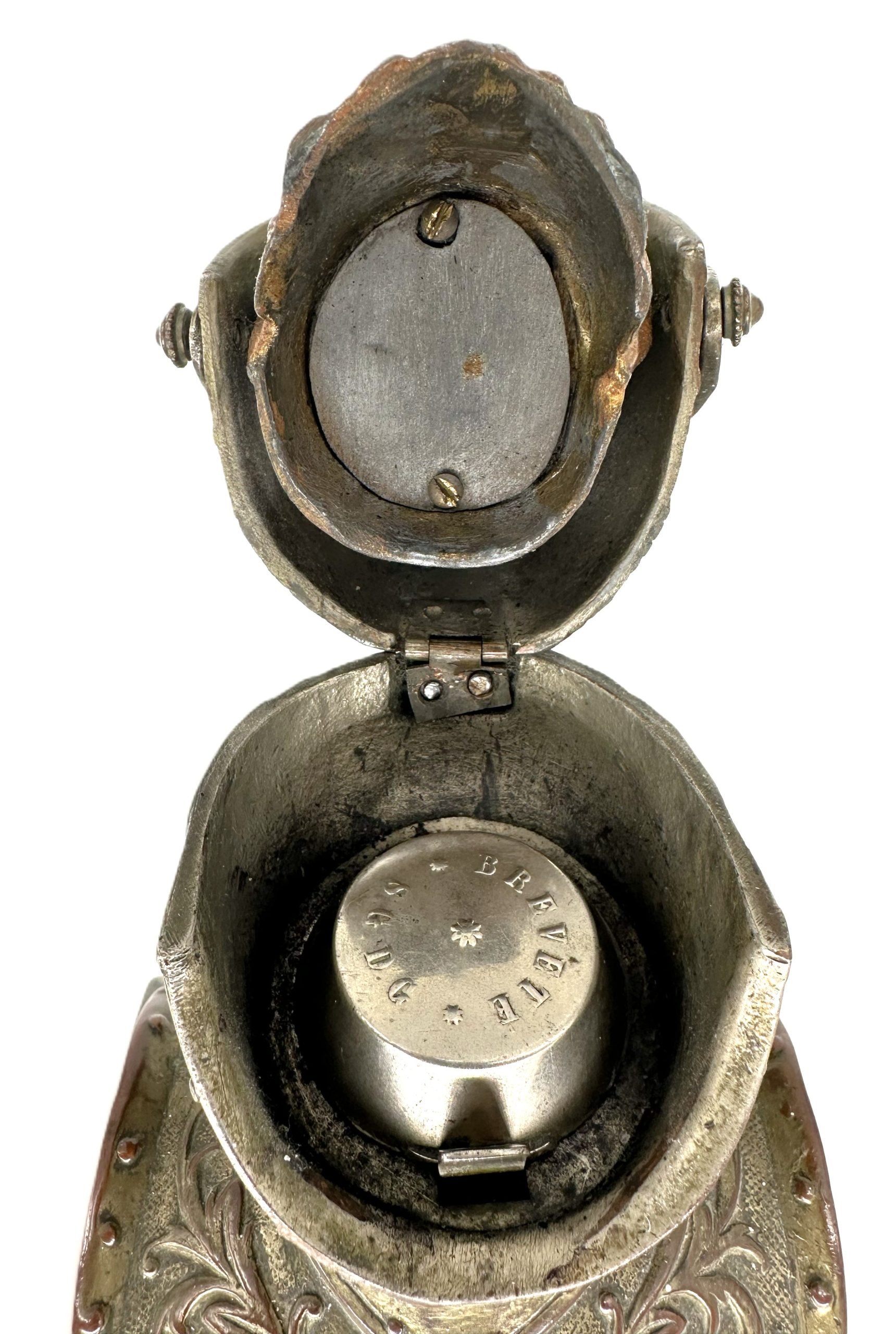 • Interior: It contains a removable glass inkwell covered by a metal thumb-release lid marked “BREVETÉ S.G.D.G.”