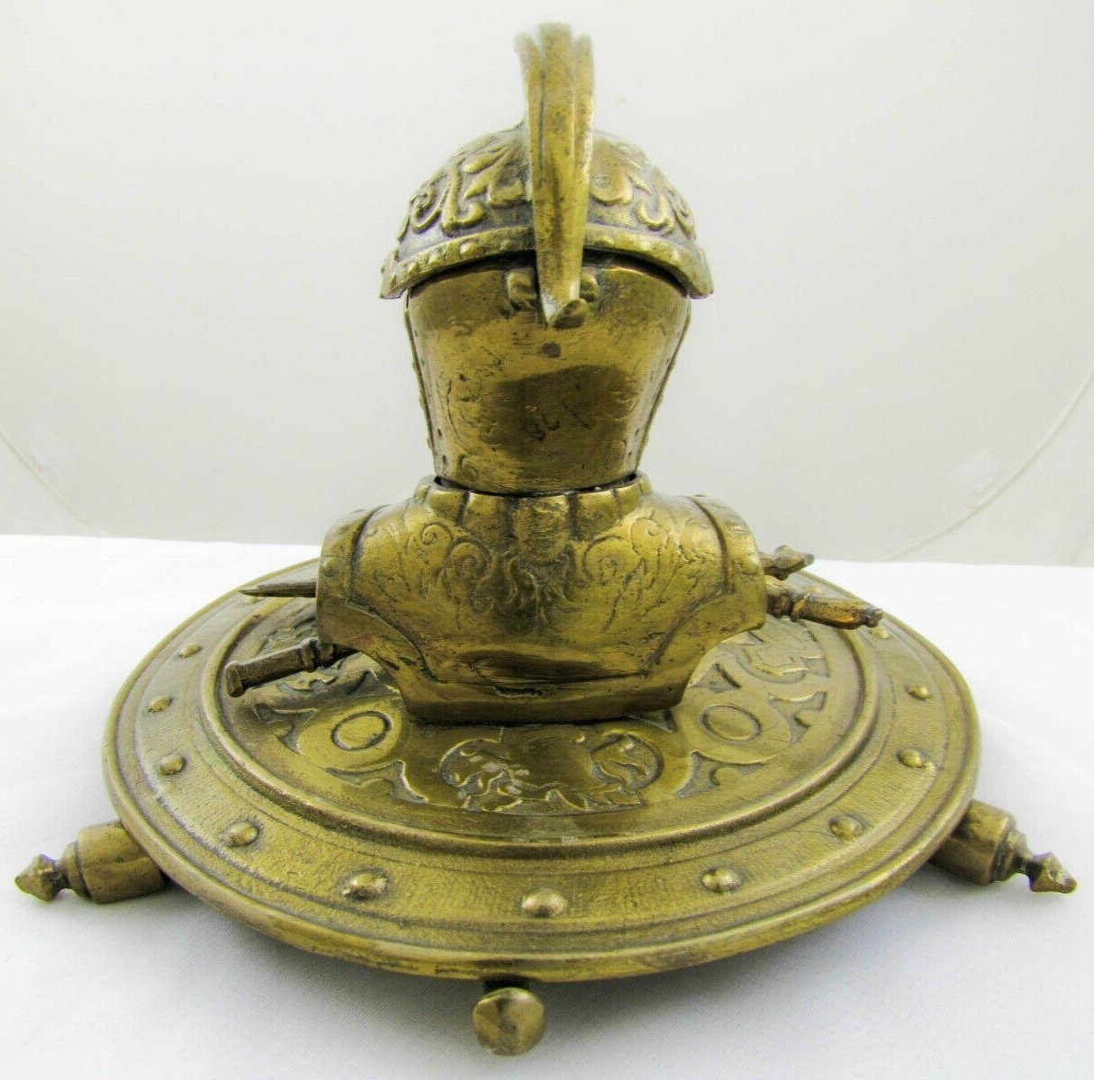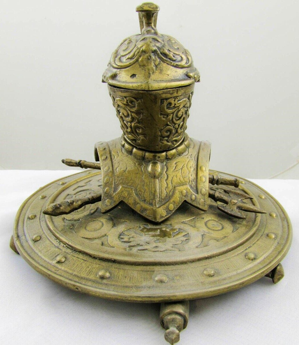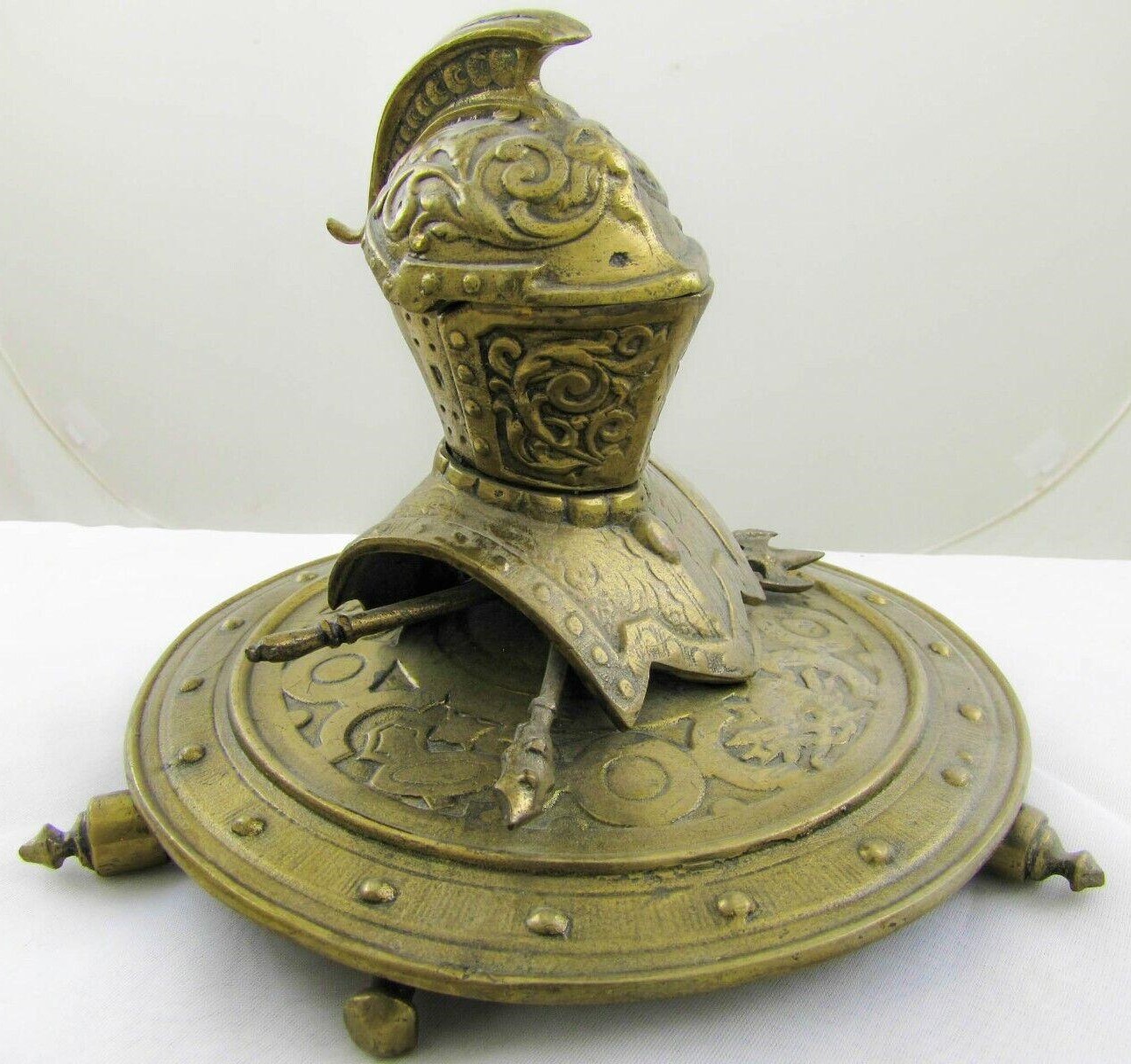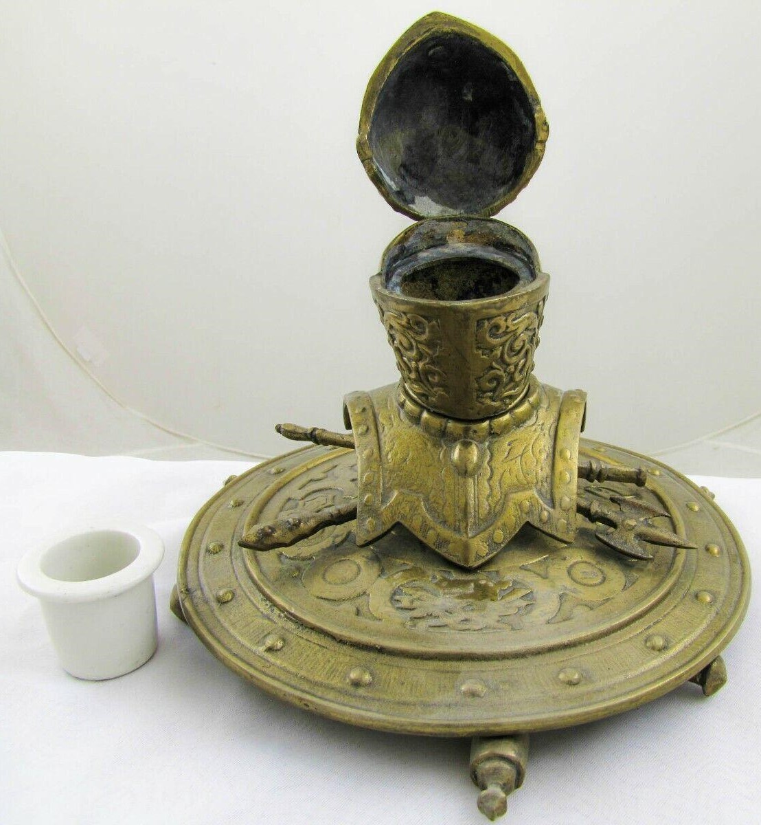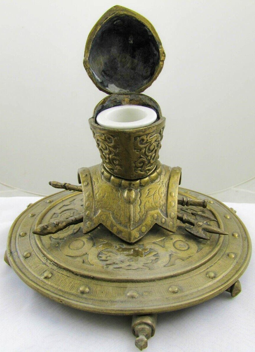 Inkstand in the form of a medieval knight’s helmet and shoulder plate, with axe and club resting on a round shield base.