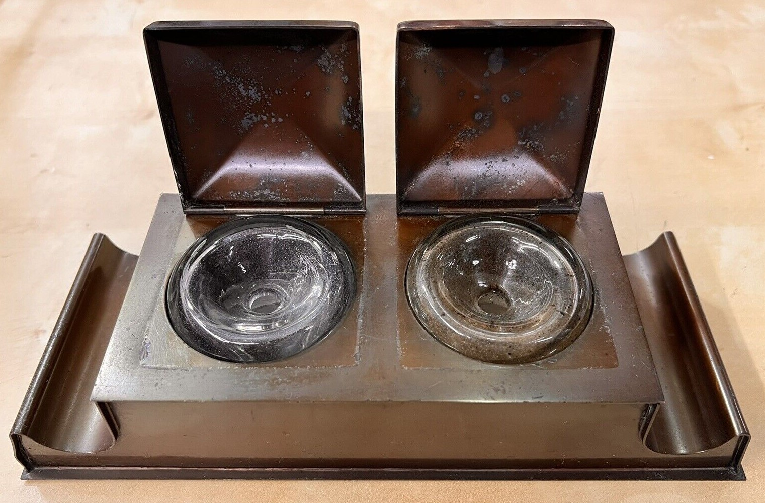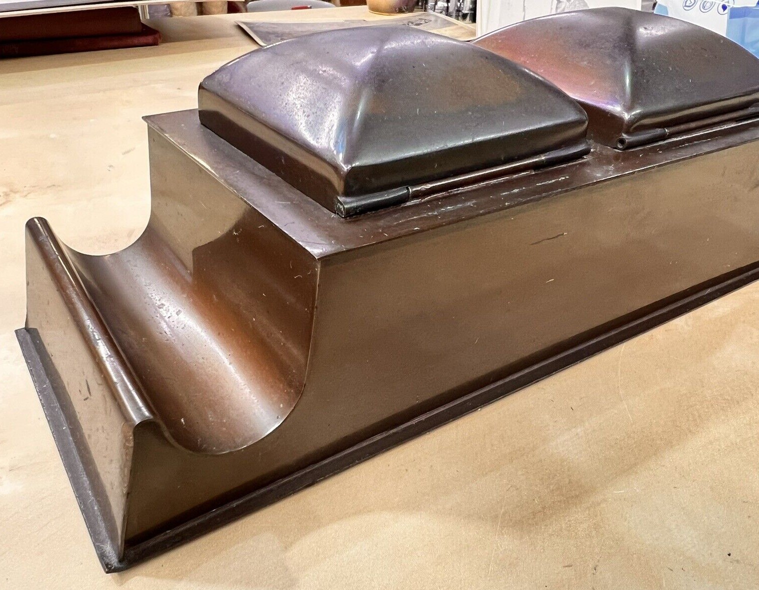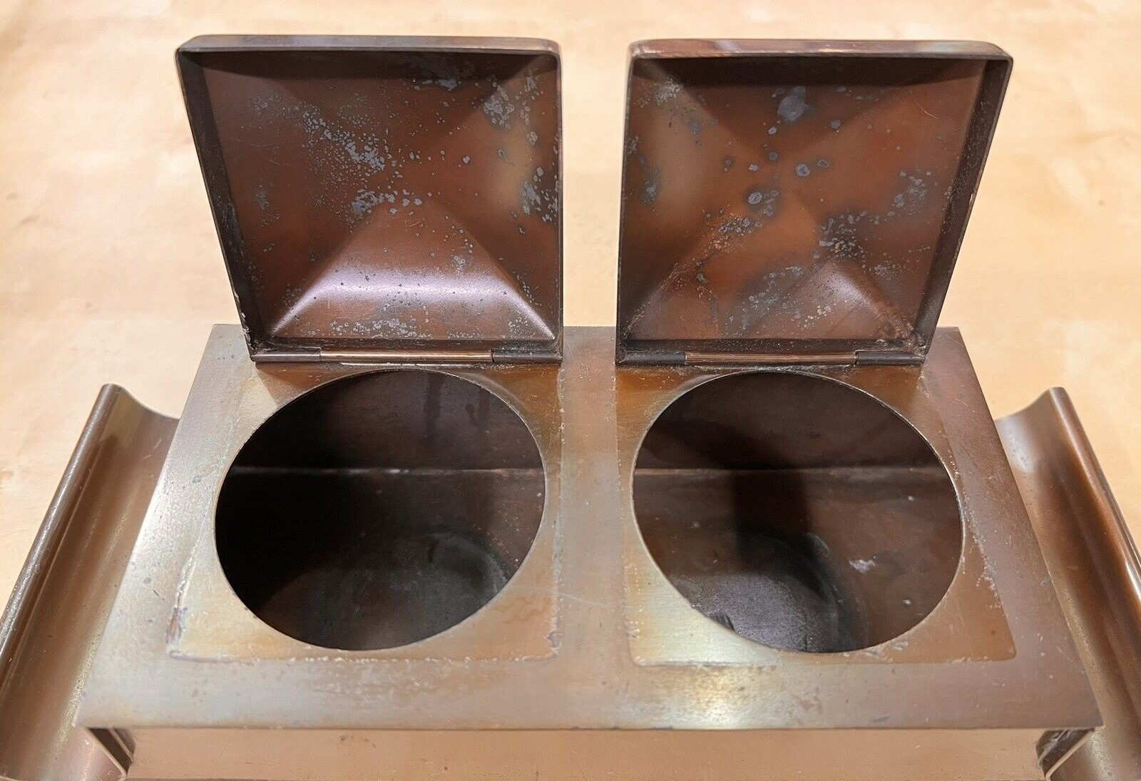 Kronheim & Oldenbusch (K&O) manufactured this rectangular-shaped double inkstand with a copper finish. Two hinged raised lids cover the glass inkwells. There is a pen channel on each side.
