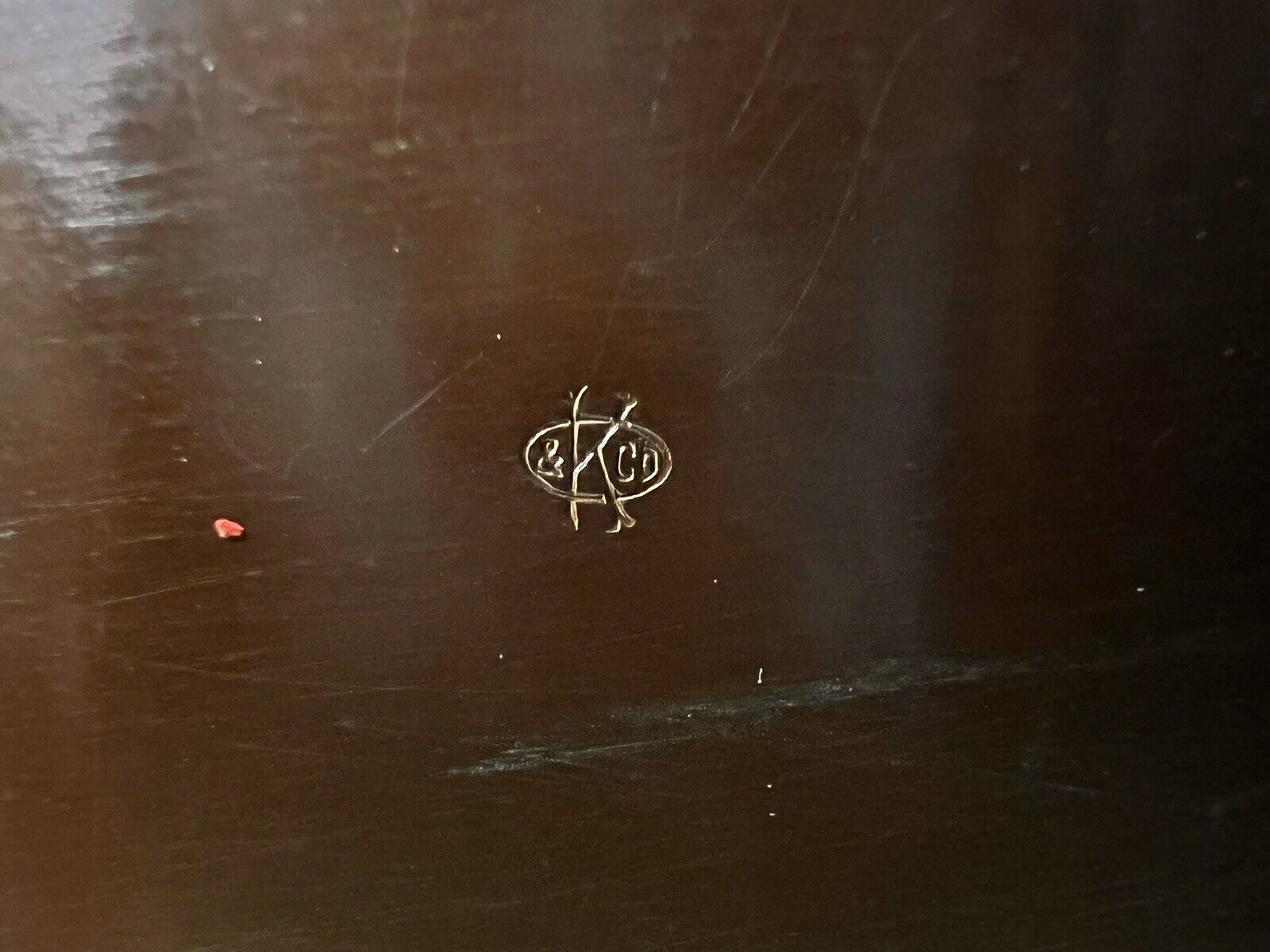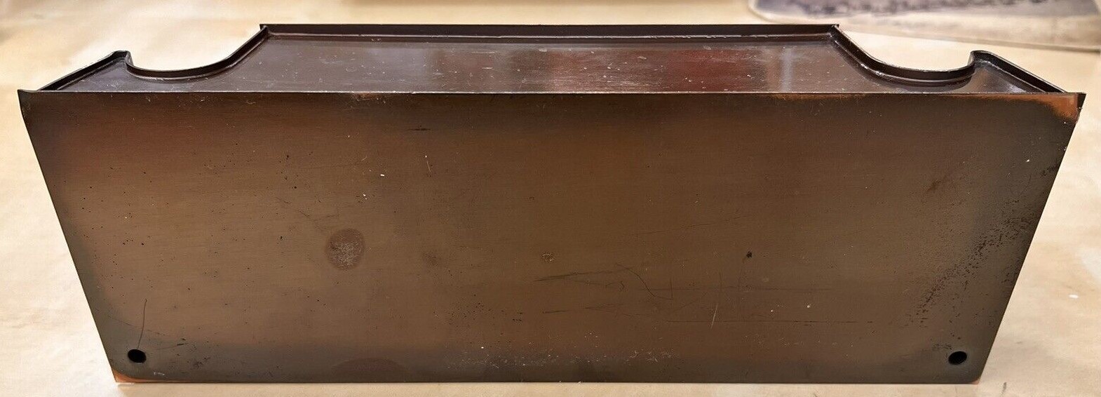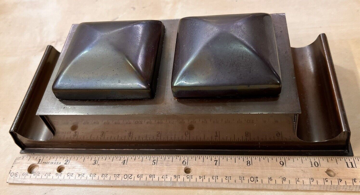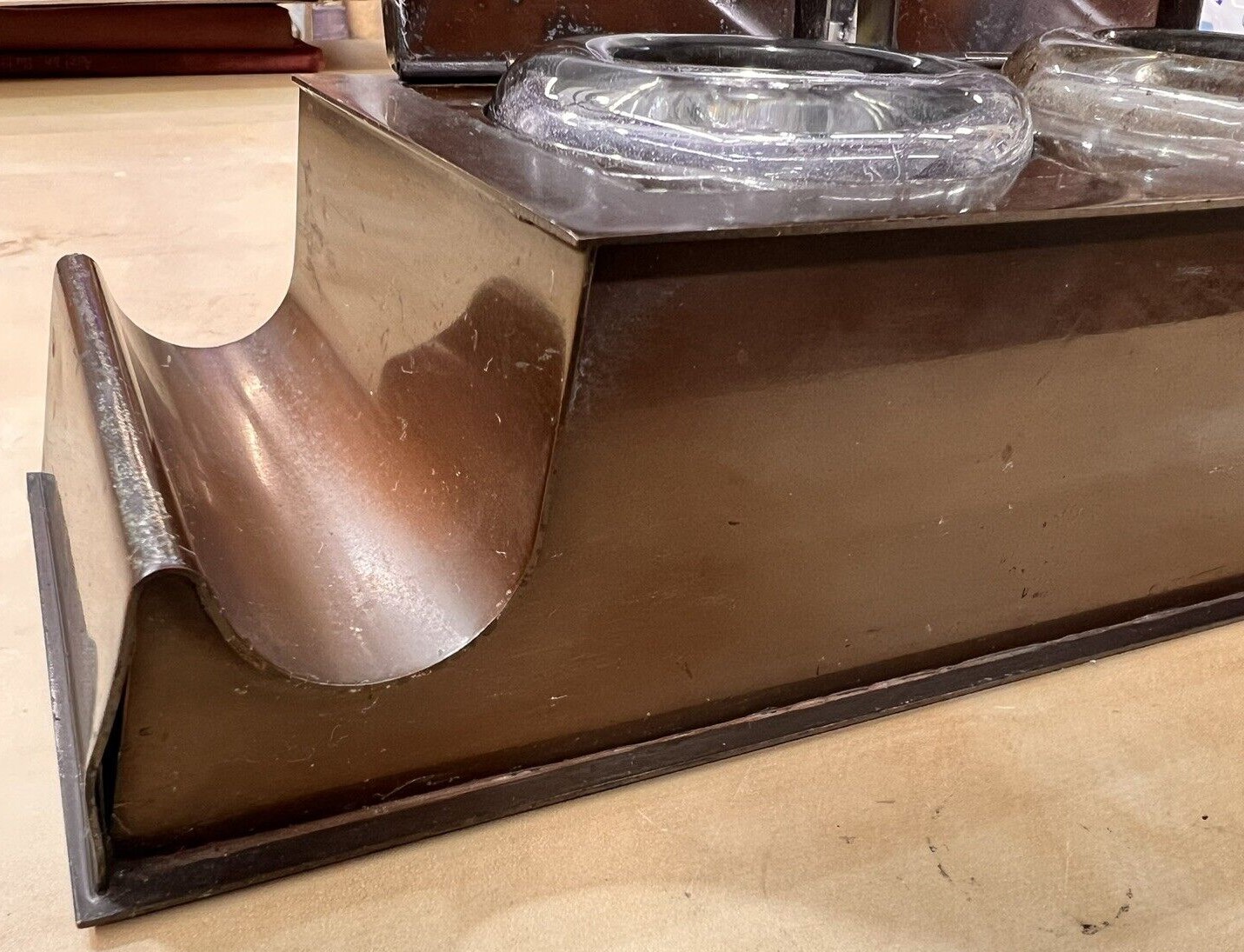 Kronheim & Oldenbusch (K&O) manufactured this rectangular-shaped double inkstand with a copper finish. Two hinged raised lids cover the glass inkwells. There is a pen channel on each side.