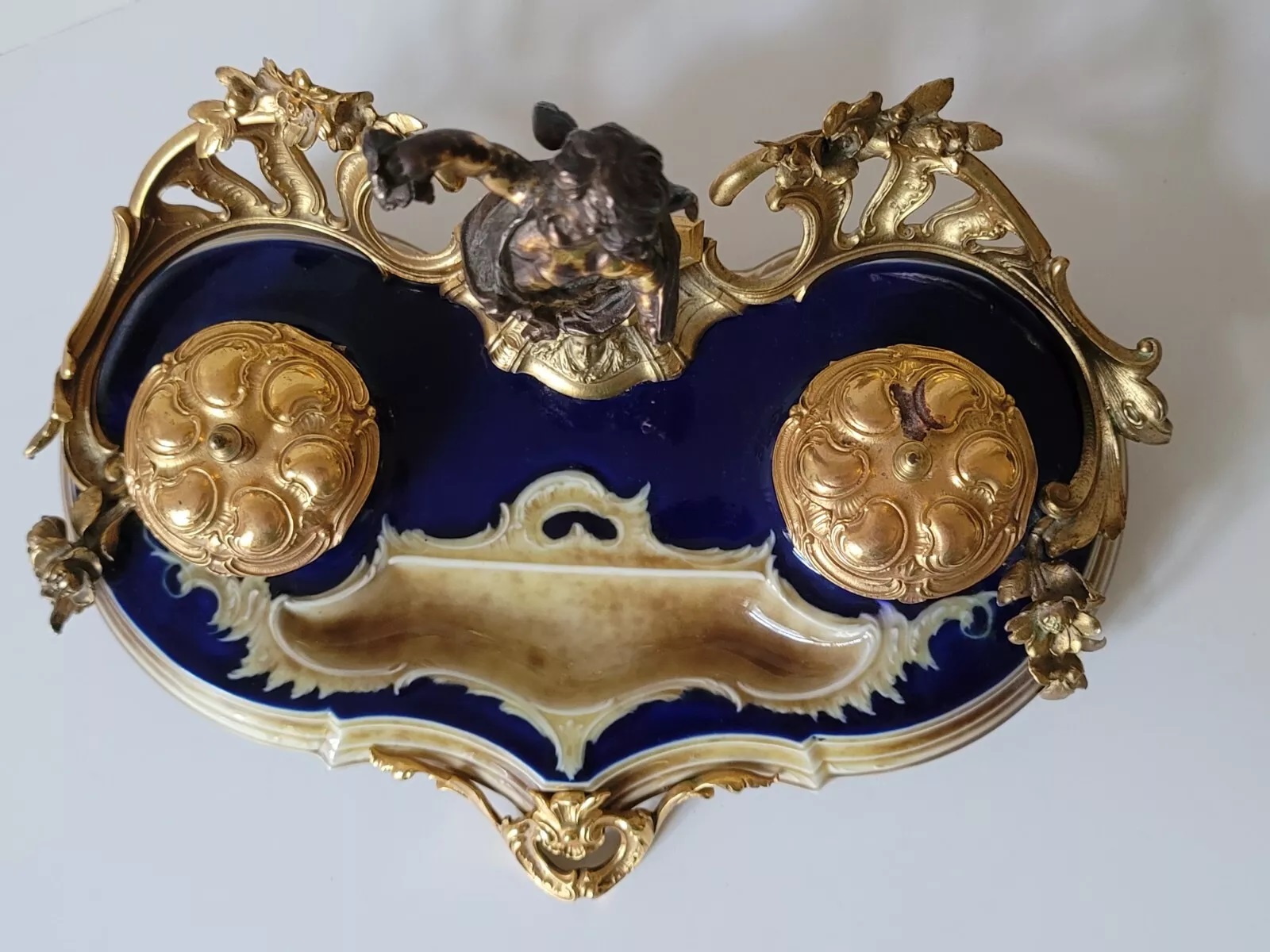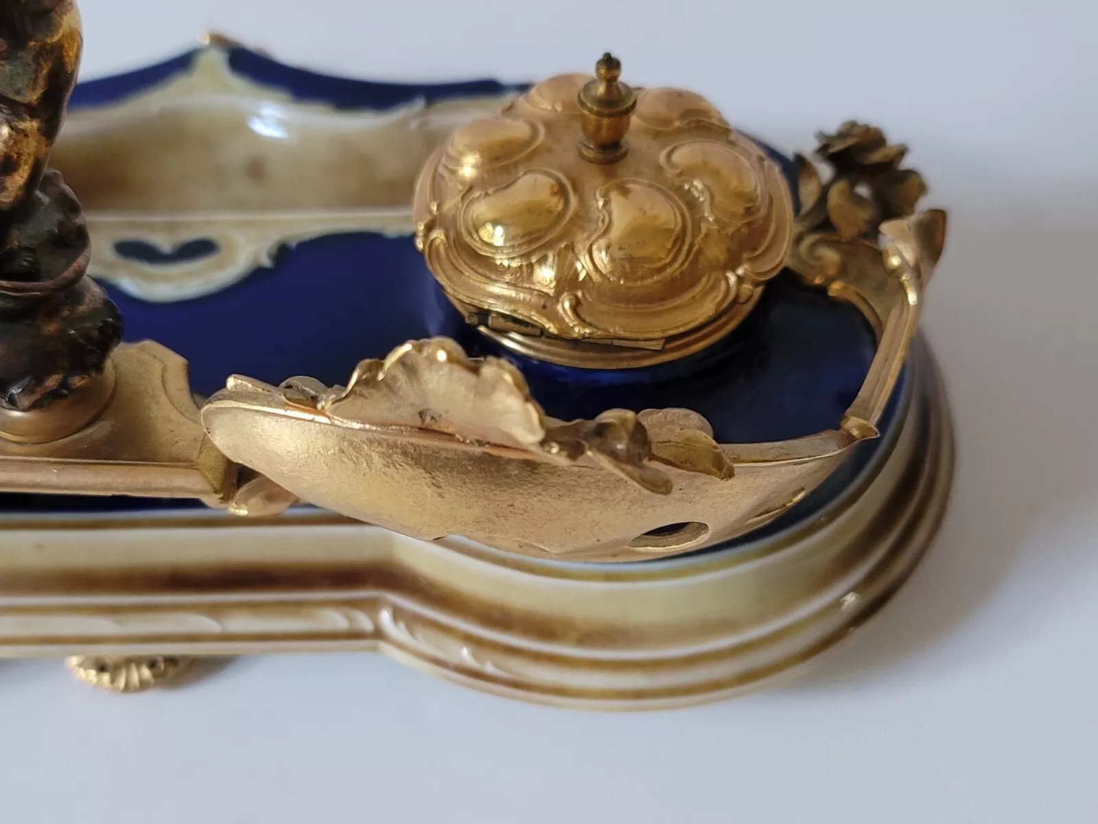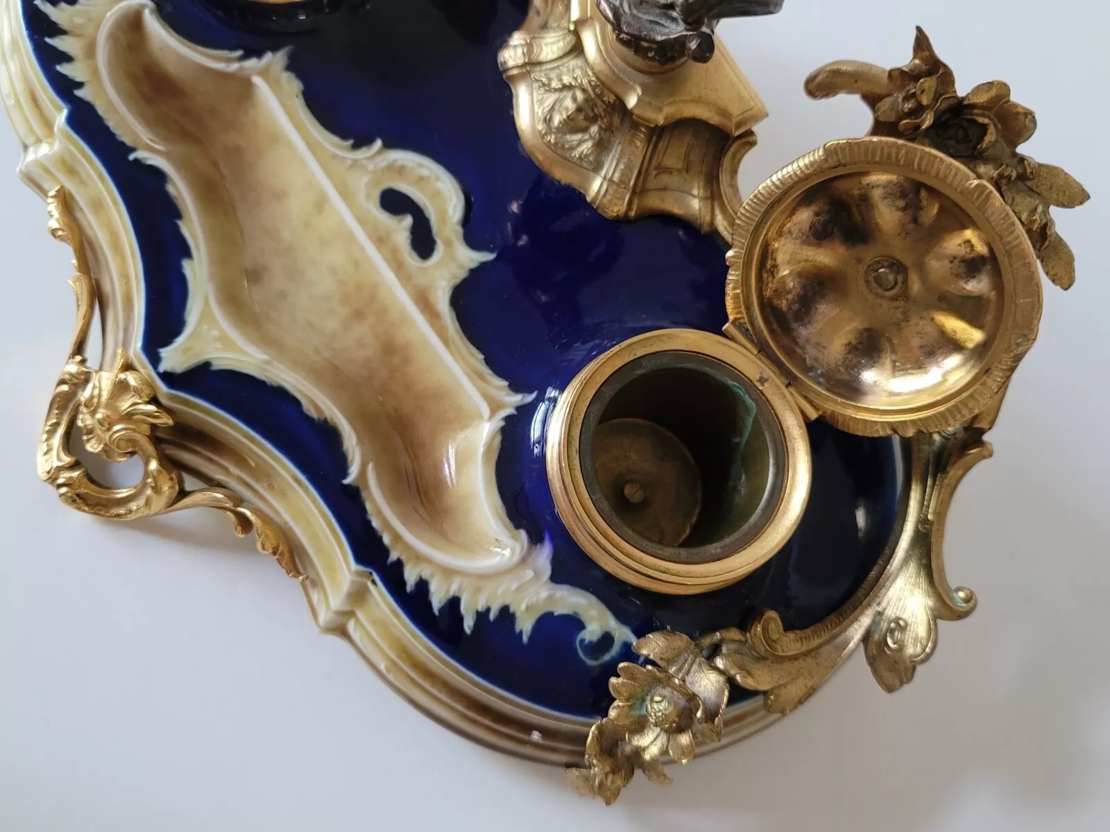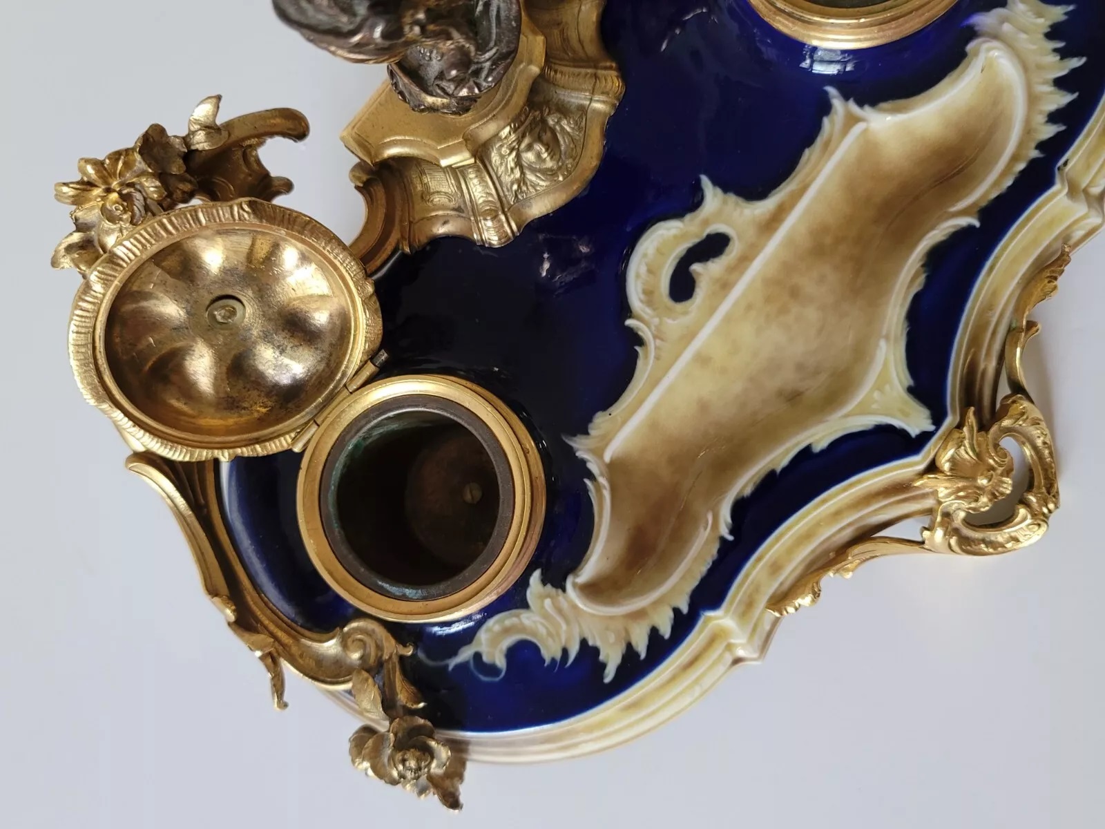 This double inkstand was produced by the Königliche Porzellan-Manufaktur Berlin (KPM). The base is made of dark blue majolica, adorned with rich gilt bronze ormolu mounts. The central figure is a winged cherub, or Putto, holding grapes, surrounded by ornate scrollwork and acanthus leaf motifs typical of the Rococo style. It includes two covered inkwells with decorated lids. The base is marked with the royal scepter symbol, indicating its production by KPM. The inscription “S gr. P” beneath the scepter tells us this was made in 1882 or later. Additionally, the numbers “3215” and “1D” are impressed into the bottom, likely referencing model numbers or inventory identifiers.