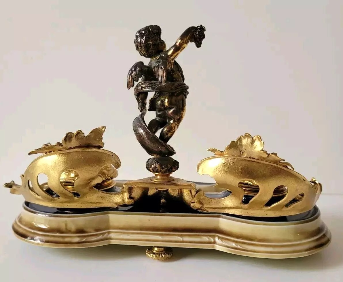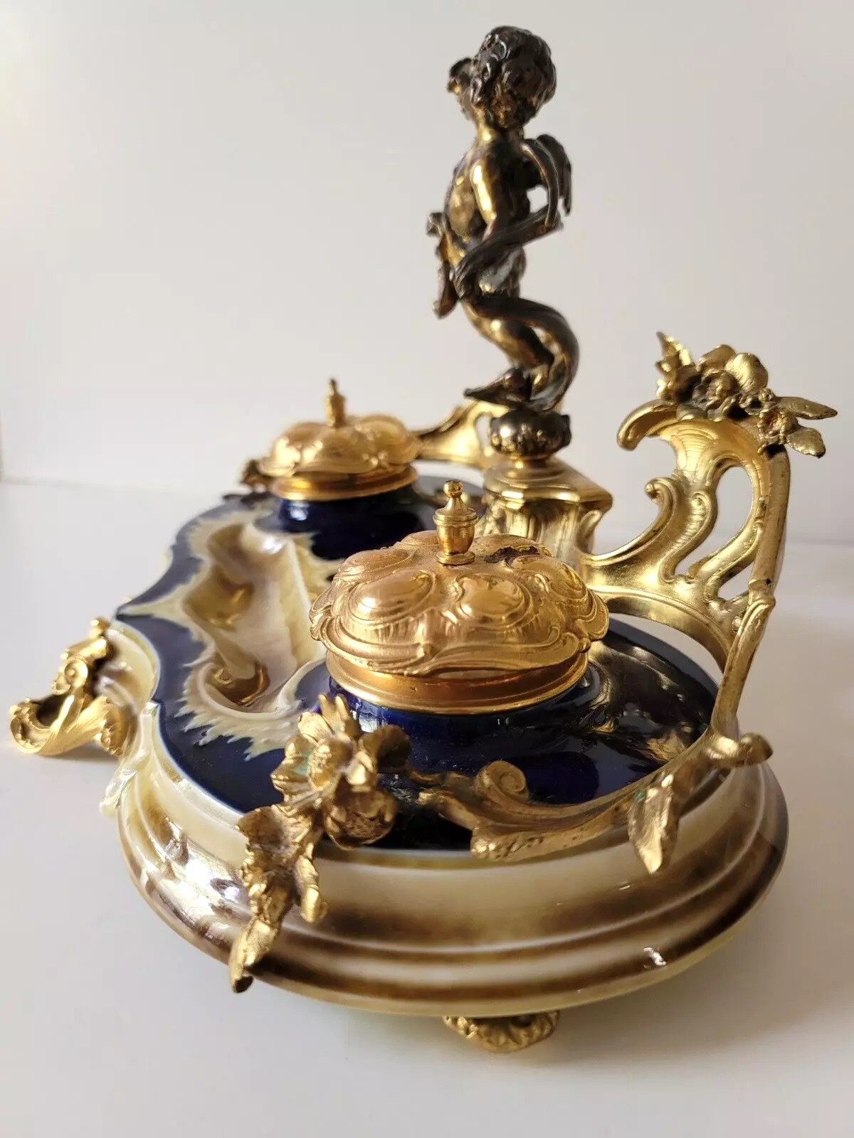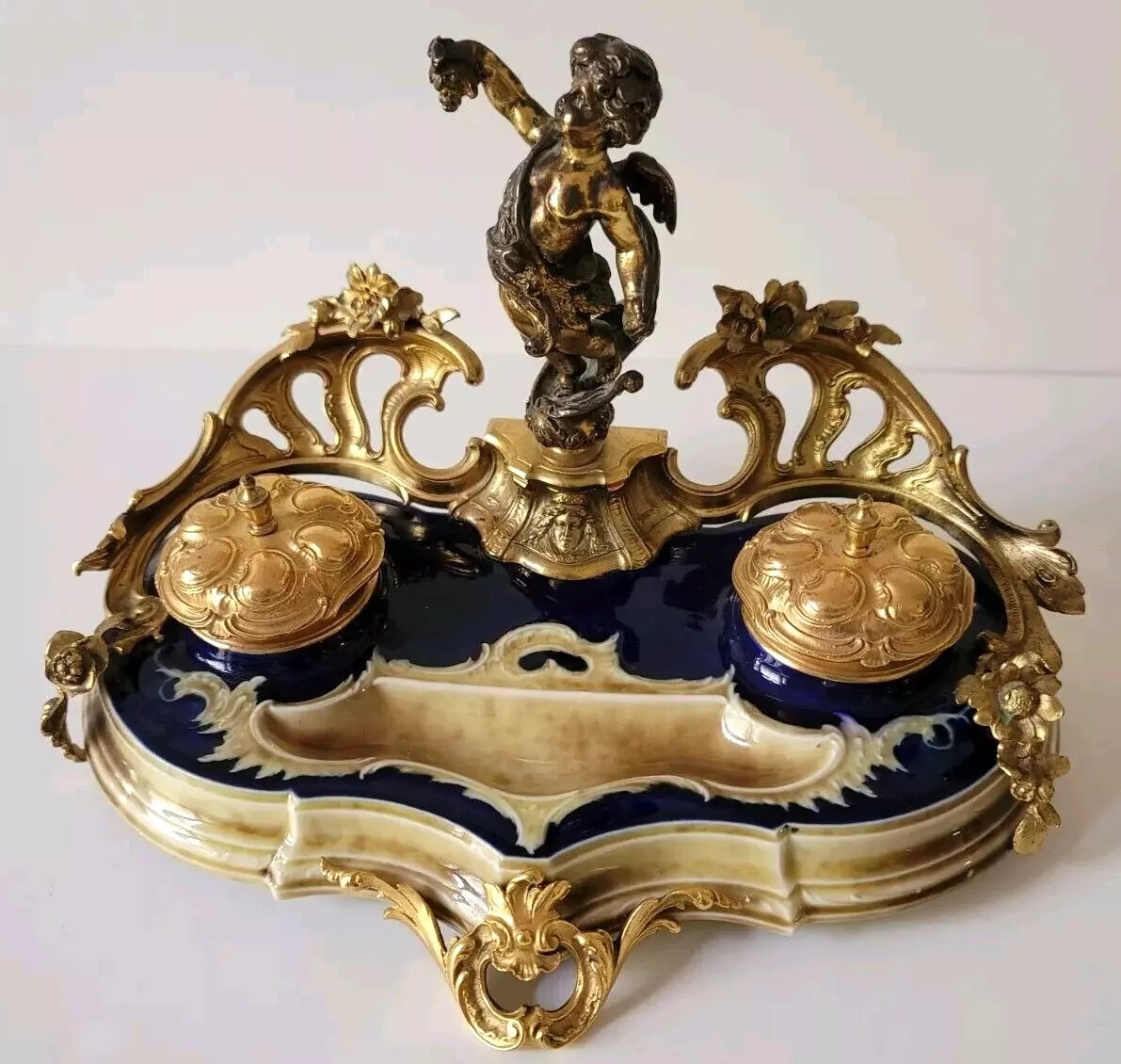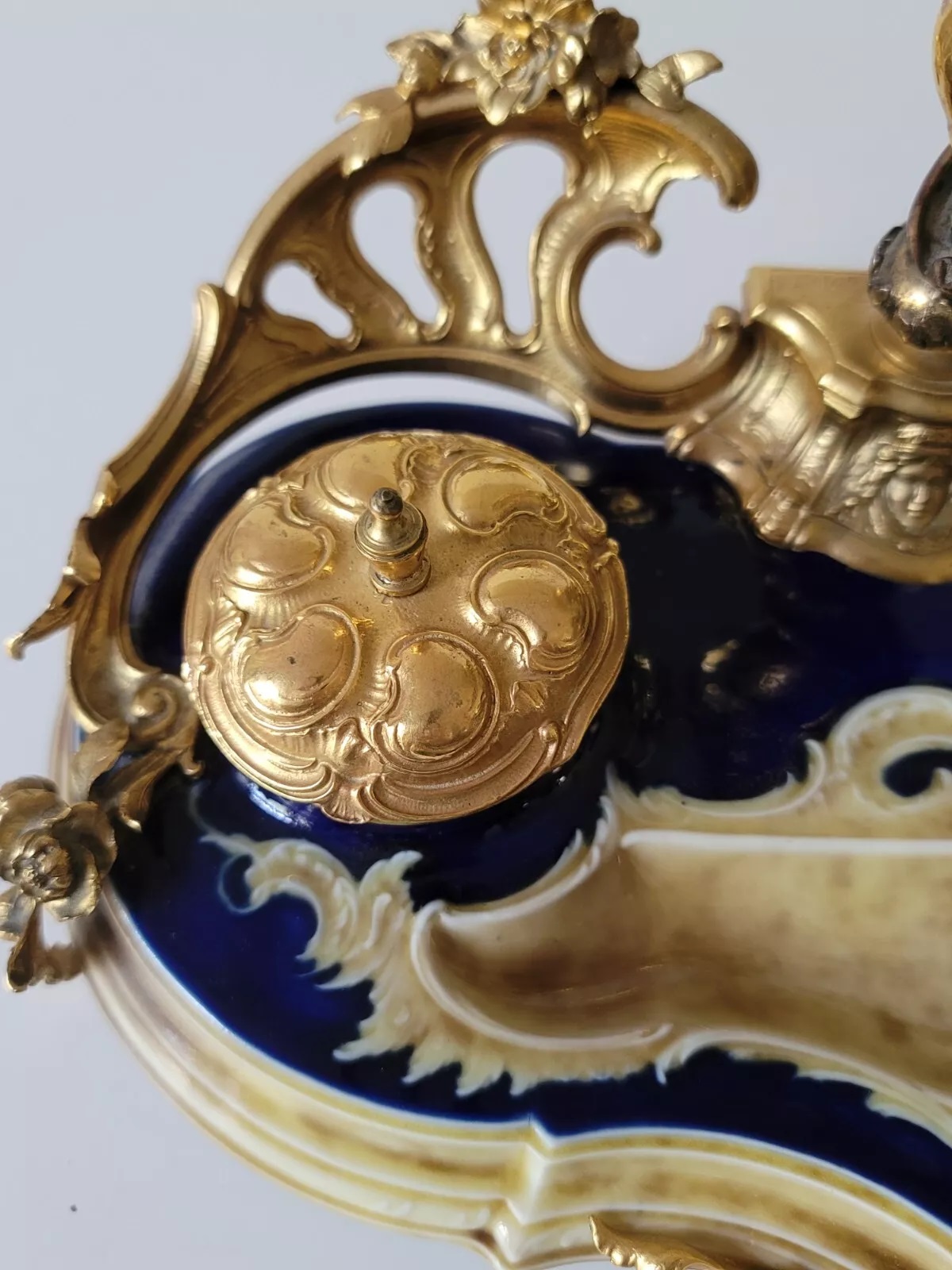 This double inkstand was produced by the Königliche Porzellan-Manufaktur Berlin (KPM). The base is made of dark blue majolica, adorned with rich gilt bronze ormolu mounts. The central figure is a winged cherub, or Putto, holding grapes, surrounded by ornate scrollwork and acanthus leaf motifs typical of the Rococo style. It includes two covered inkwells with decorated lids. The base is marked with the royal scepter symbol, indicating its production by KPM. The inscription “S gr. P” beneath the scepter tells us this was made in 1882 or later. Additionally, the numbers “3215” and “1D” are impressed into the bottom, likely referencing model numbers or inventory identifiers.