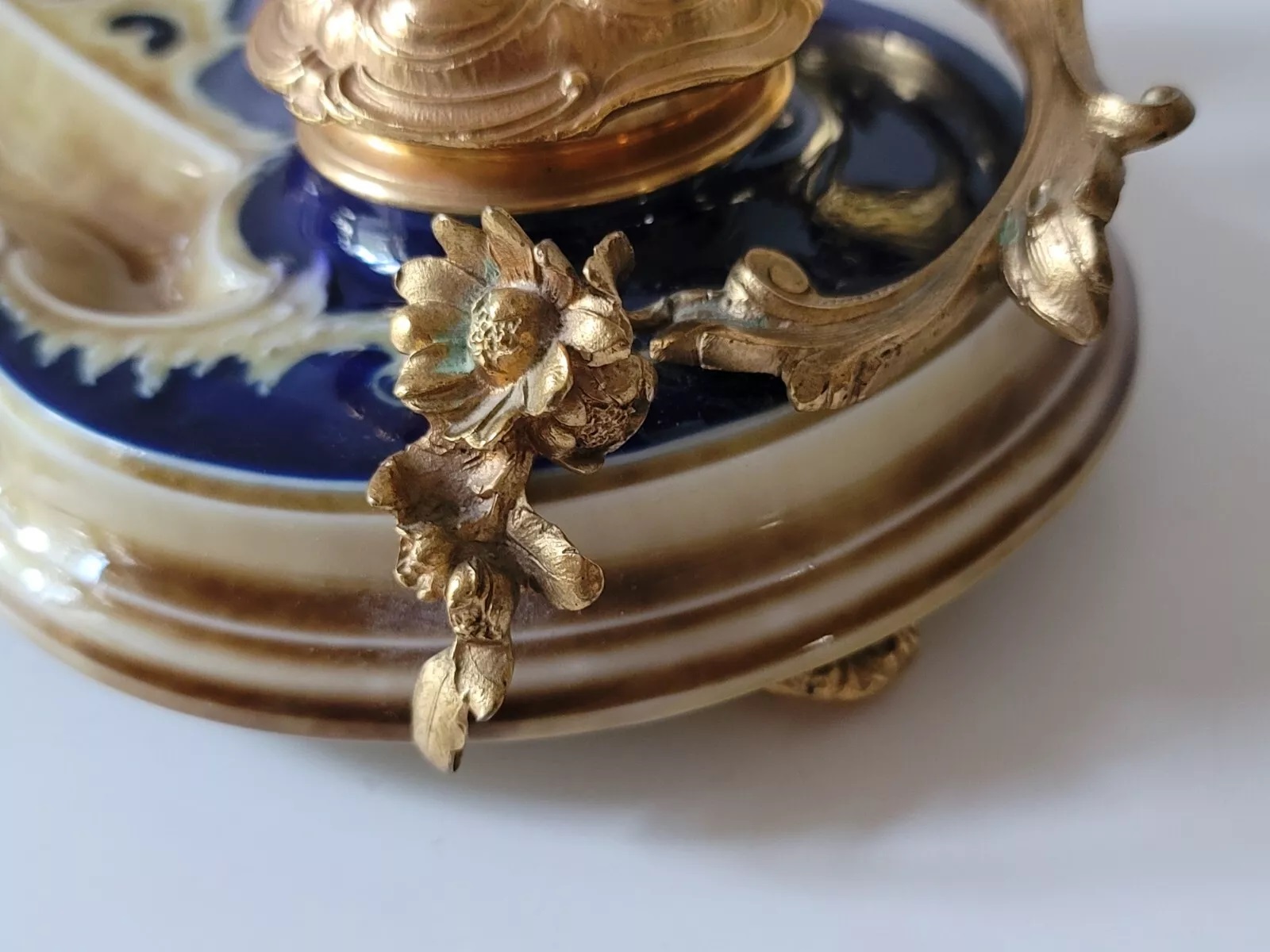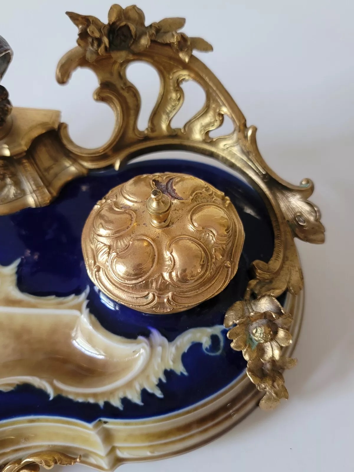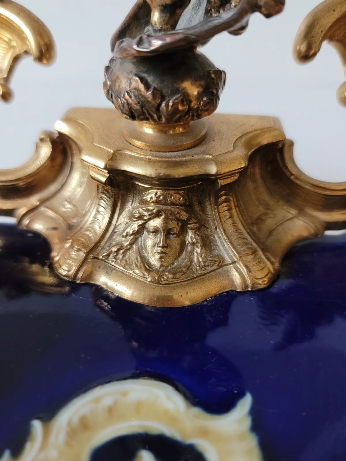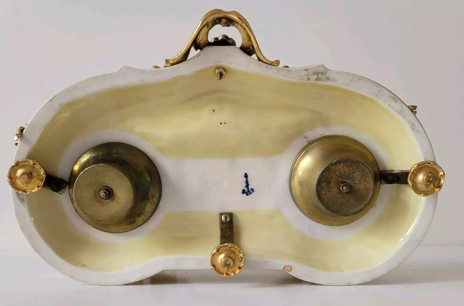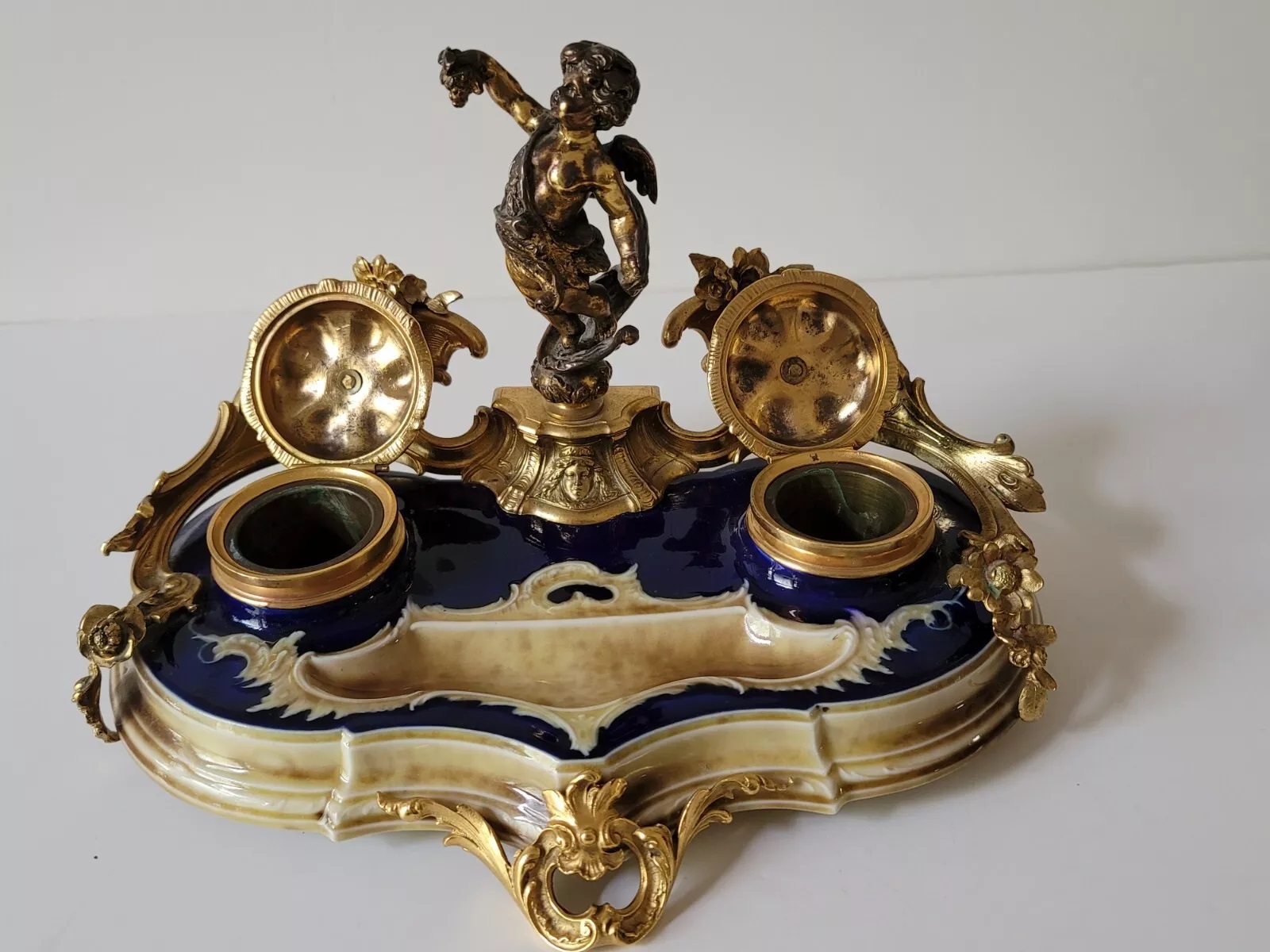 This double inkstand was produced by the Königliche Porzellan-Manufaktur Berlin (KPM). The base is made of dark blue majolica, adorned with rich gilt bronze ormolu mounts. The central figure is a winged cherub, or Putto, holding grapes, surrounded by ornate scrollwork and acanthus leaf motifs typical of the Rococo style. It includes two covered inkwells with decorated lids. The base is marked with the royal scepter symbol, indicating its production by KPM. The inscription “S gr. P” beneath the scepter tells us this was made in 1882 or later. Additionally, the numbers “3215” and “1D” are impressed into the bottom, likely referencing model numbers or inventory identifiers.