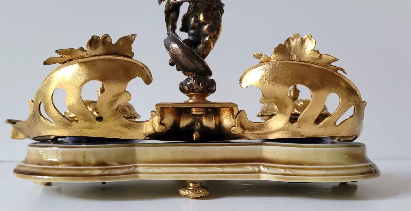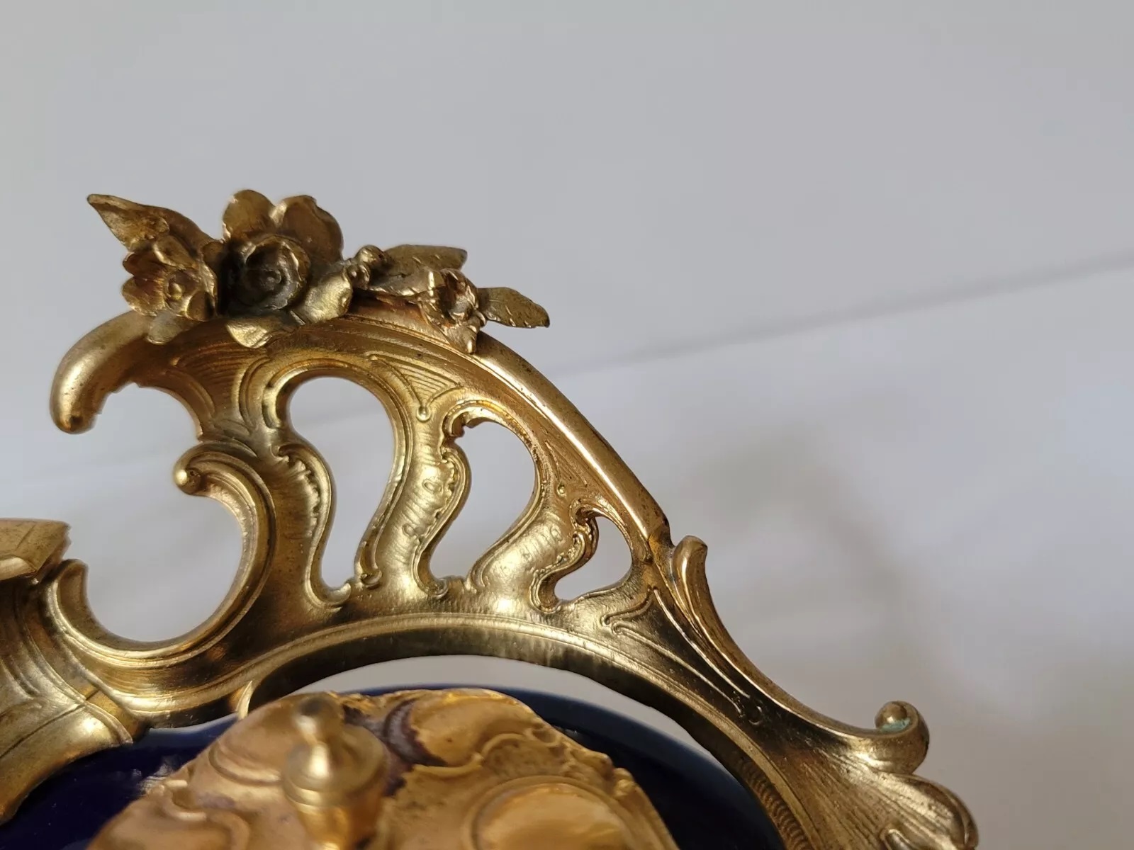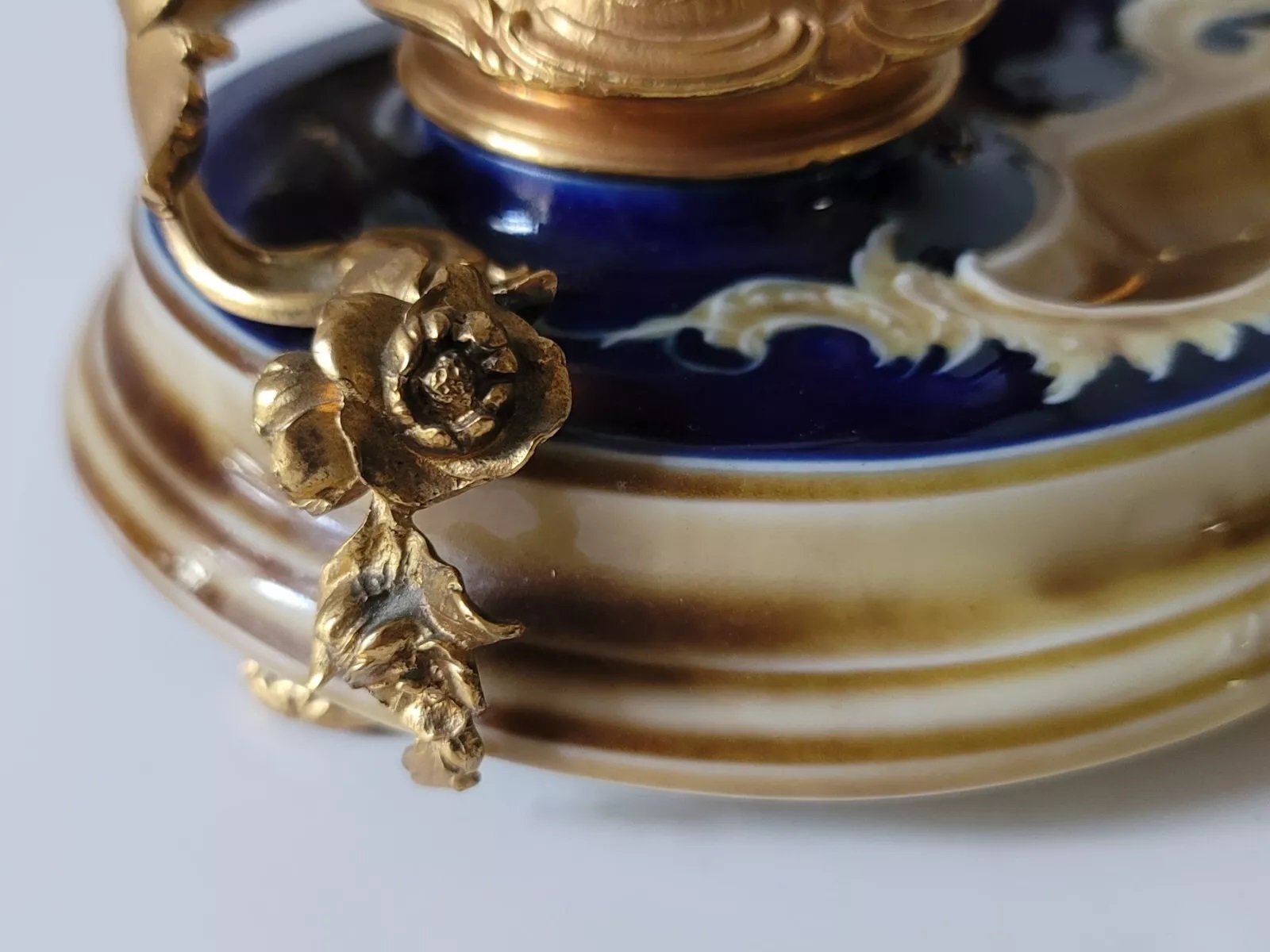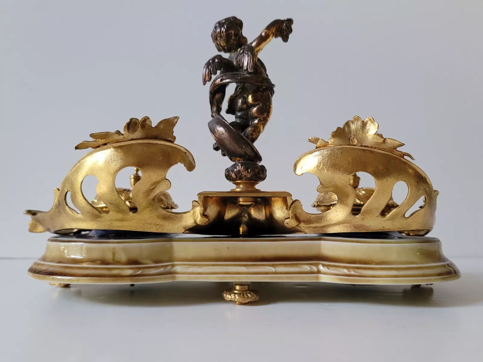 This double inkstand was produced by the Königliche Porzellan-Manufaktur Berlin (KPM). The base is made of dark blue majolica, adorned with rich gilt bronze ormolu mounts. The central figure is a winged cherub, or Putto, holding grapes, surrounded by ornate scrollwork and acanthus leaf motifs typical of the Rococo style. It includes two covered inkwells with decorated lids. The base is marked with the royal scepter symbol, indicating its production by KPM. The inscription “S gr. P” beneath the scepter tells us this was made in 1882 or later. Additionally, the numbers “3215” and “1D” are impressed into the bottom, likely referencing model numbers or inventory identifiers.