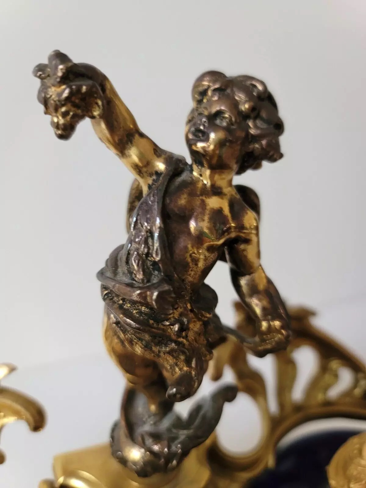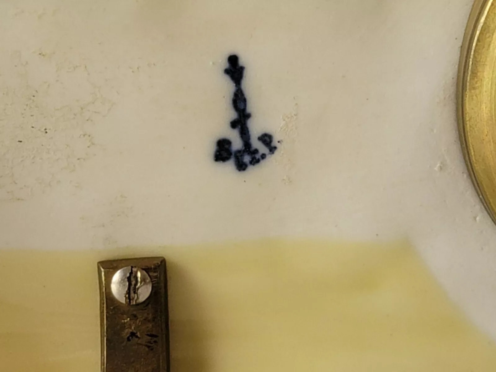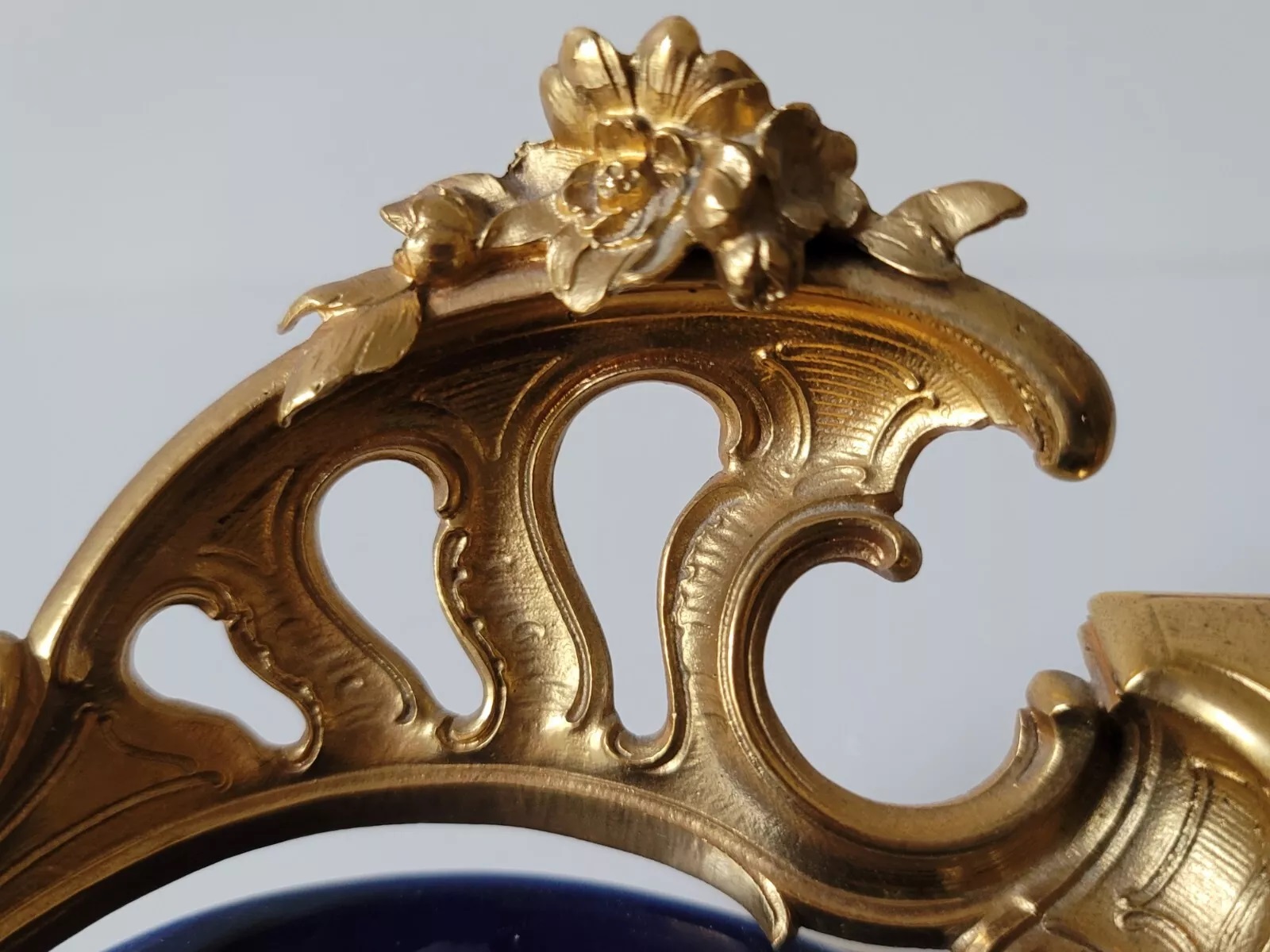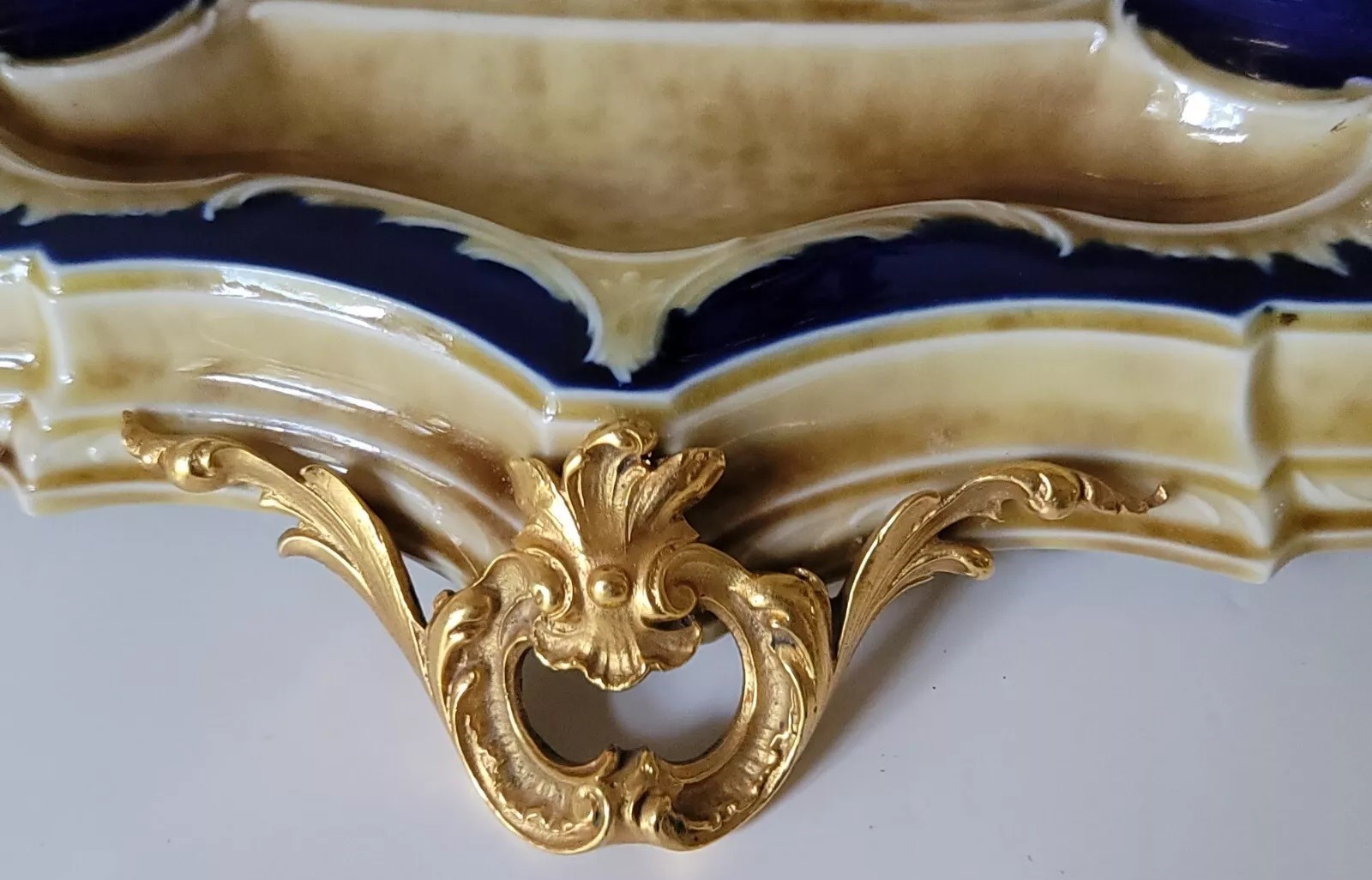 This double inkstand was produced by the Königliche Porzellan-Manufaktur Berlin (KPM). The base is made of dark blue majolica, adorned with rich gilt bronze ormolu mounts. The central figure is a winged cherub, or Putto, holding grapes, surrounded by ornate scrollwork and acanthus leaf motifs typical of the Rococo style. It includes two covered inkwells with decorated lids. The base is marked with the royal scepter symbol, indicating its production by KPM. The inscription “S gr. P” beneath the scepter tells us this was made in 1882 or later. Additionally, the numbers “3215” and “1D” are impressed into the bottom, likely referencing model numbers or inventory identifiers.