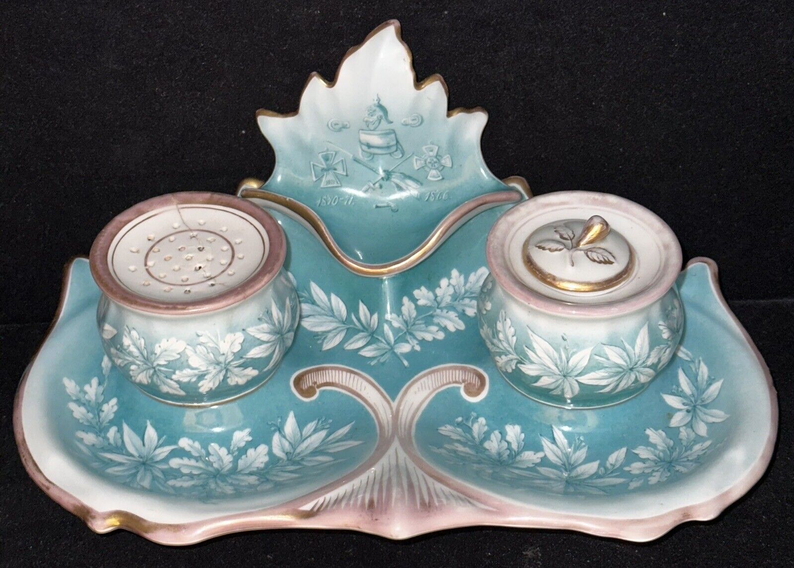 A teal or aqua blue tray with scalloped edges and delicate white floral patterns holds an inkwell and a sander. The back of the tray features an ornate raised backstop with military decorations: a pickelhaube helmet, military badges, crossed swords, a revolver, a knapsack, and the dates of Prussian wars.
