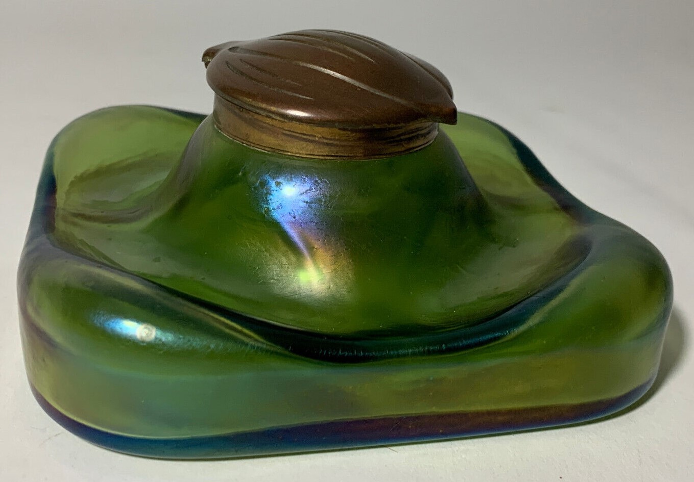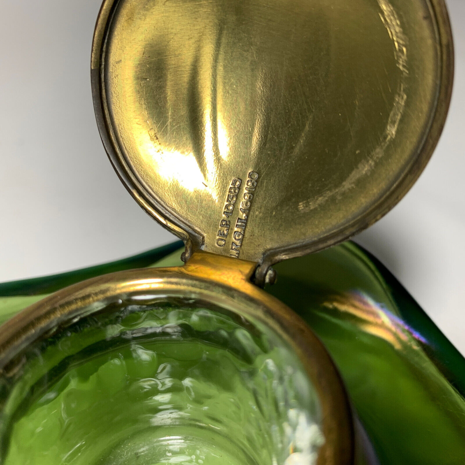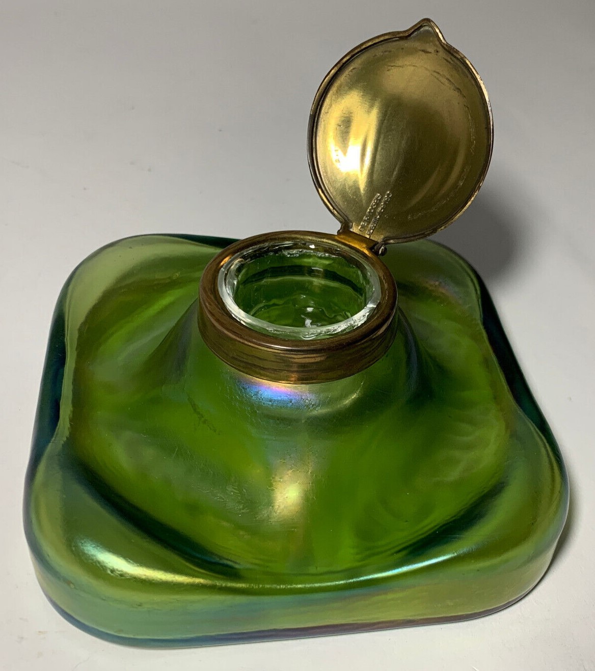 Green iridescent, square-form with a drip-catcher body, this art glass inkwell has a hinged stylized leaf lid and glass insert. Marked on the lid’s underside: “D.E.P. 10585; D.R.G.M. 168180”.
