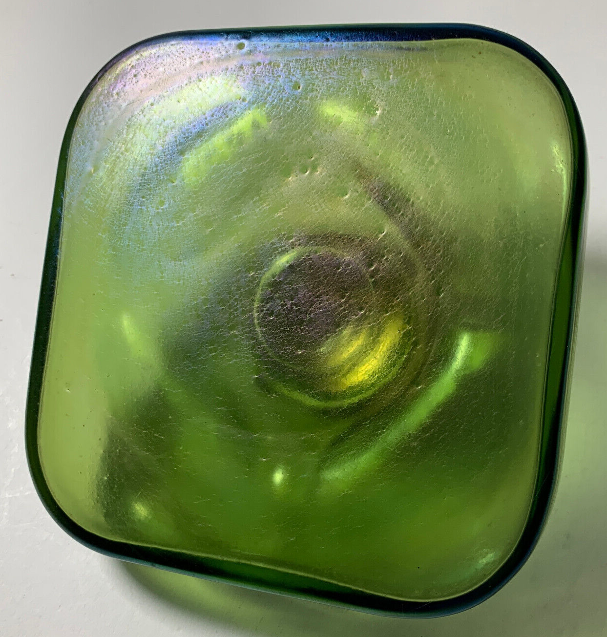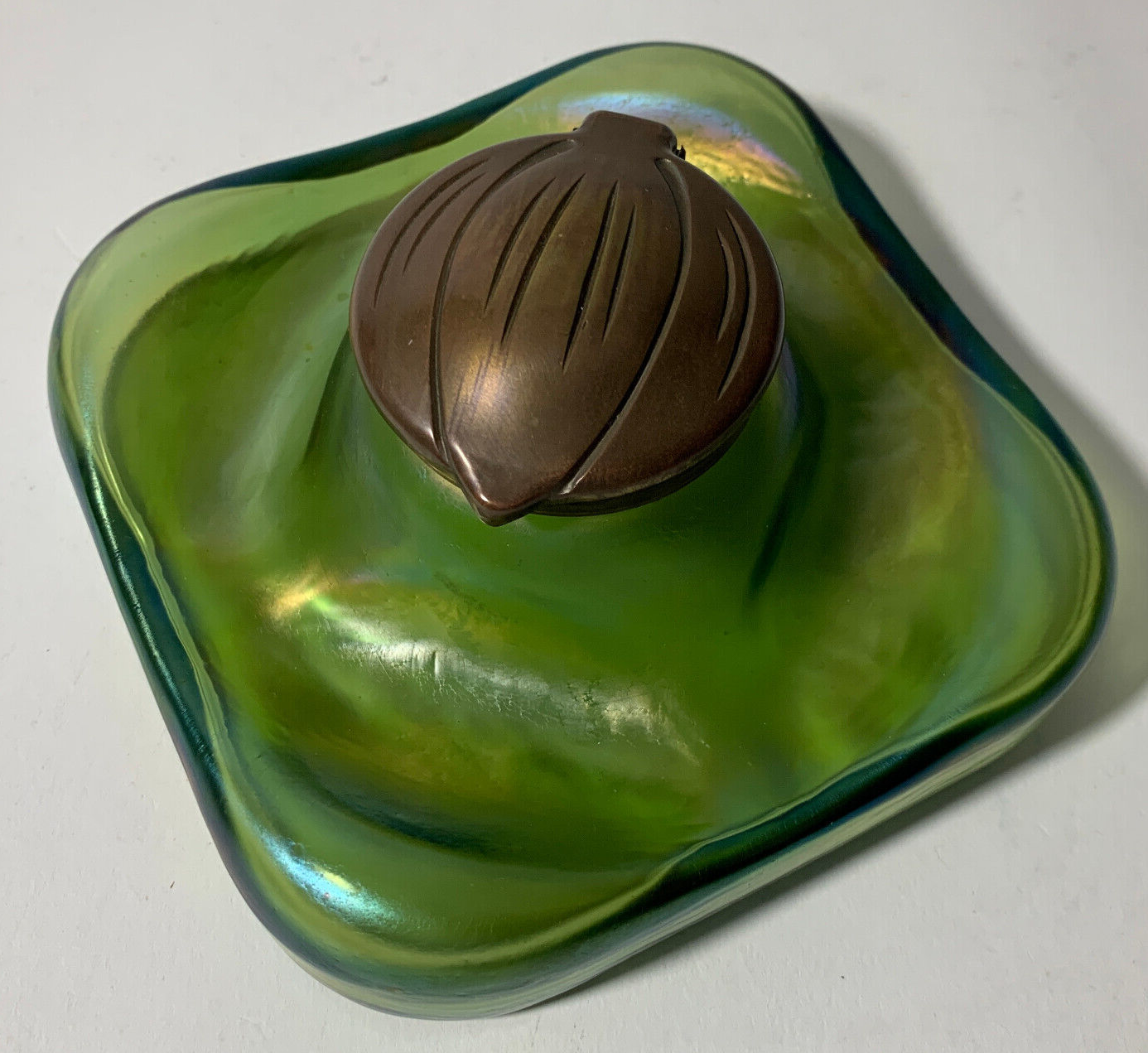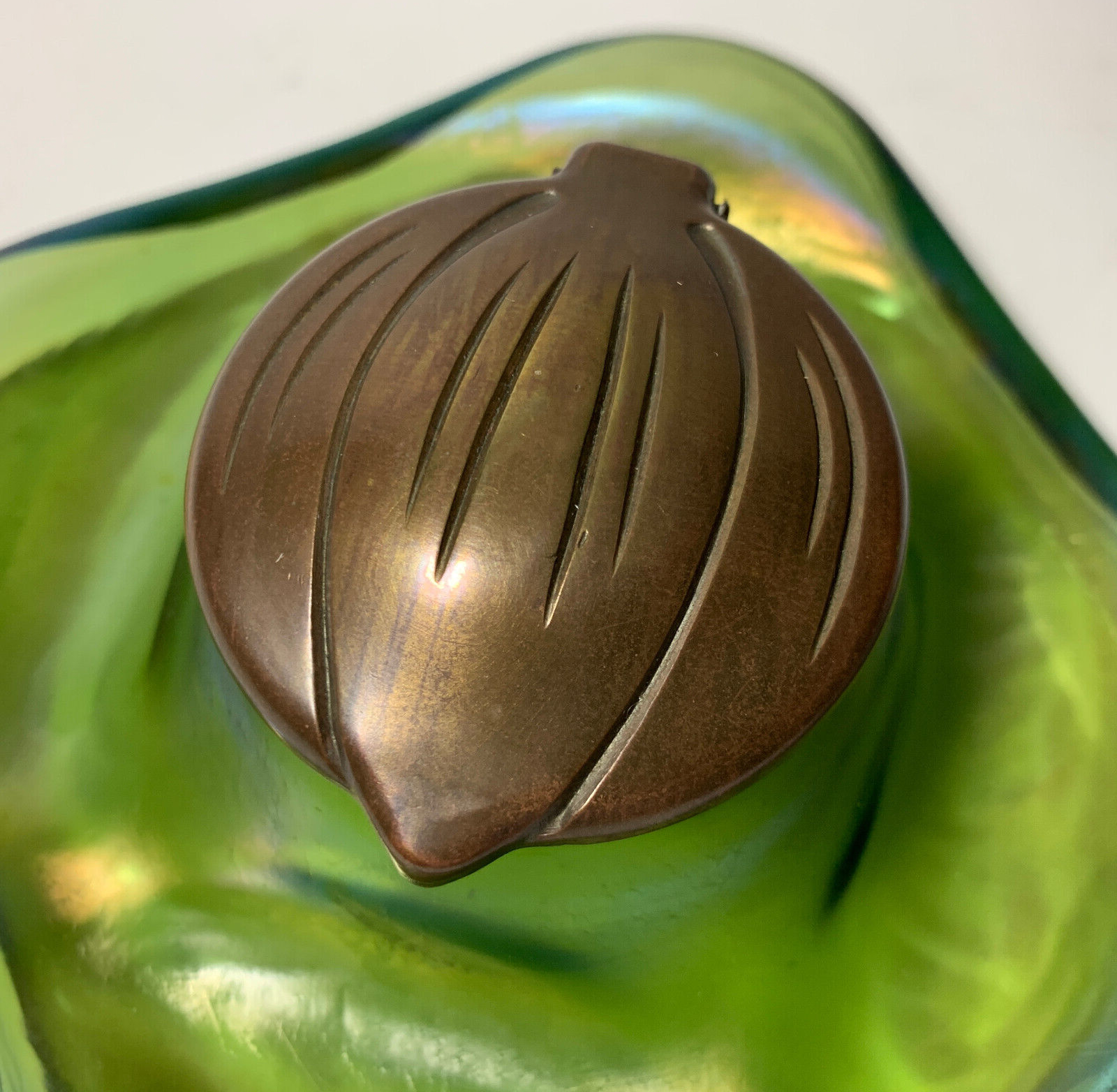 Green iridescent, square-form with a drip-catcher body, this art glass inkwell has a hinged stylized leaf lid and glass insert. Marked on the lid’s underside: “D.E.P. 10585; D.R.G.M. 168180”.