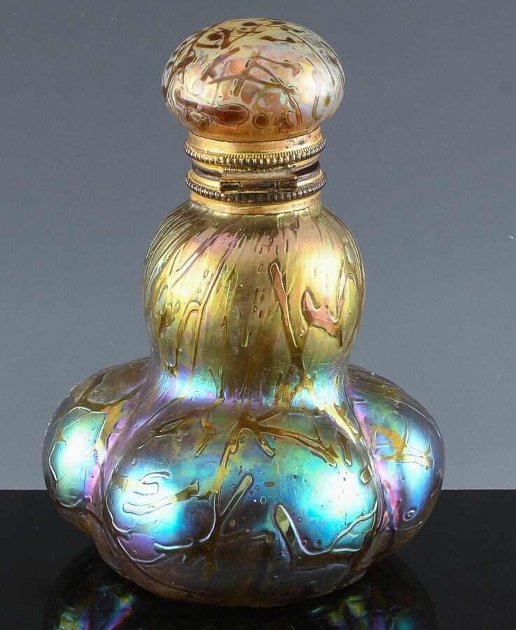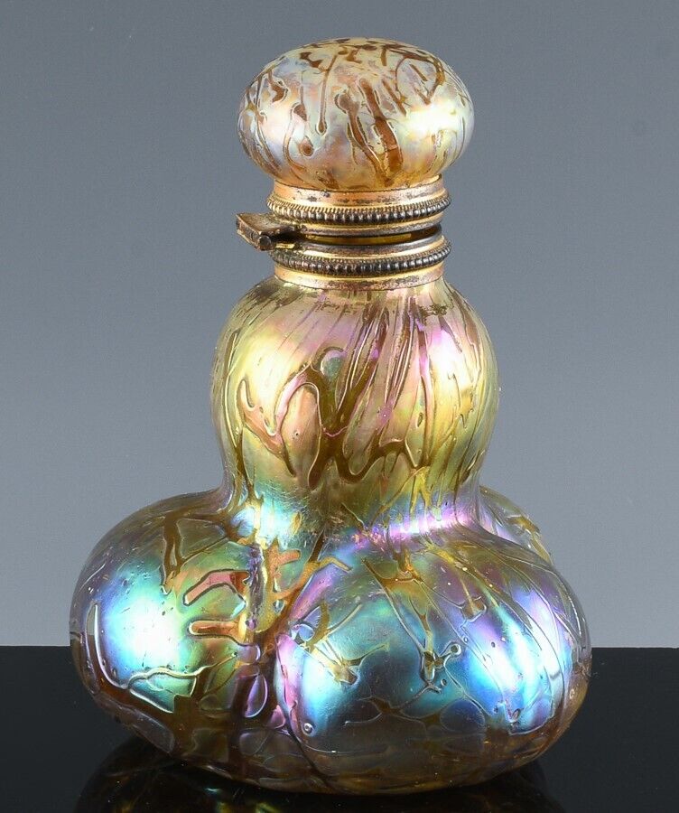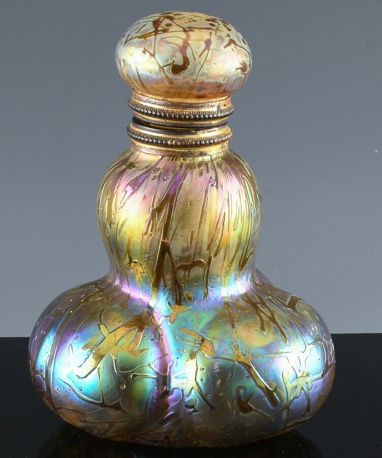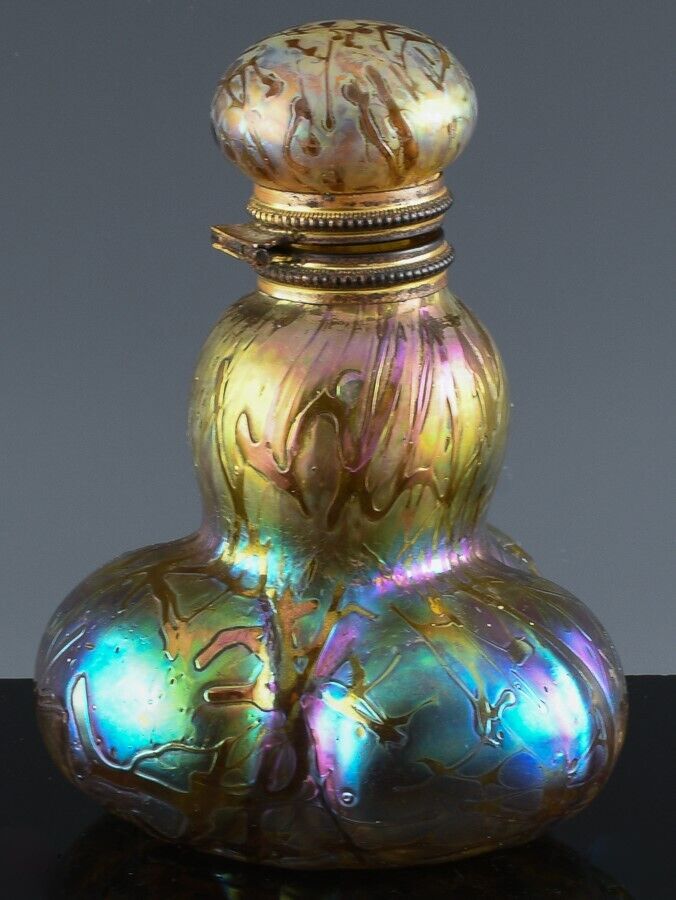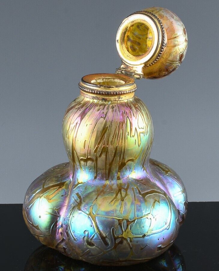 This hand-blown art glass inkwell was made by Kralik and is from their Bacillus line. This form and lid are seldom seen in Kralik pieces. The glass is a deep amber color with great iridescent coloring throughout.