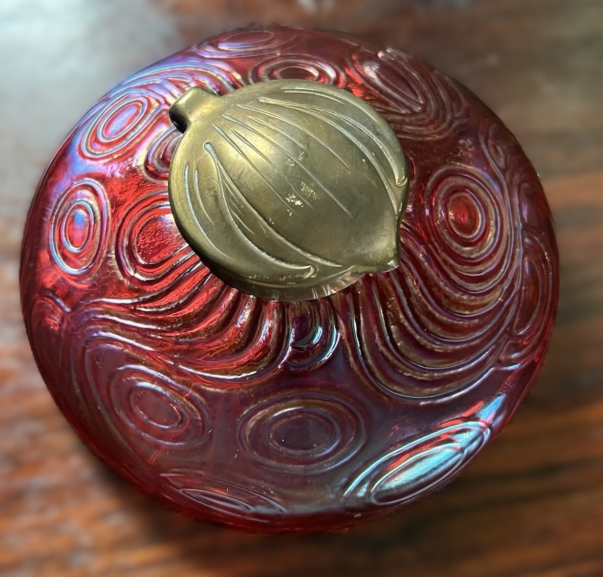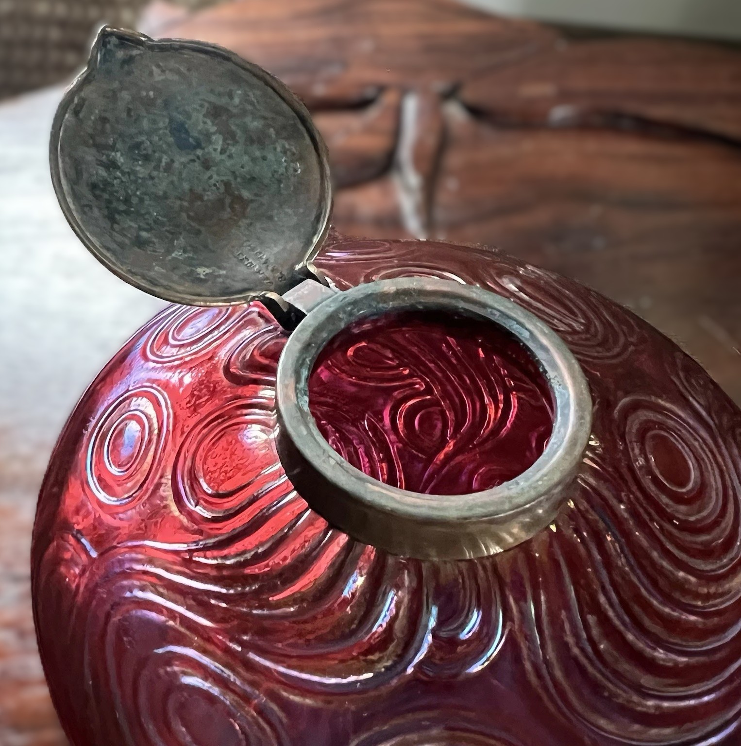 Iridescent green glass inkwell made by Wilhelm Kralik Söhne, a renowned Bohemian glasswork founded in 1815. The swirling pattern on the glass creates an optical illusion of depth and movement. This design of concentric rings and wavy lines is often associated with “Spiraloptisch,” known for its spiraling designs that appear to change when viewed from different angles.