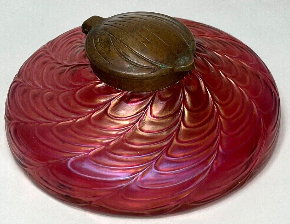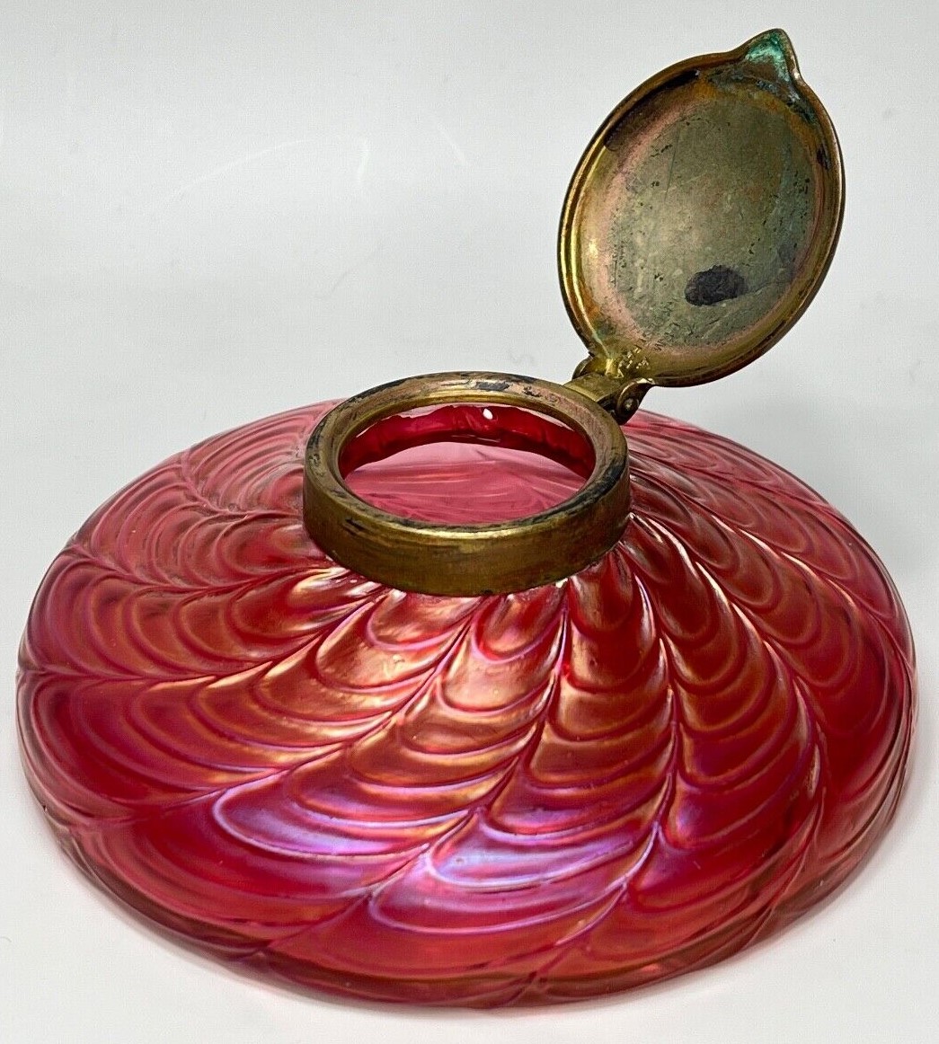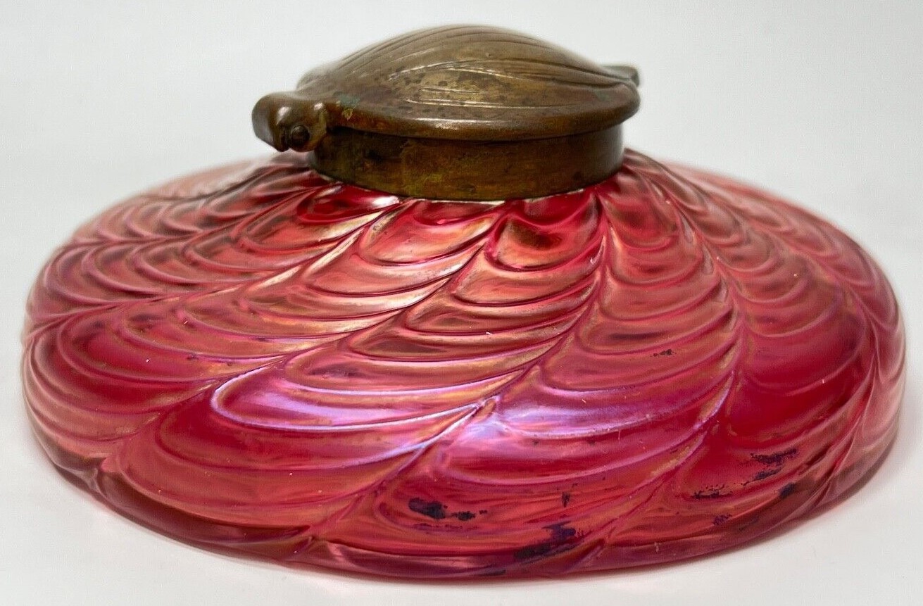 A cranberry-colored art glass inkwell in the “draped” pattern with a light iridescence all over, attributed to Kralik. It has a lotus flower brass lid marked “DGM A KK OEST. PAT”.