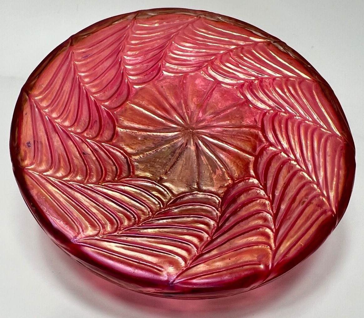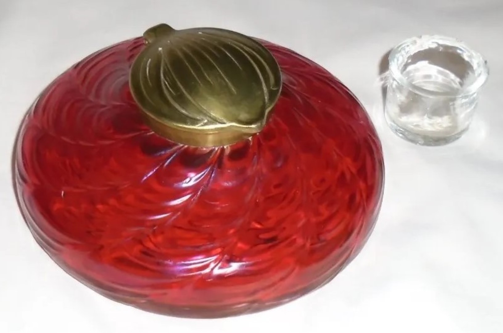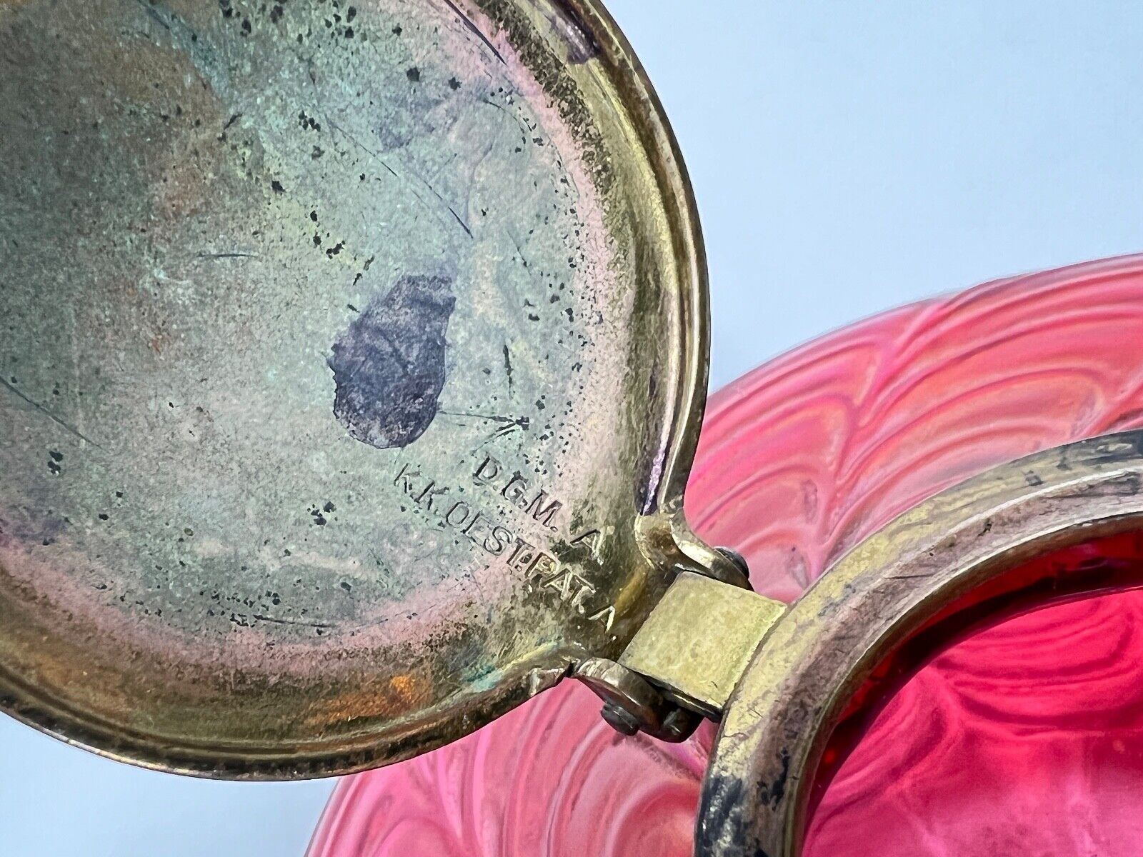 A cranberry-colored art glass inkwell in the “draped” pattern with a light iridescence all over, attributed to Kralik. It has a lotus flower brass lid marked “DGM A KK OEST. PAT”.
