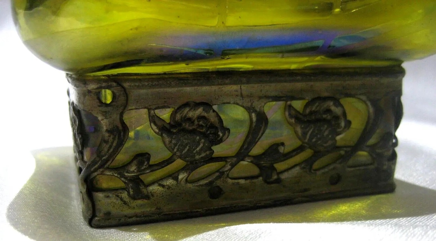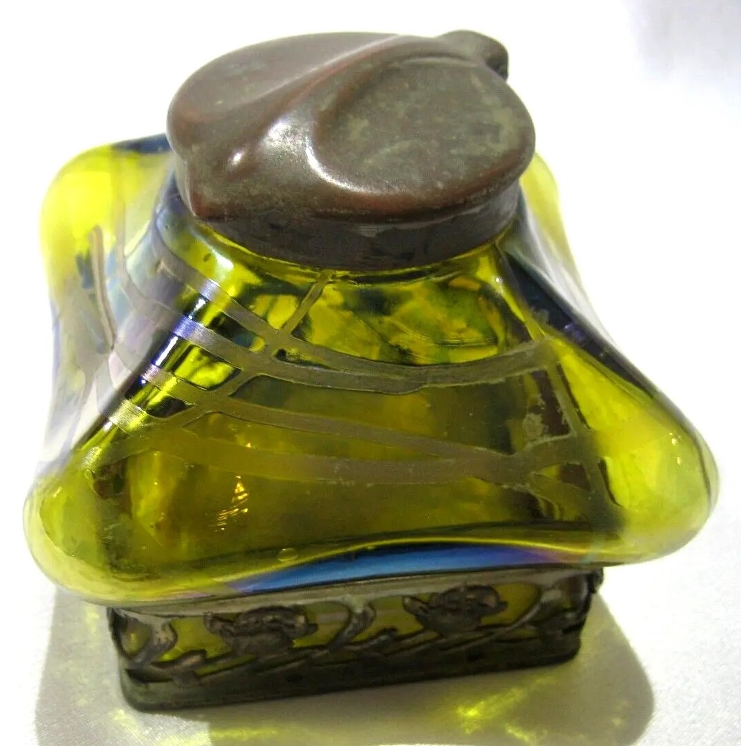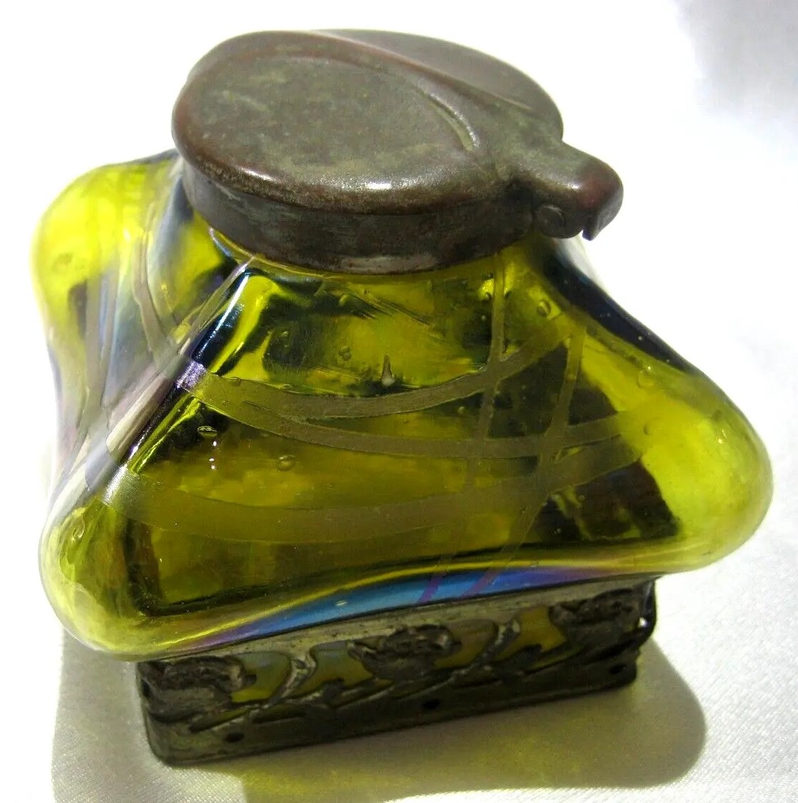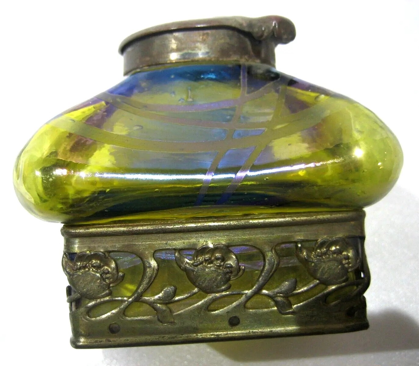 A hand-blown glass inkwell, iridescent yellow with silver threading, rests on a metal filigreed square base.