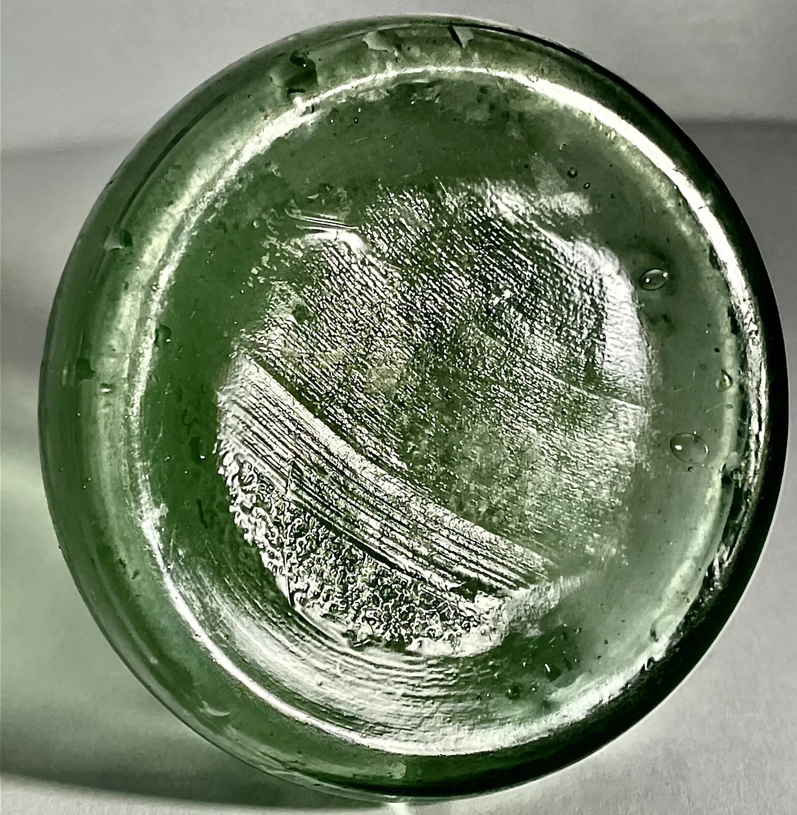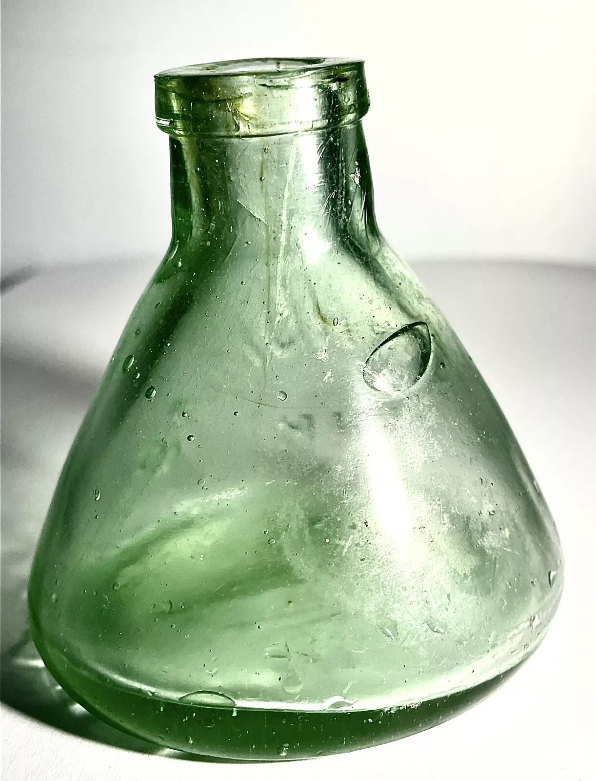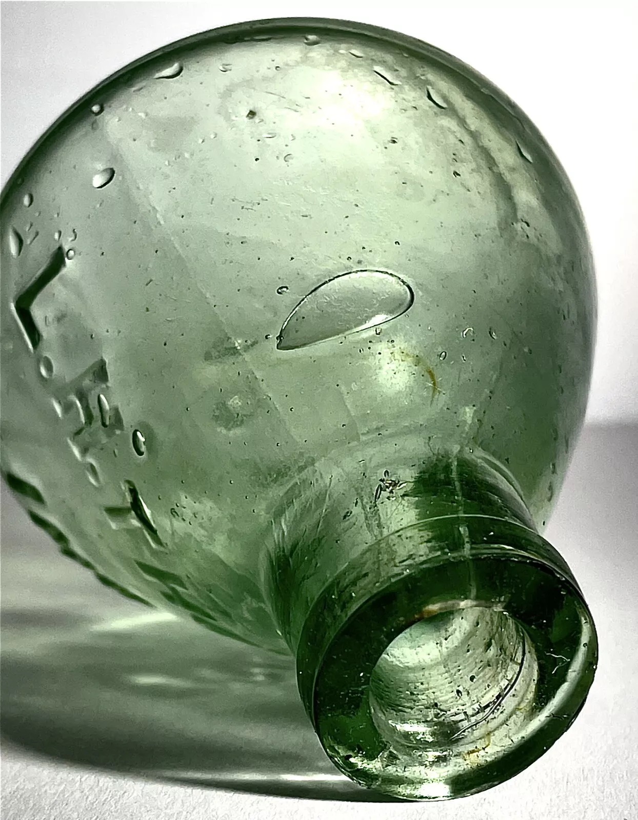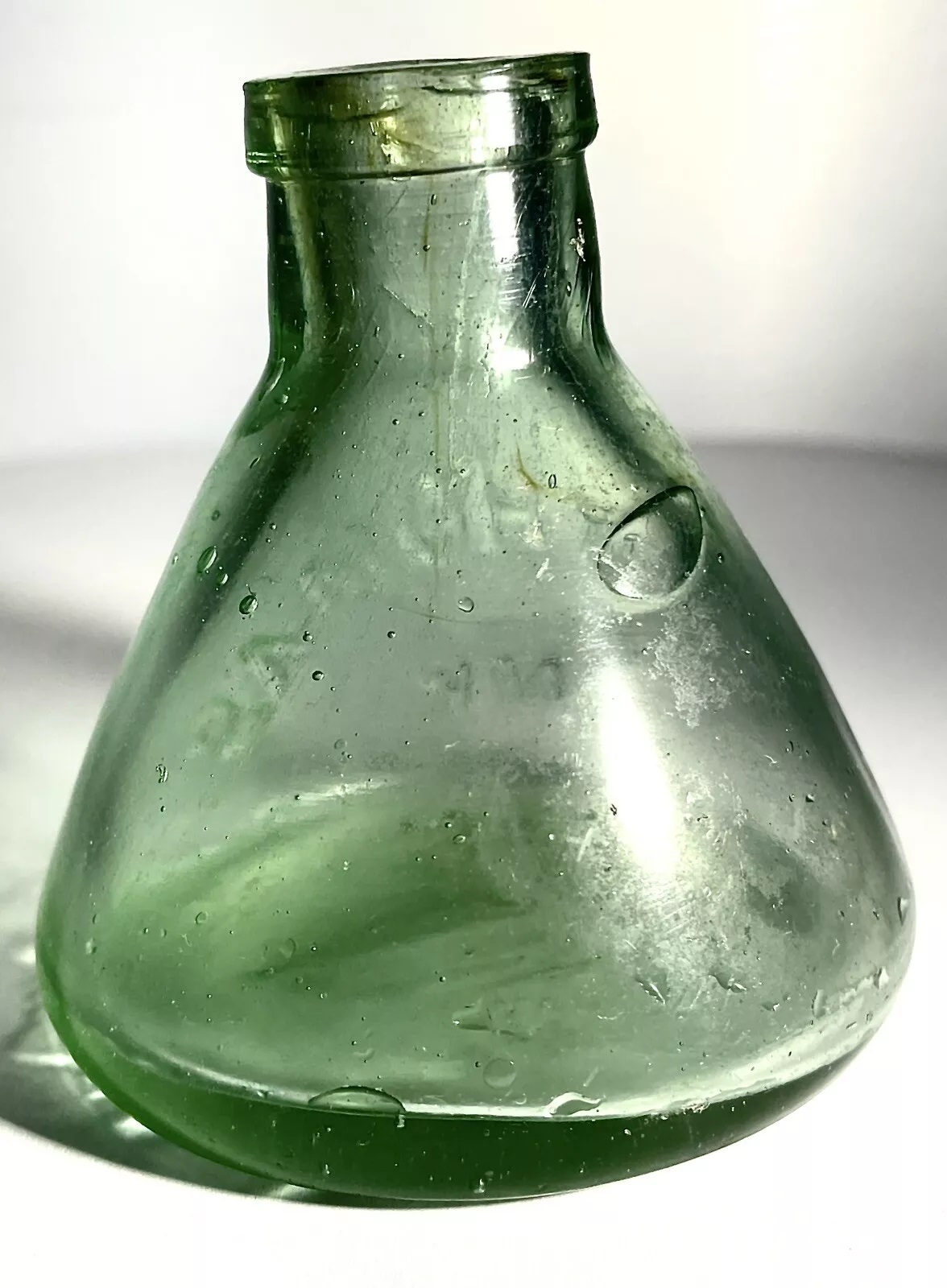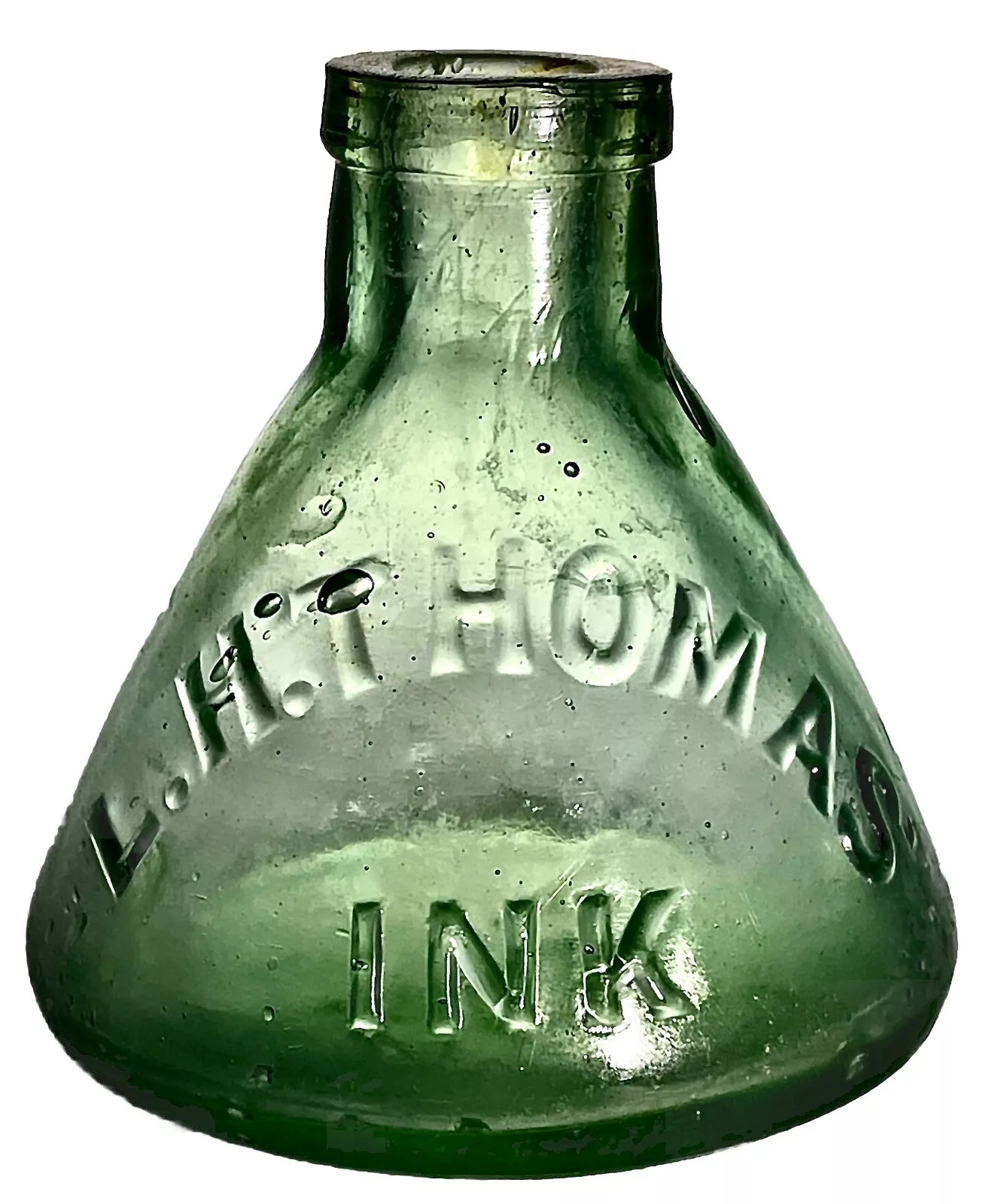 An aqua colored glass ink bottle embossed “L.H. THOMAS INK”.