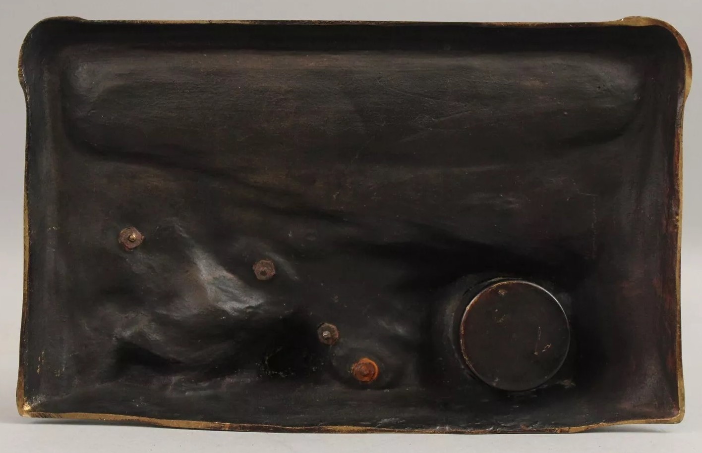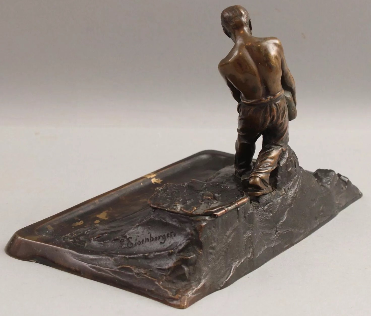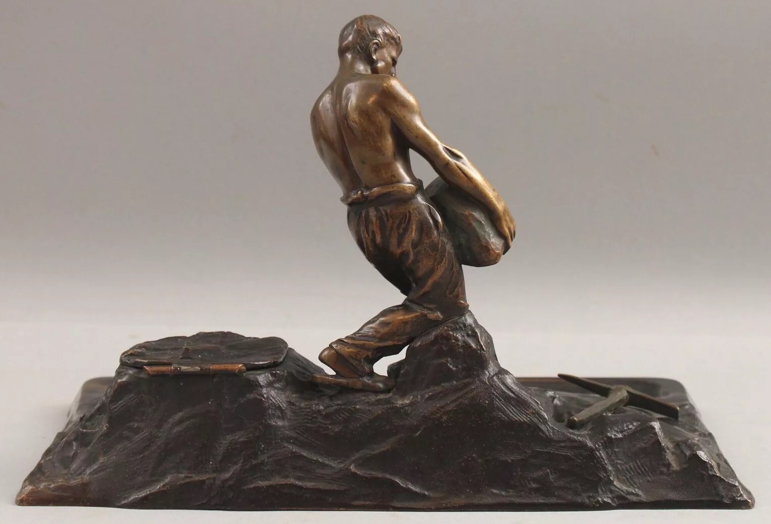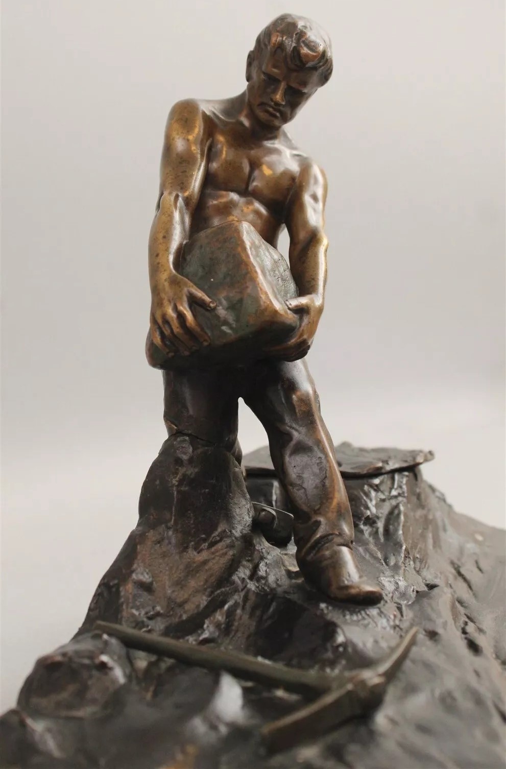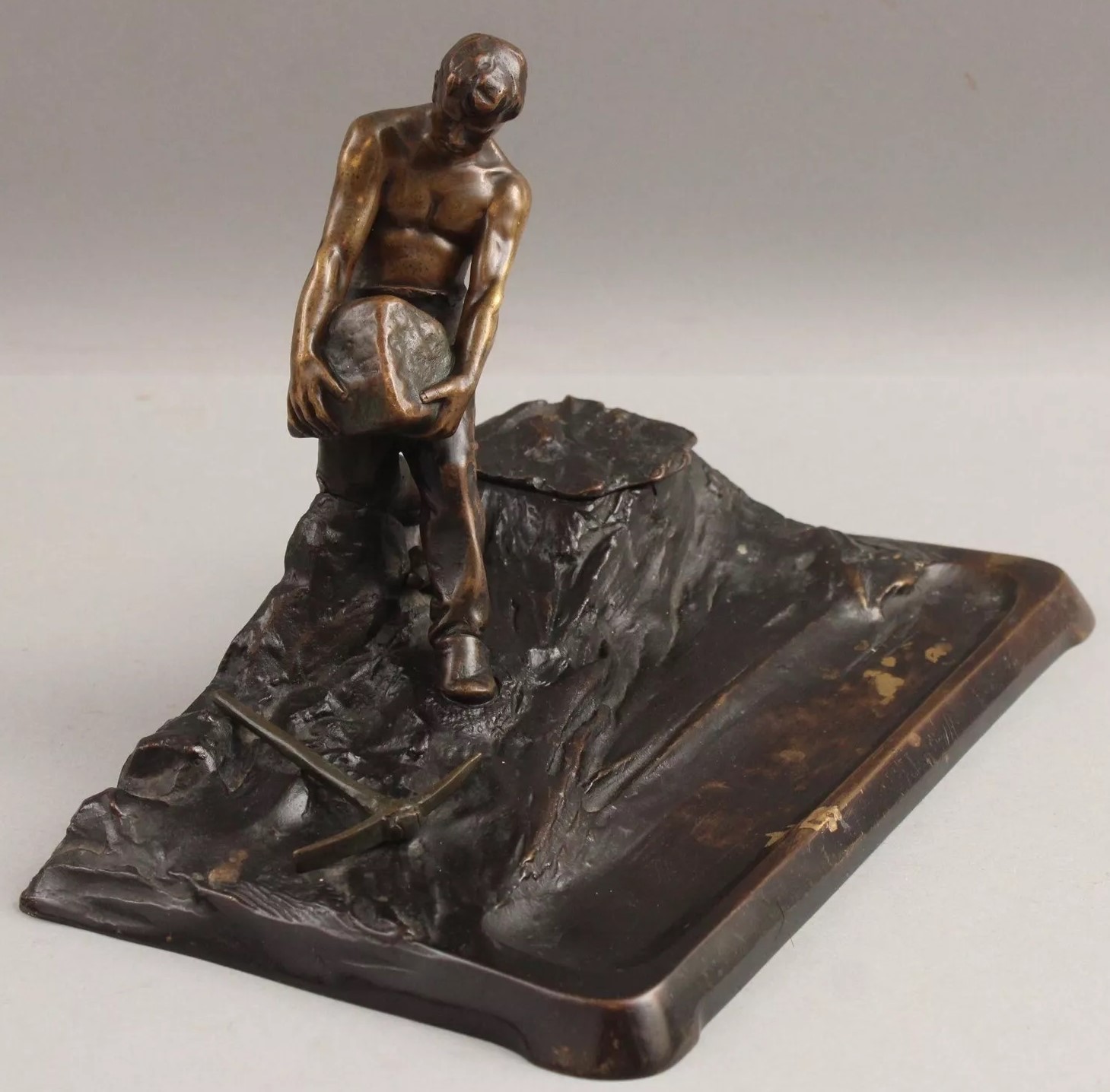 This cast bronze inkstand, sculpted by the German artist Ludwig Eisenberger, depicts a powerful, bare-chested man laboring in a stone quarry. The figure is captured in a dynamic pose, straining to move a massive boulder. At his feet lie a hammer and pickaxe, the tools of his trade. The inkwell is cleverly integrated into the rock formation behind him, while a pen tray is incorporated at the front.