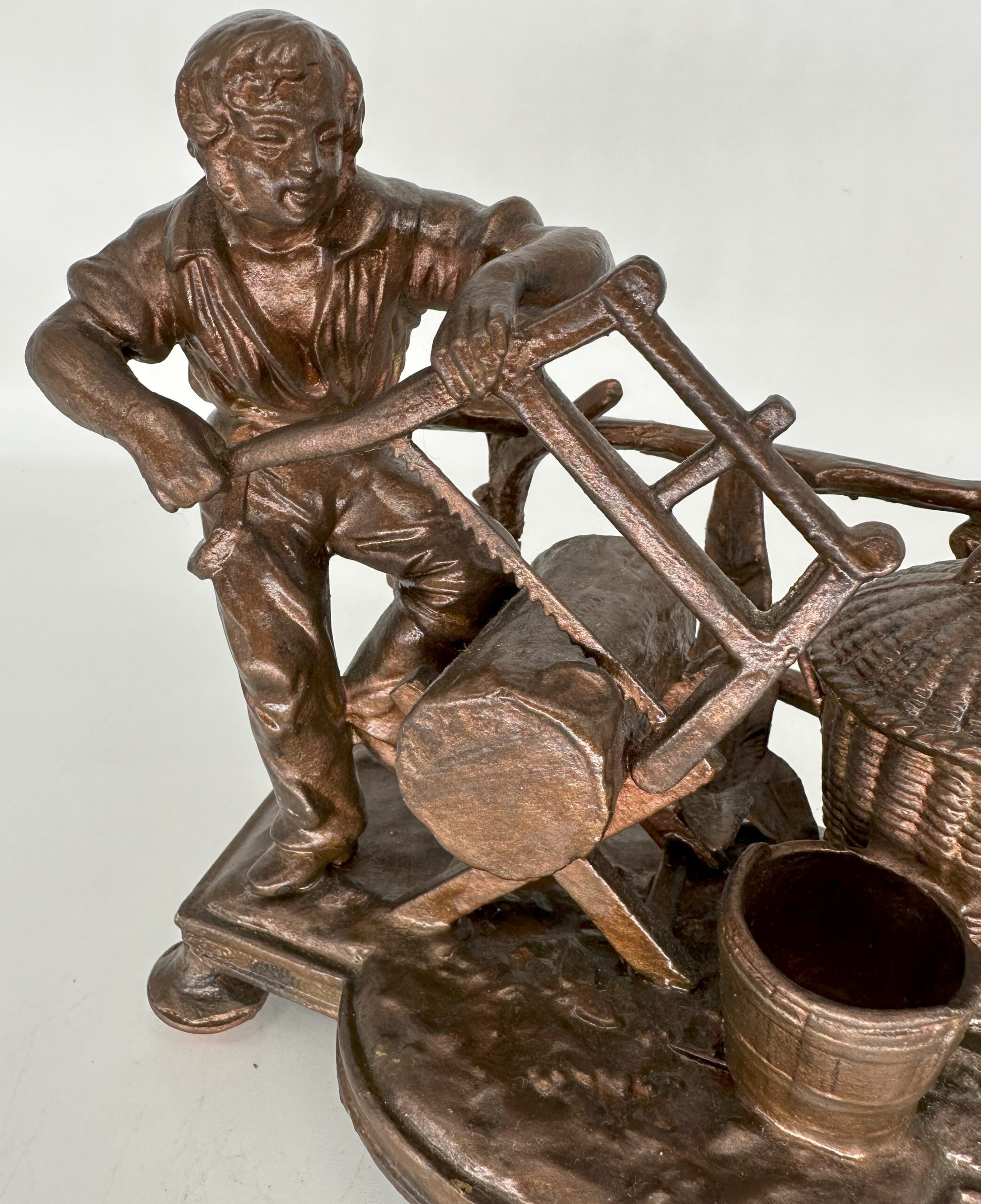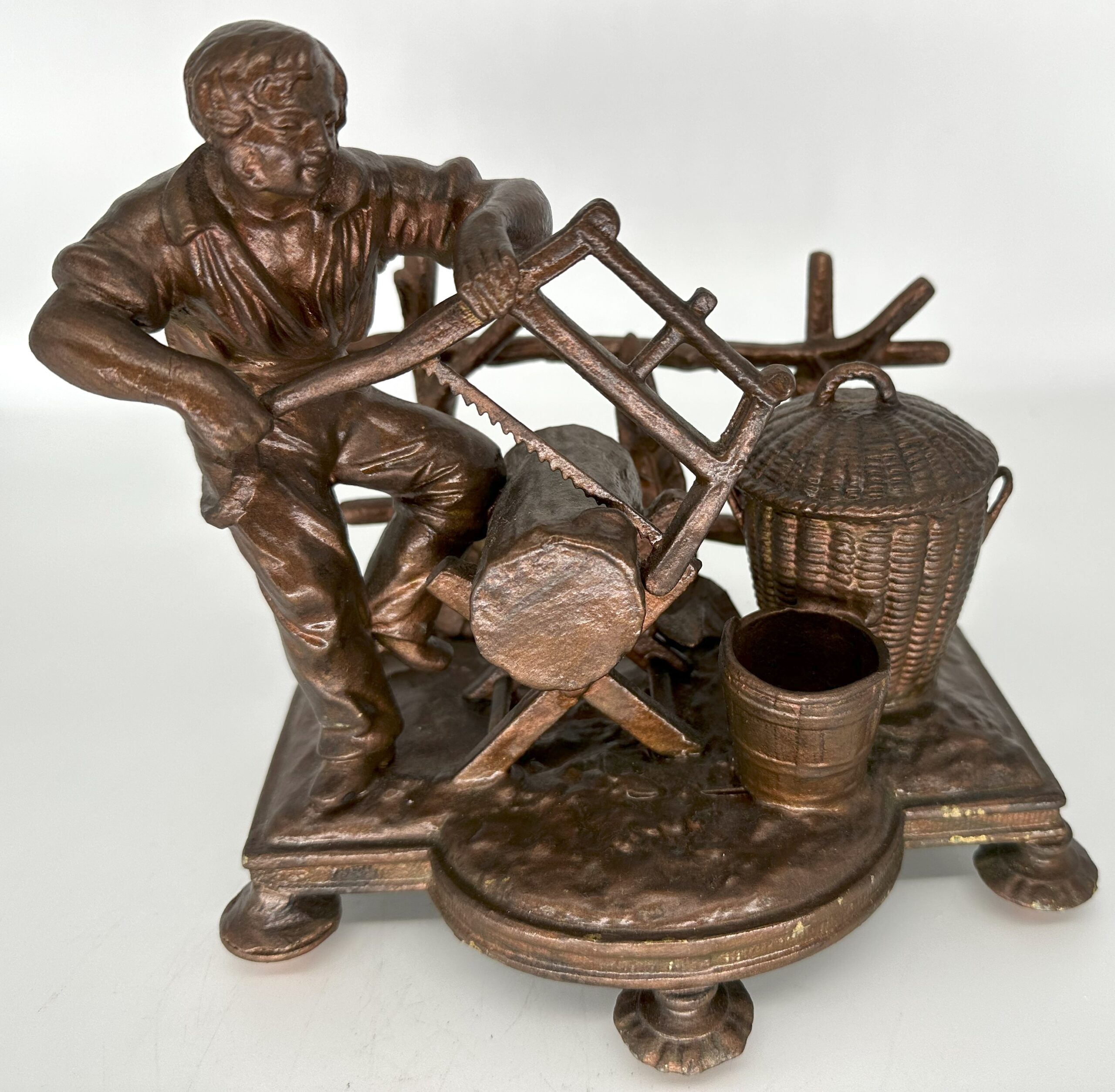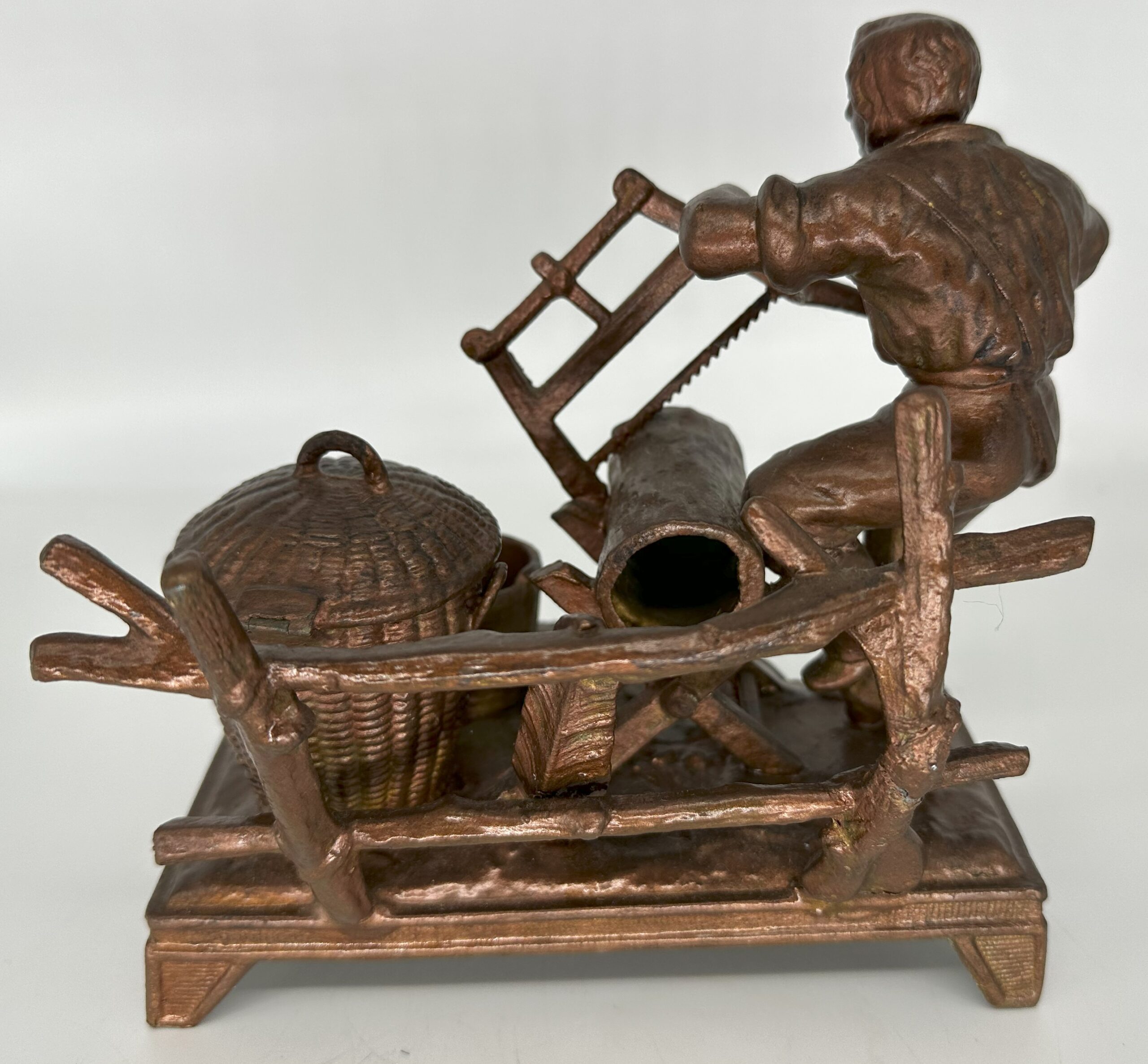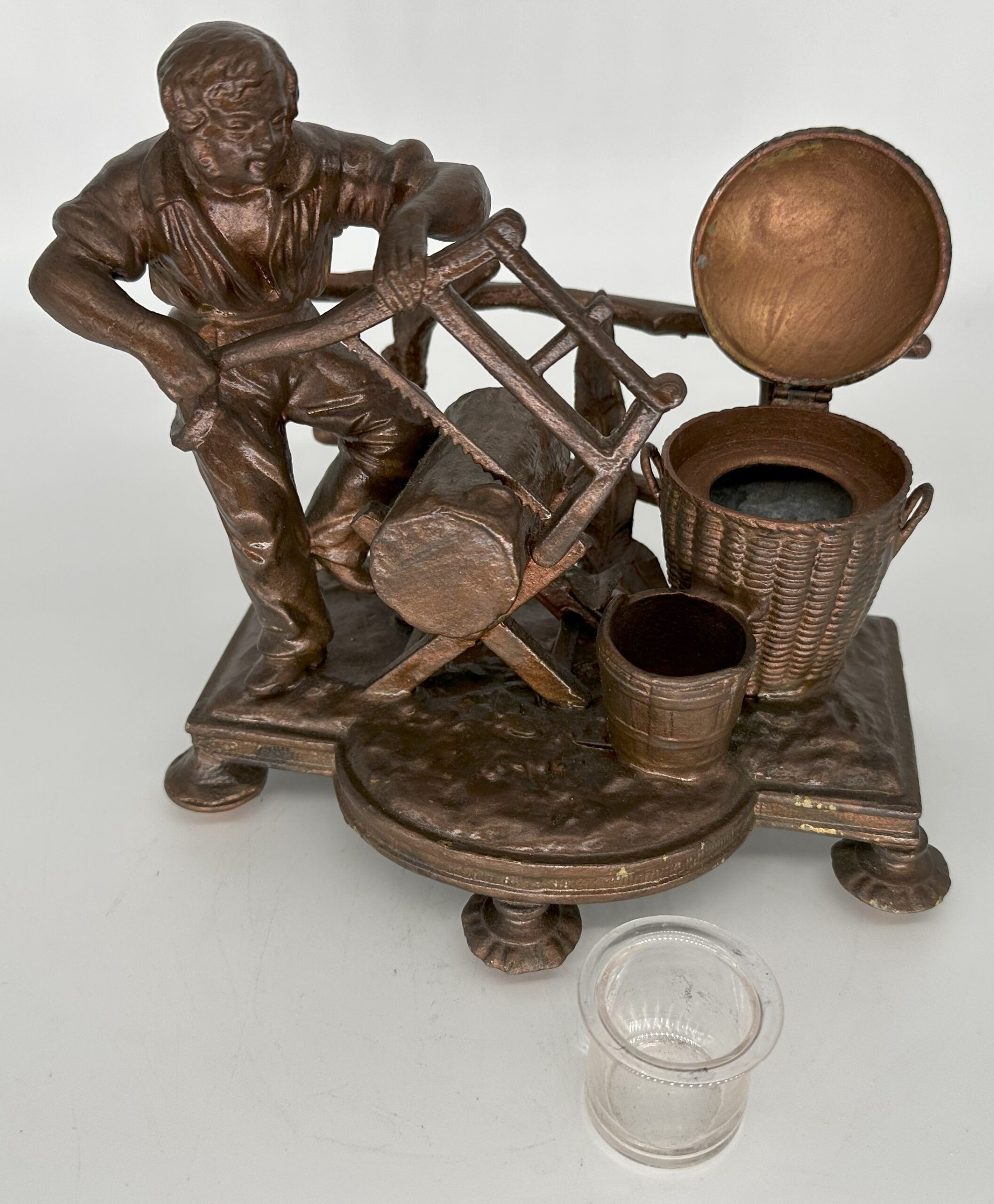 Workman uses a buck saw to saw a log resting in a sawbuck. Next to him is a lidded basket which houses the inkwell. The fence in the background works as a pen holder, as does the bucket. This is a detailed casting – the man’s clothes, the basket and bucket, even the teeth of the saw. There is an unidentified maker’s mark on the bottom.