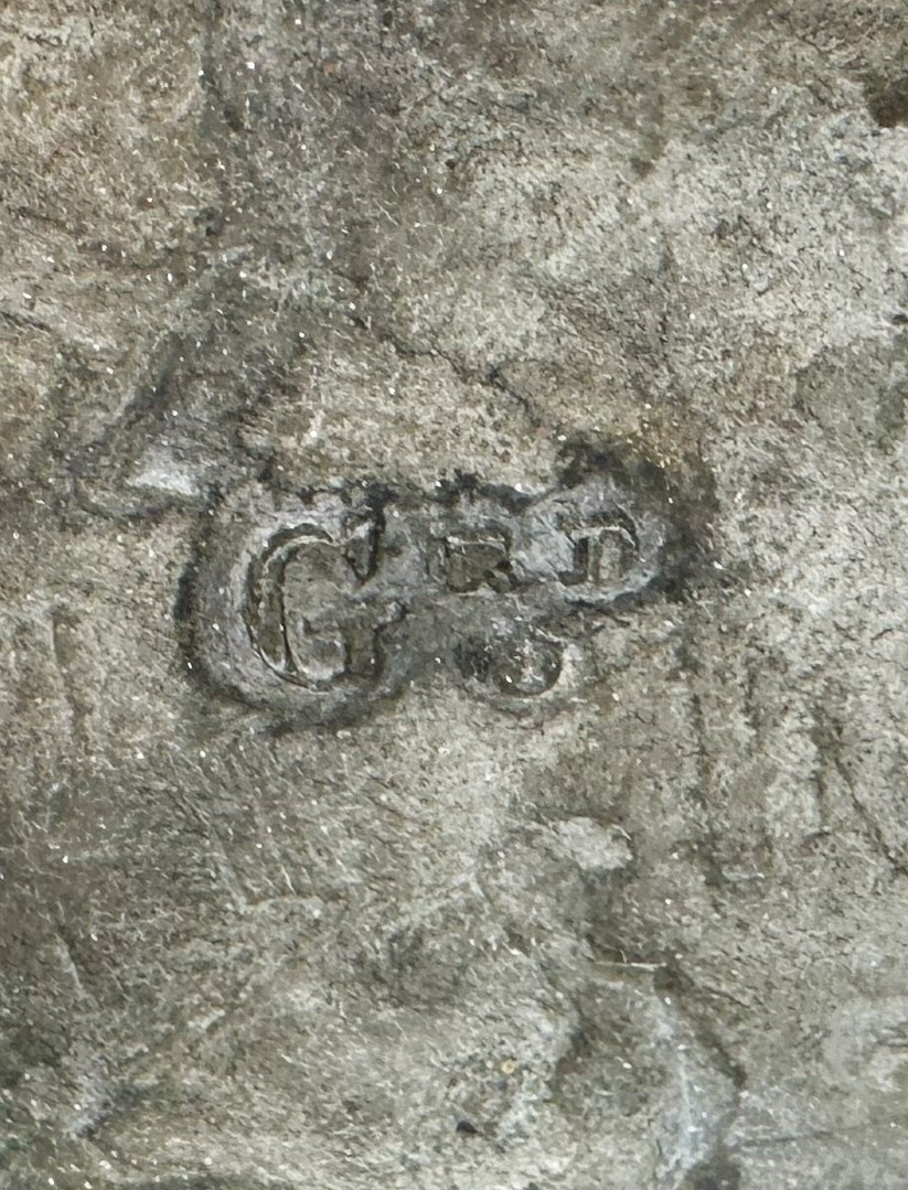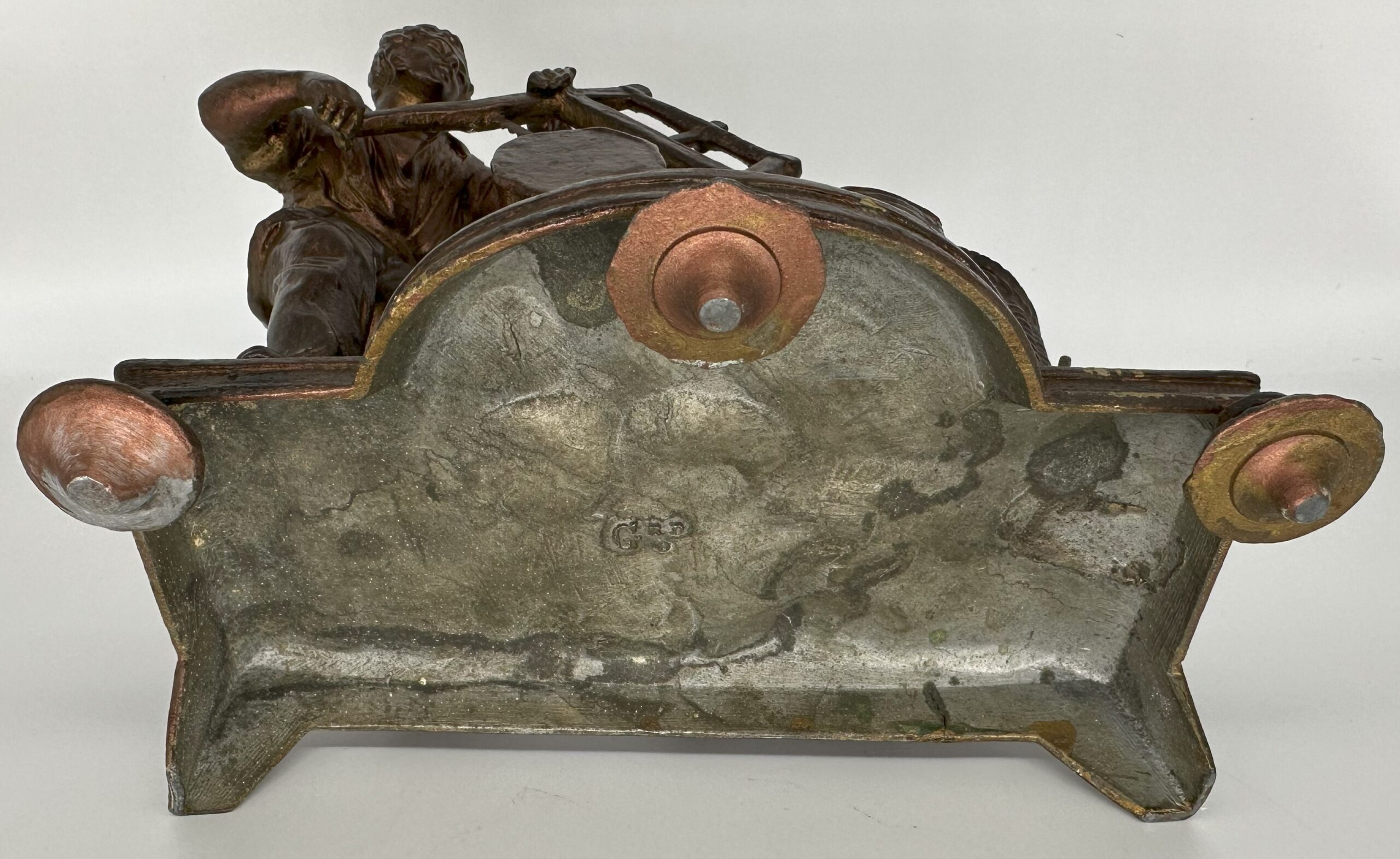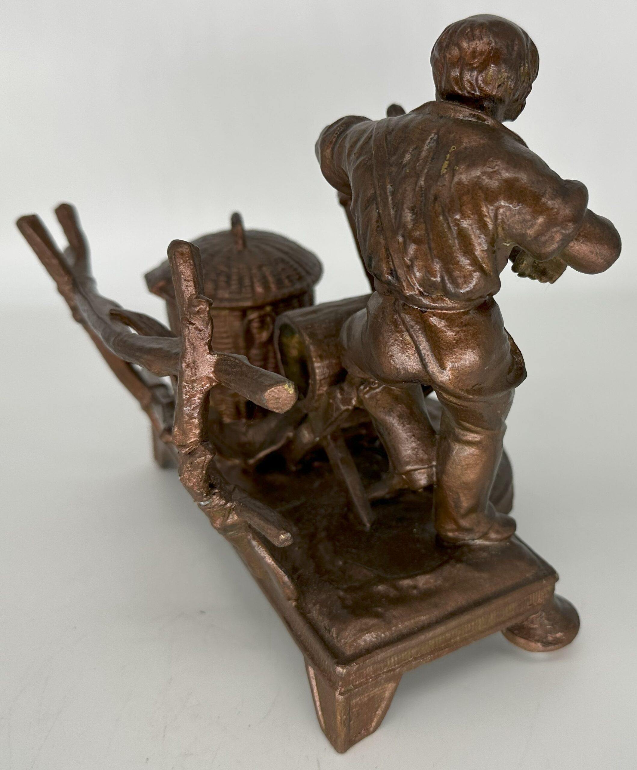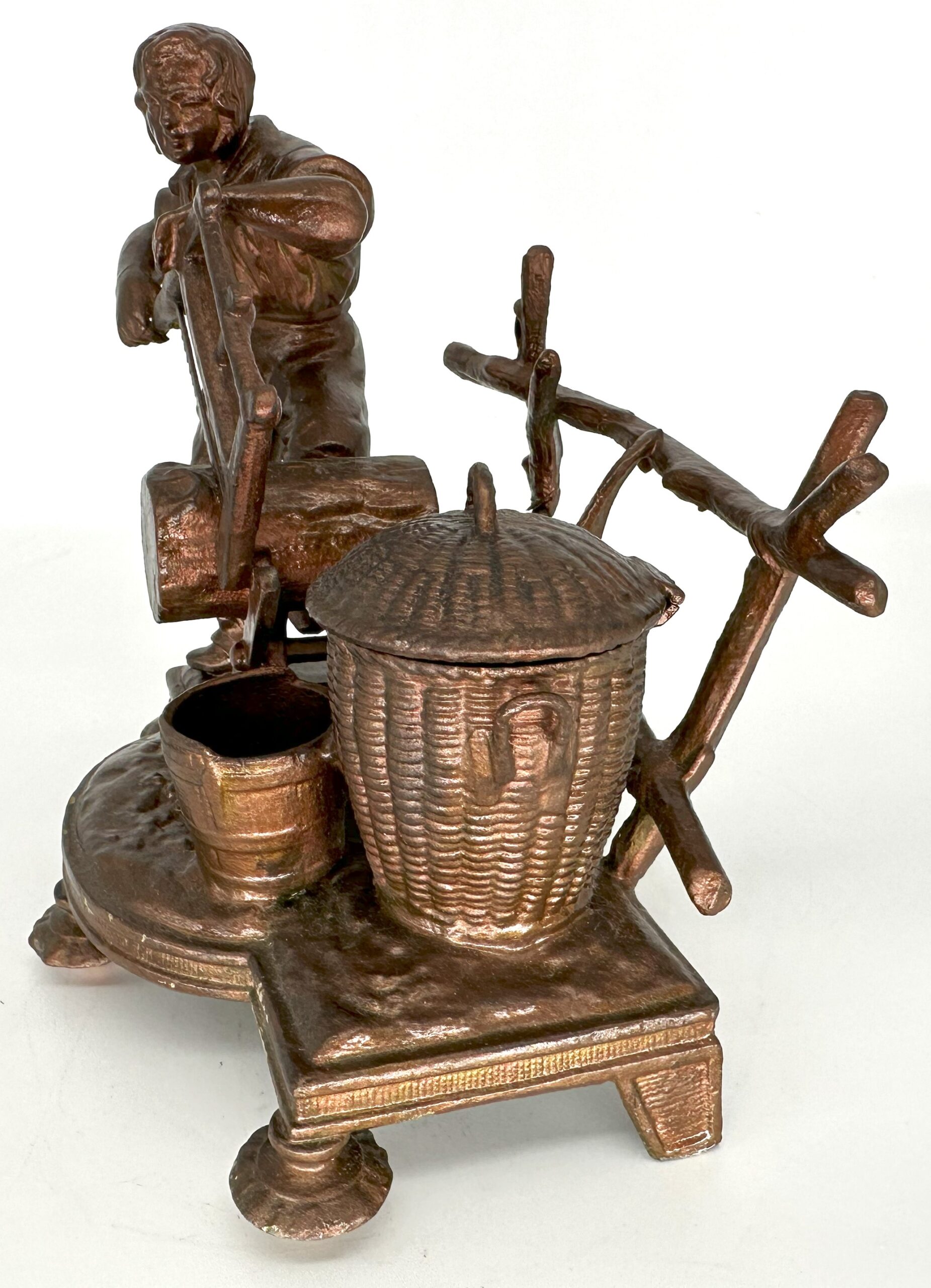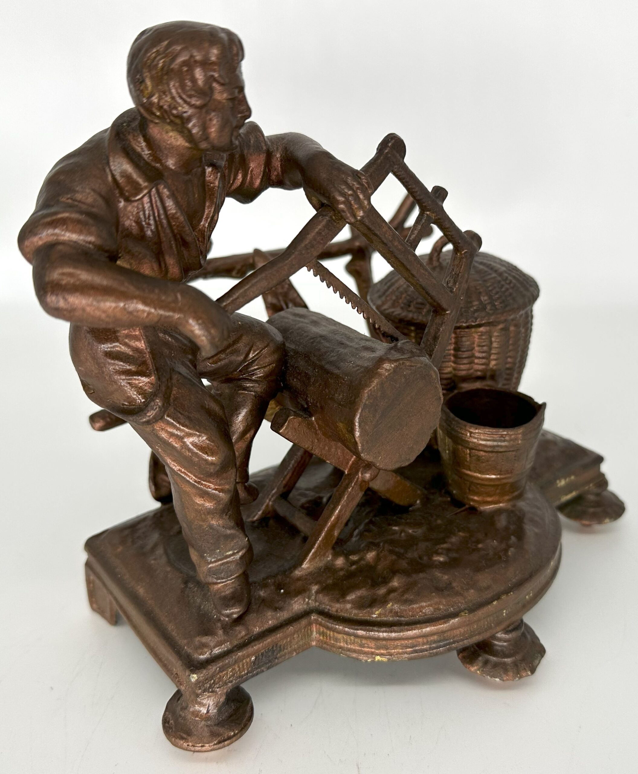 Workman uses a buck saw to saw a log resting in a sawbuck. Next to him is a lidded basket which houses the inkwell. The fence in the background works as a pen holder, as does the bucket. This is a detailed casting – the man’s clothes, the basket and bucket, even the teeth of the saw. There is an unidentified maker’s mark on the bottom.