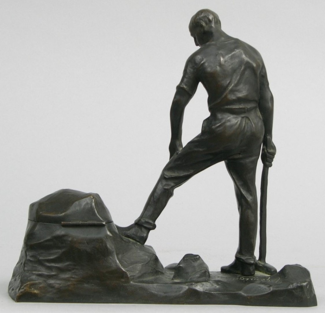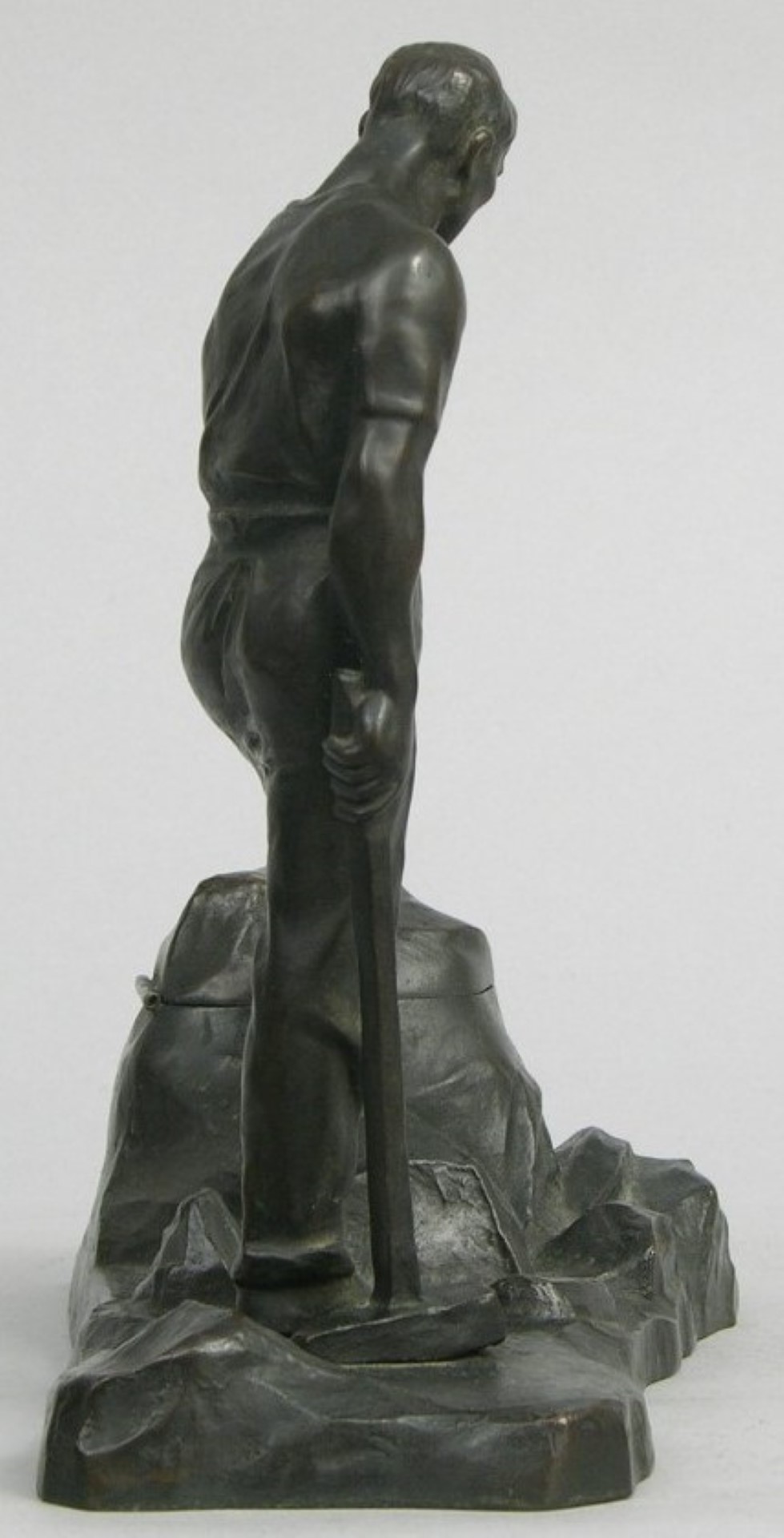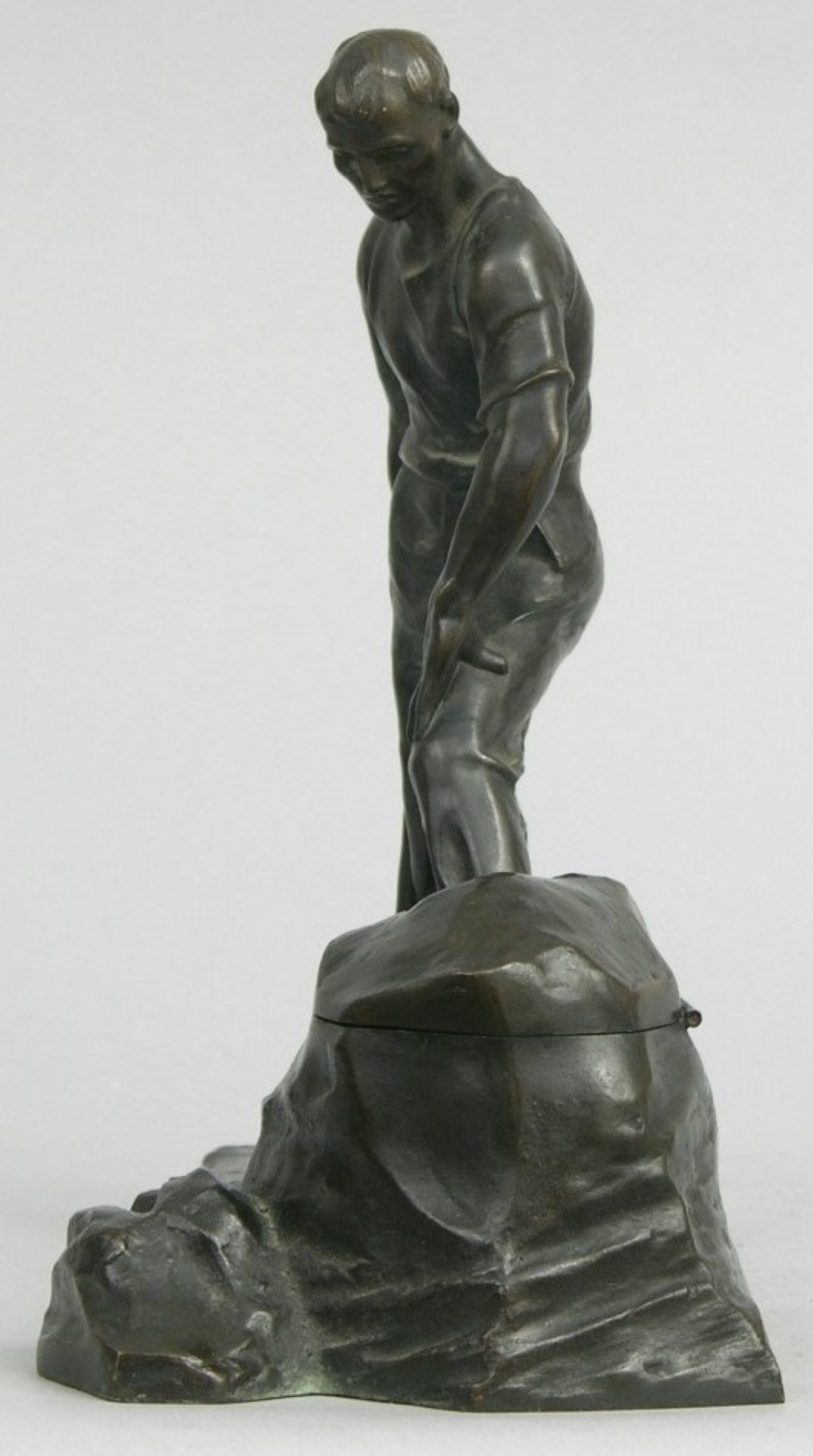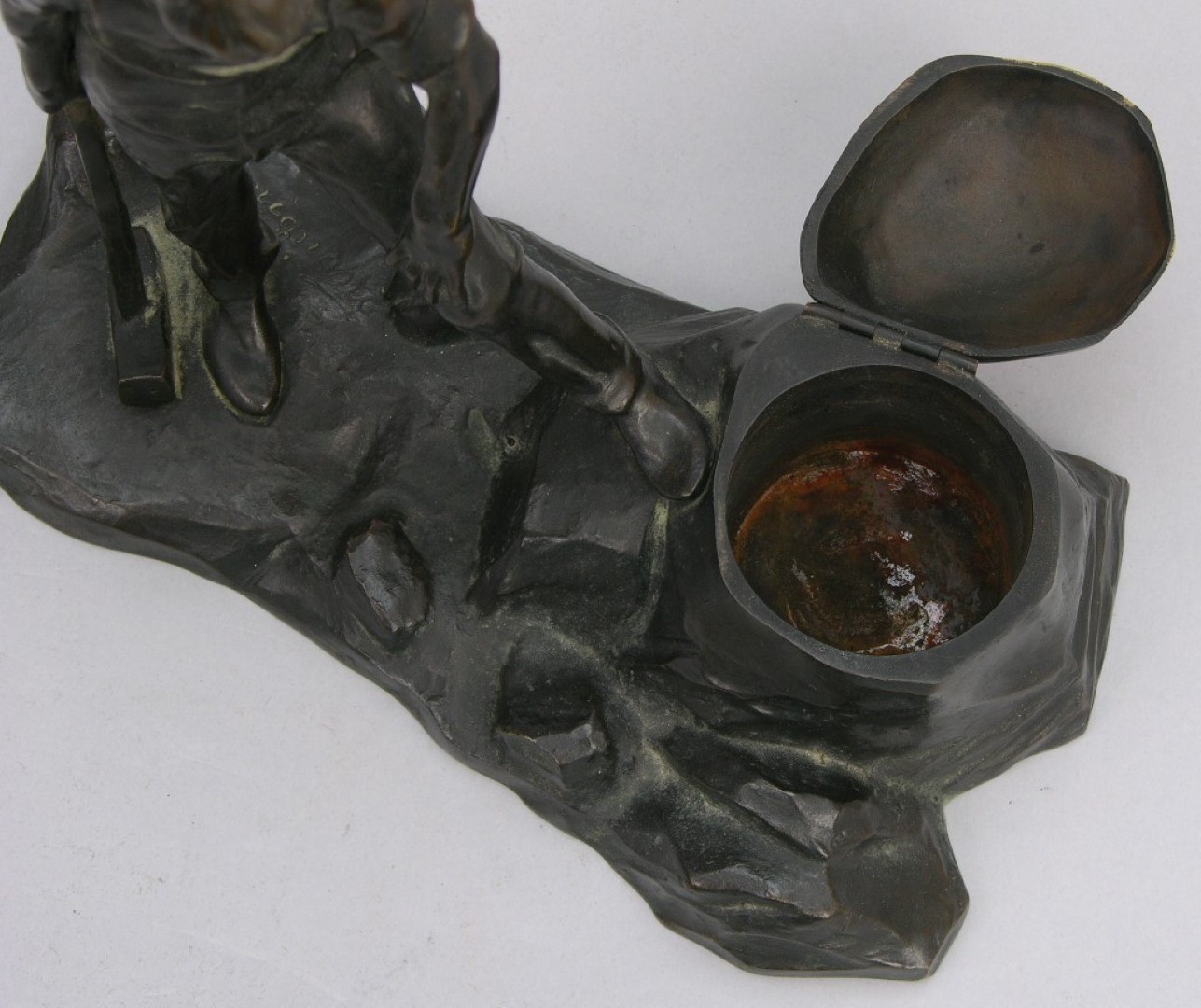 Cast bronze inkstand in the form of a laborer with a sledgehammer among some rocks. The largest rock has a hinged lid to cover the inkwell (insert is missing). The impressed signature of the artist, Valmore Gemignani (1879 – 1958) is found on the base.
