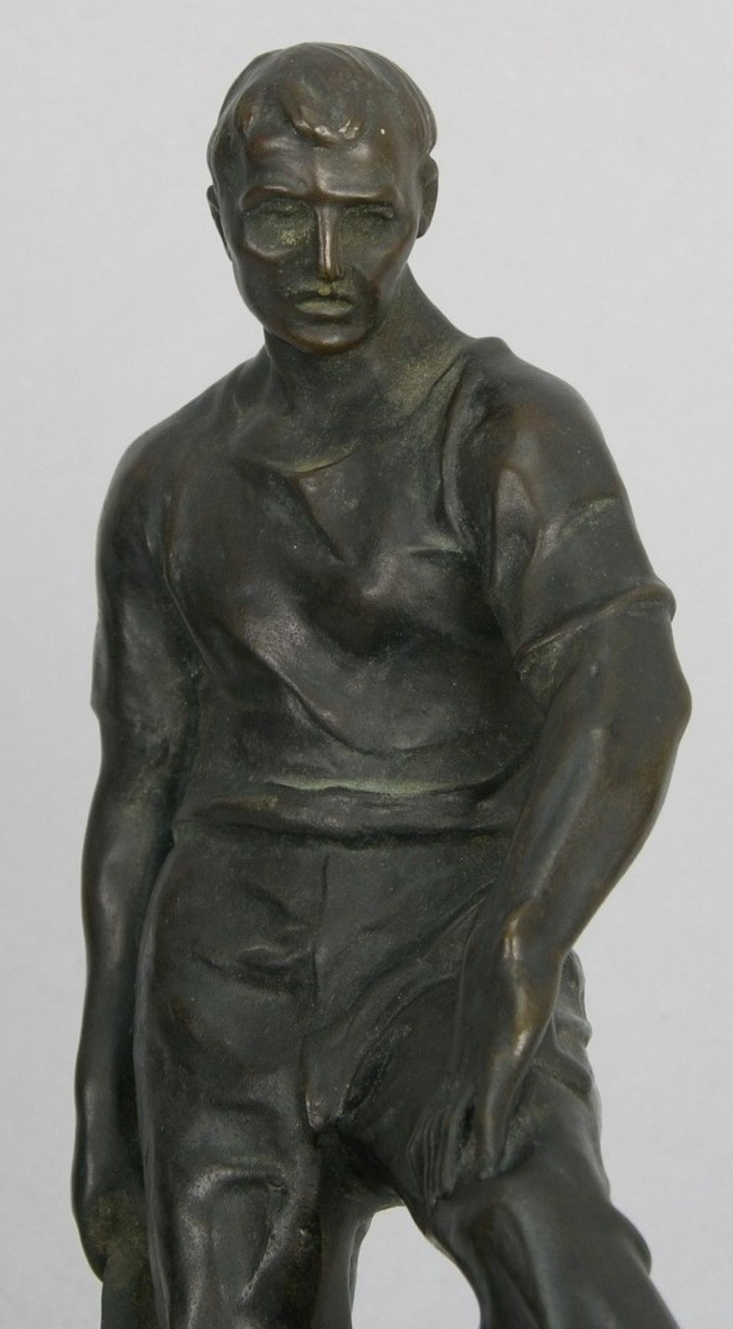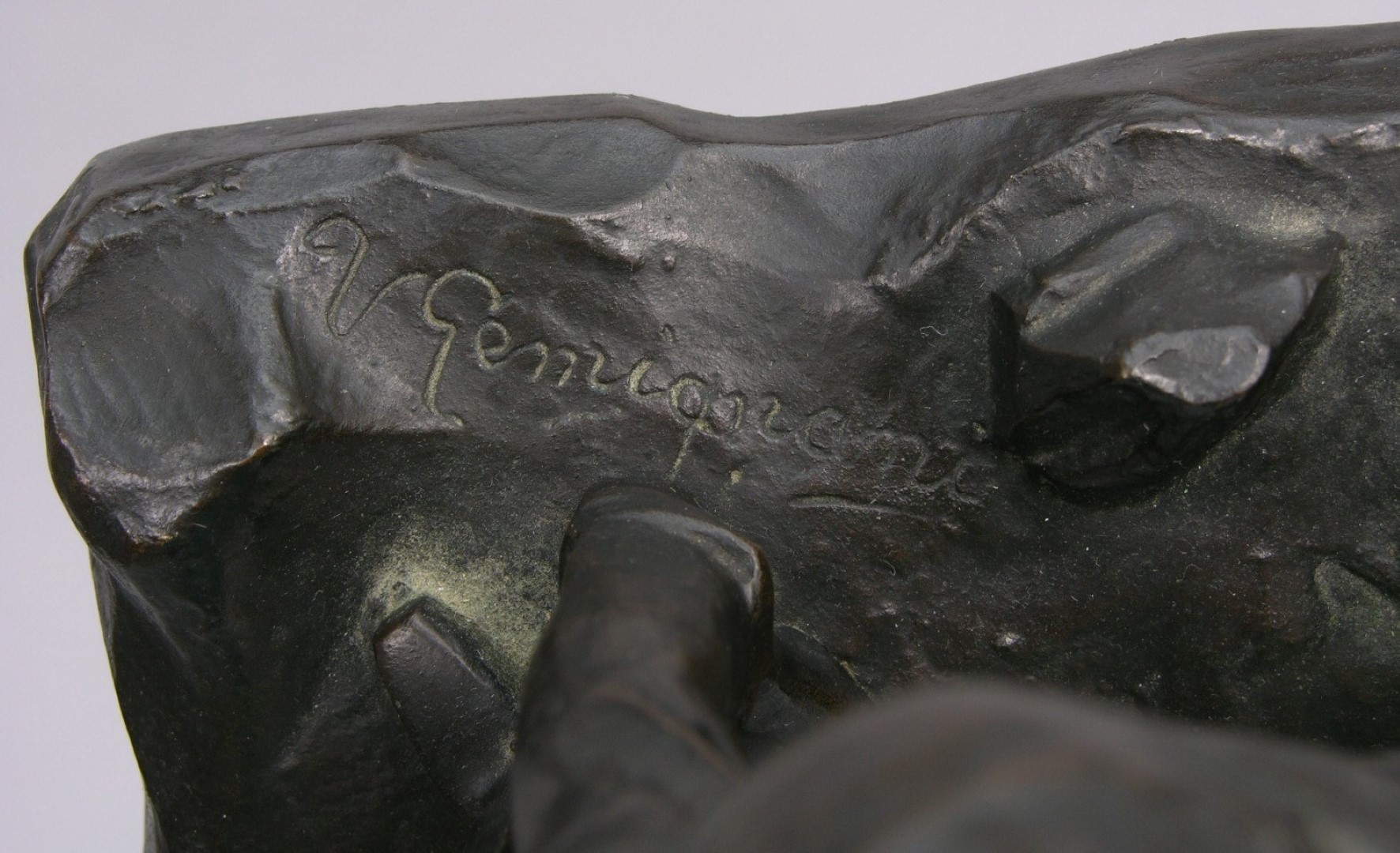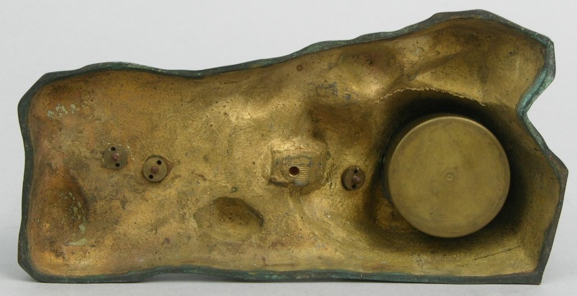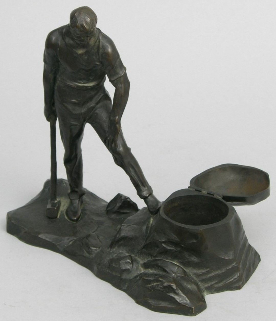 Cast bronze inkstand in the form of a laborer with a sledgehammer among some rocks. The largest rock has a hinged lid to cover the inkwell (insert is missing). The impressed signature of the artist, Valmore Gemignani (1879 – 1958) is found on the base.