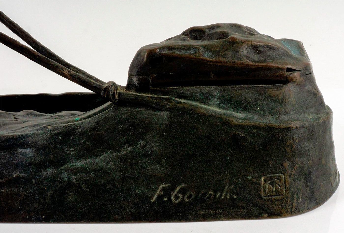 Friedrich Gornik (1877-1943) was an Austrian Sculptor who was known for making utilitarian items such as match-safes and inkwells. This large Friedrich Gornik Bronze Inkstand depicts two hard working men pulling a rope to move a large boulder from a field. With a long pen rest this inkwell is signed along the bottom edge, “F. Gornik” and a foundry mark “AR.”
