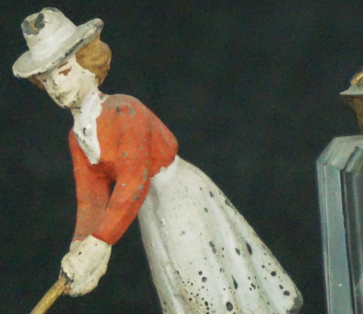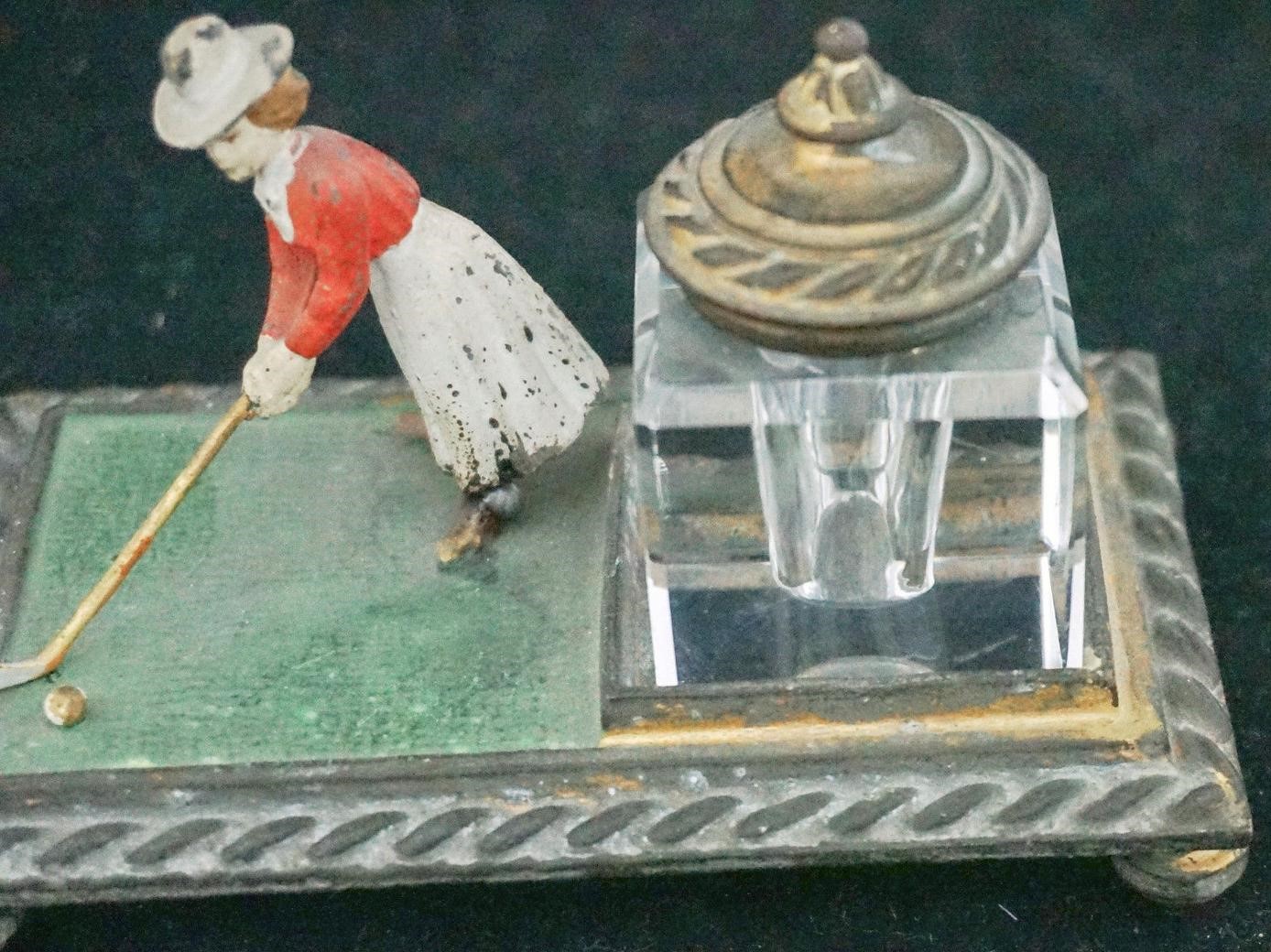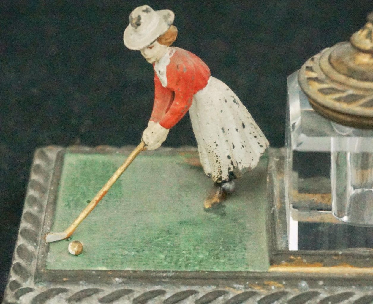 Fore! This figural inkwell features a woman golfer. She is dressed in a long, white skirt, red shirt, white scarf, and a hat. She’s even wearing golfing gloves. Next to her is a cut glass inkwell with a separate lid. The inkstand’s base is supported with four pinecone-shaped feet and a rope trim matching the trim on the inkwell’s lid.