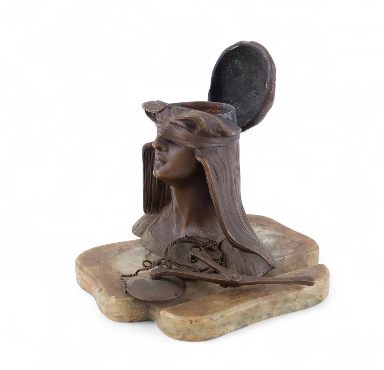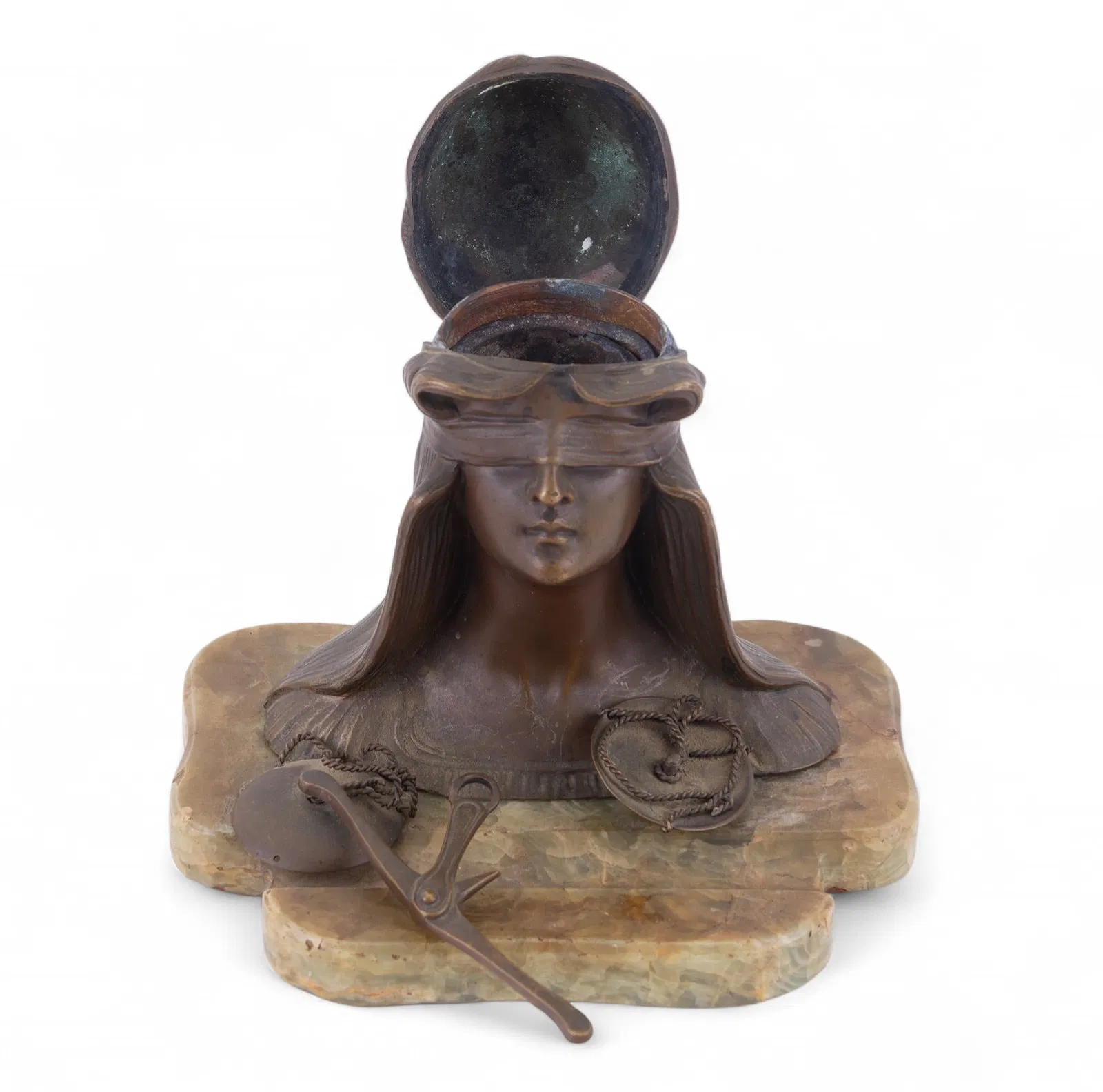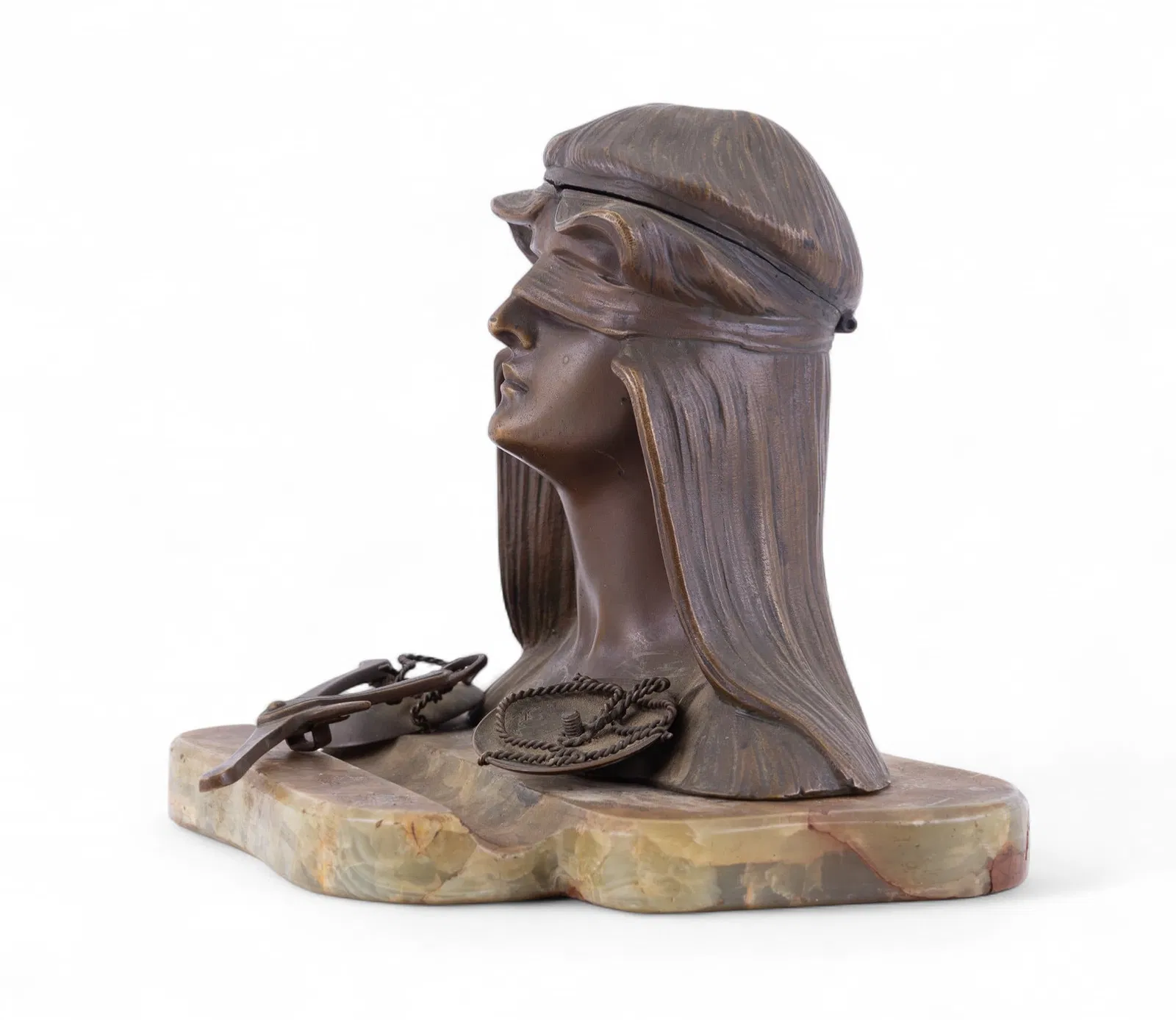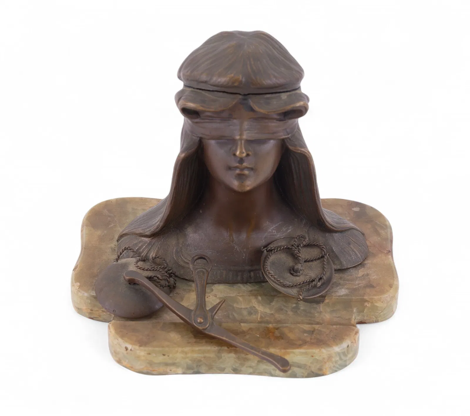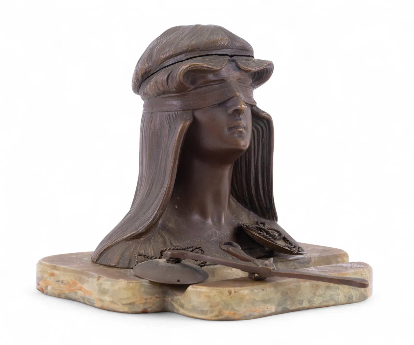 This figural inkwell, cast in bronze, is a representation of Lady Justice, who is recognizable by her blindfold, which signifies impartiality. She has a serene expression, and her hair is depicted as flowing gracefully over her shoulders. The top of her head is hinged, allowing it to open and reveal the internal inkwell. The bust rests on a marble base, which features a channel in the front to serve as a pen rest.