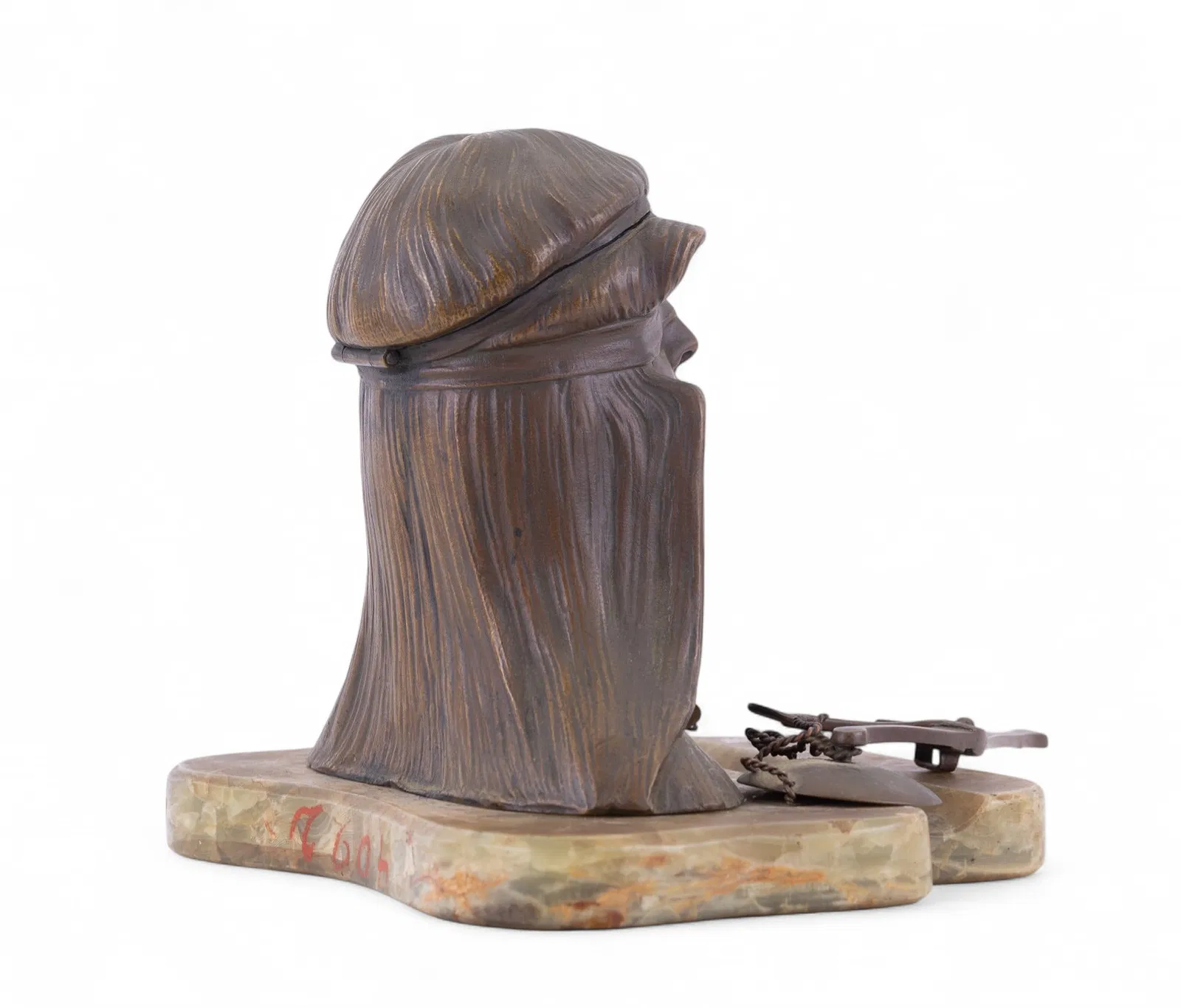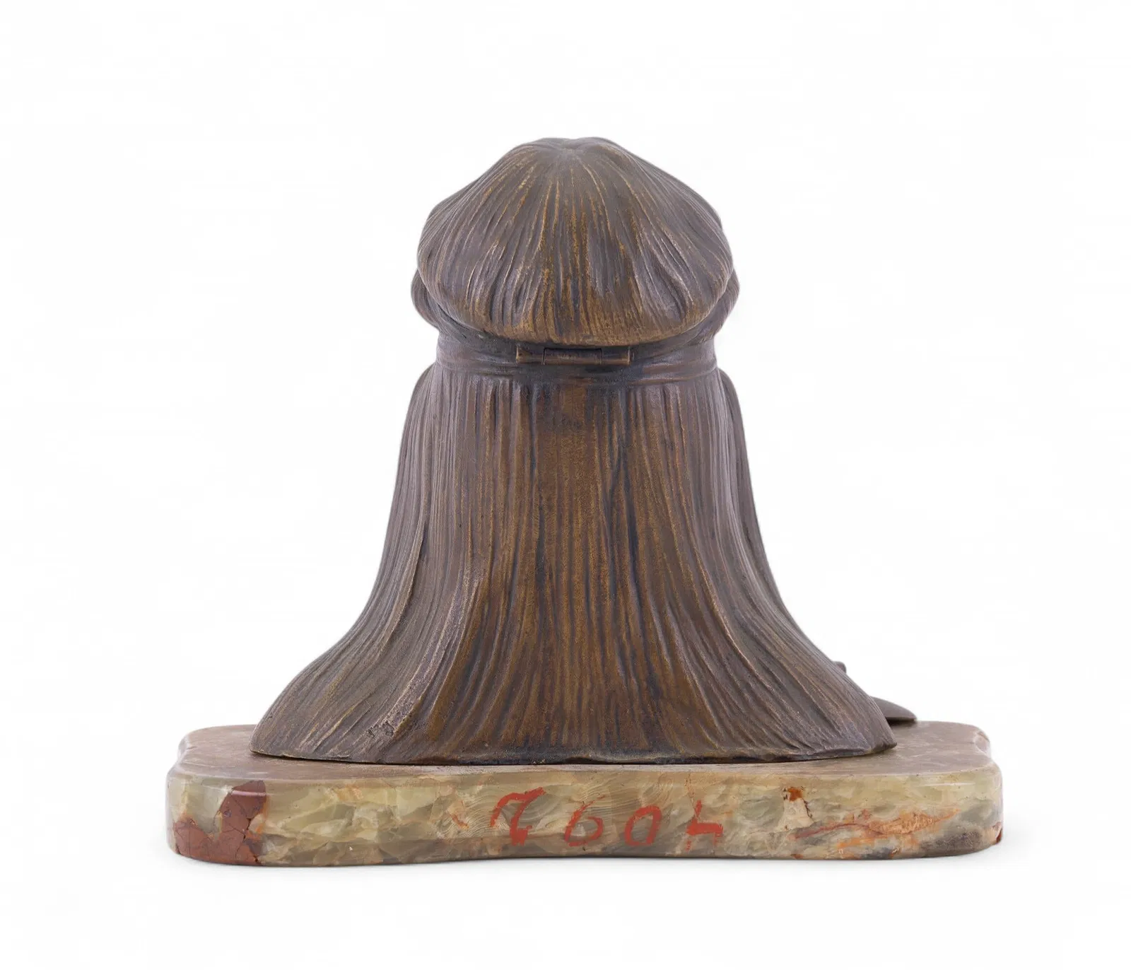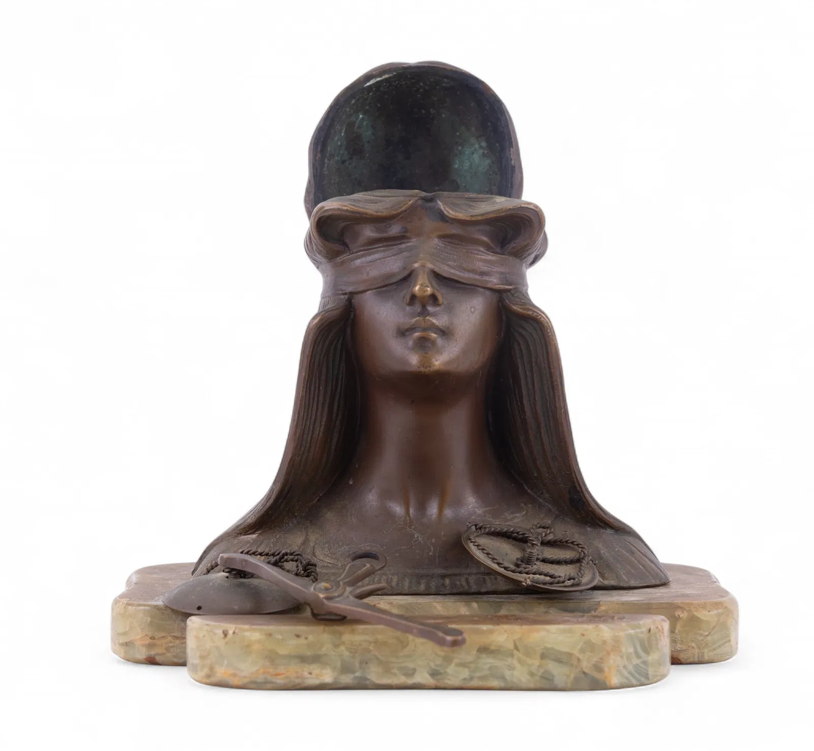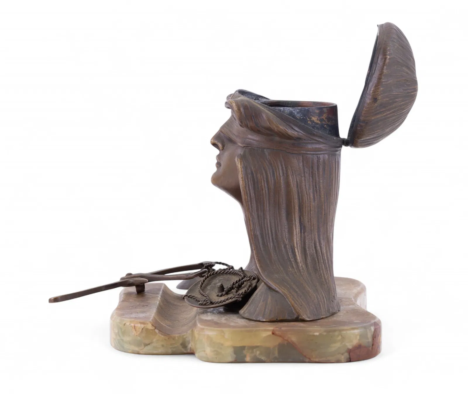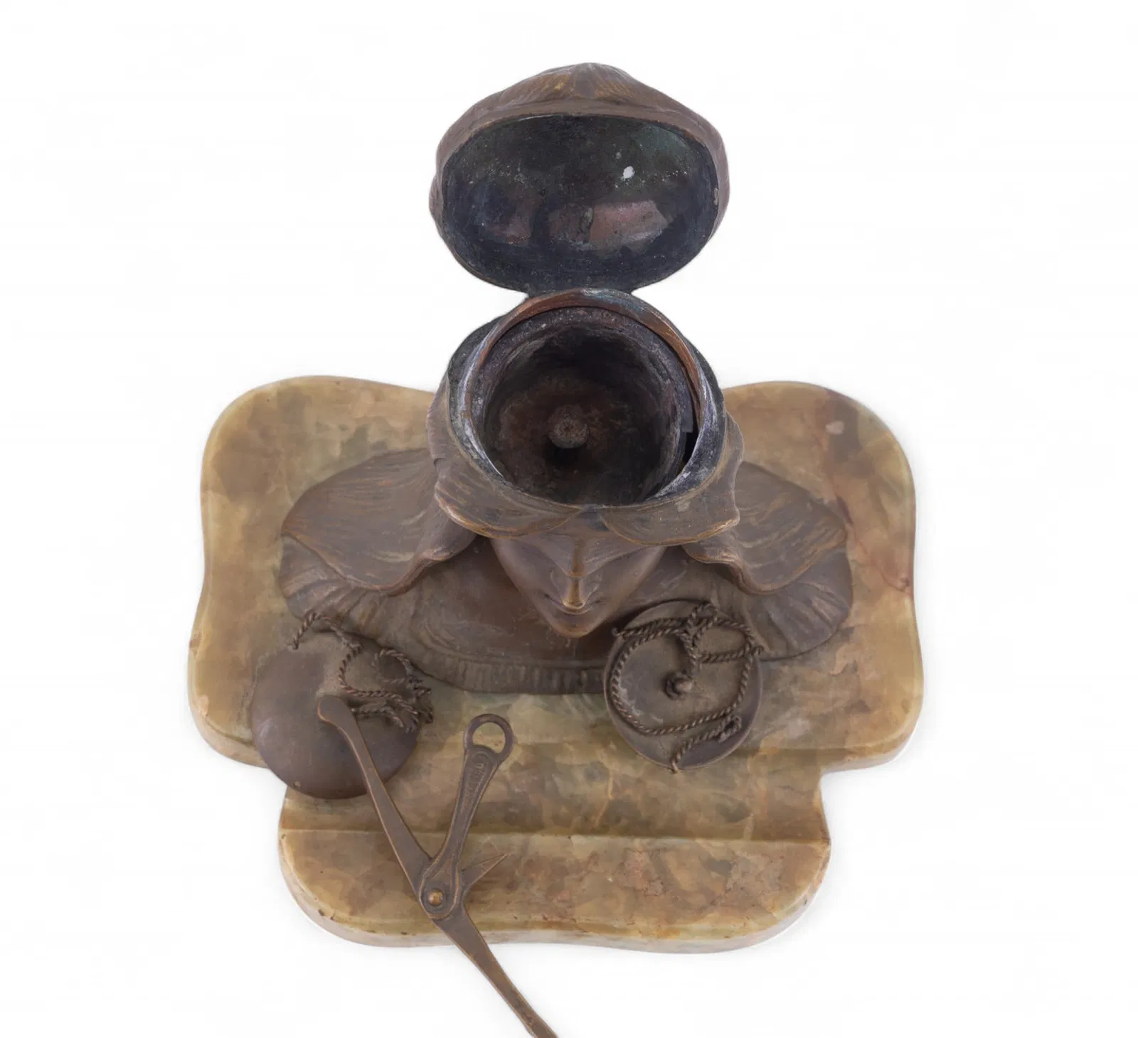 This figural inkwell, cast in bronze, is a representation of Lady Justice, who is recognizable by her blindfold, which signifies impartiality. She has a serene expression, and her hair is depicted as flowing gracefully over her shoulders. The top of her head is hinged, allowing it to open and reveal the internal inkwell. The bust rests on a marble base, which features a channel in the front to serve as a pen rest.