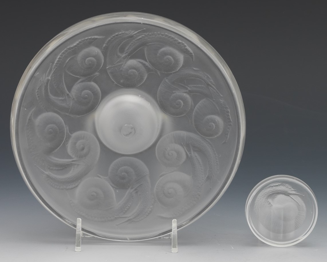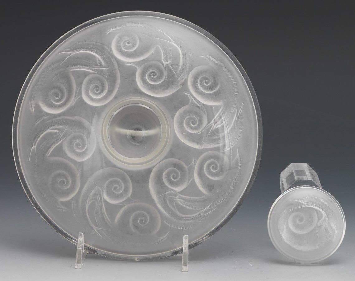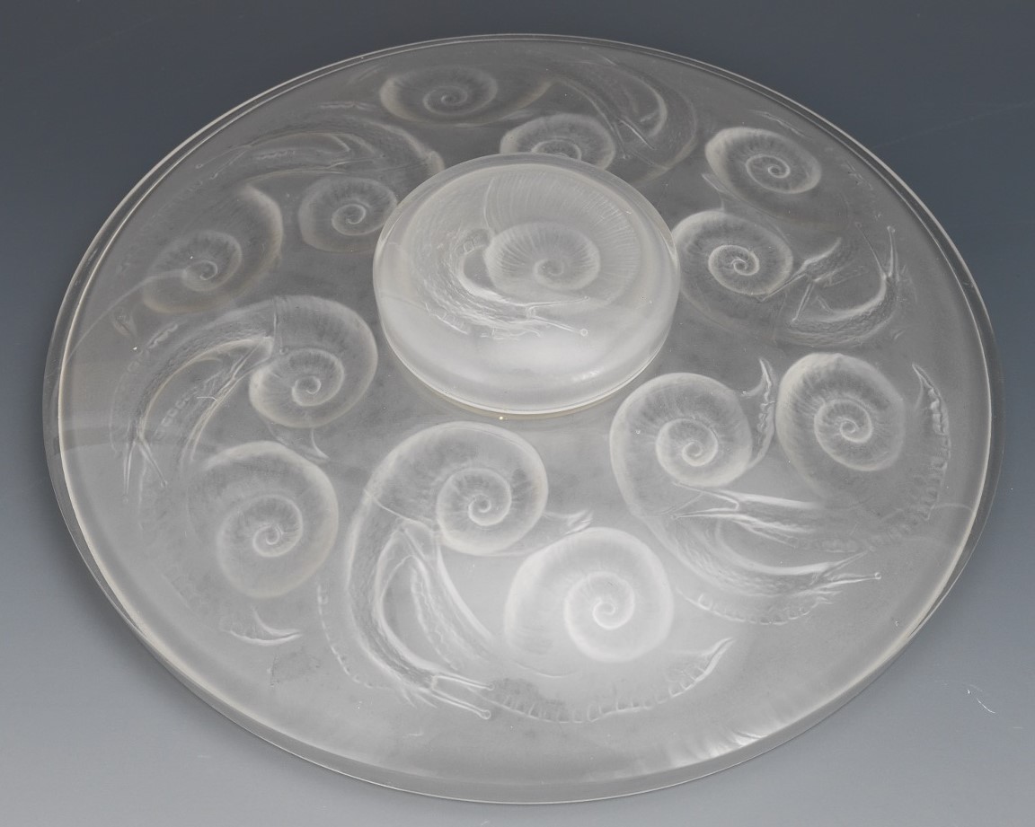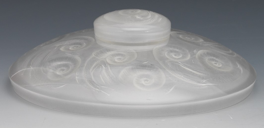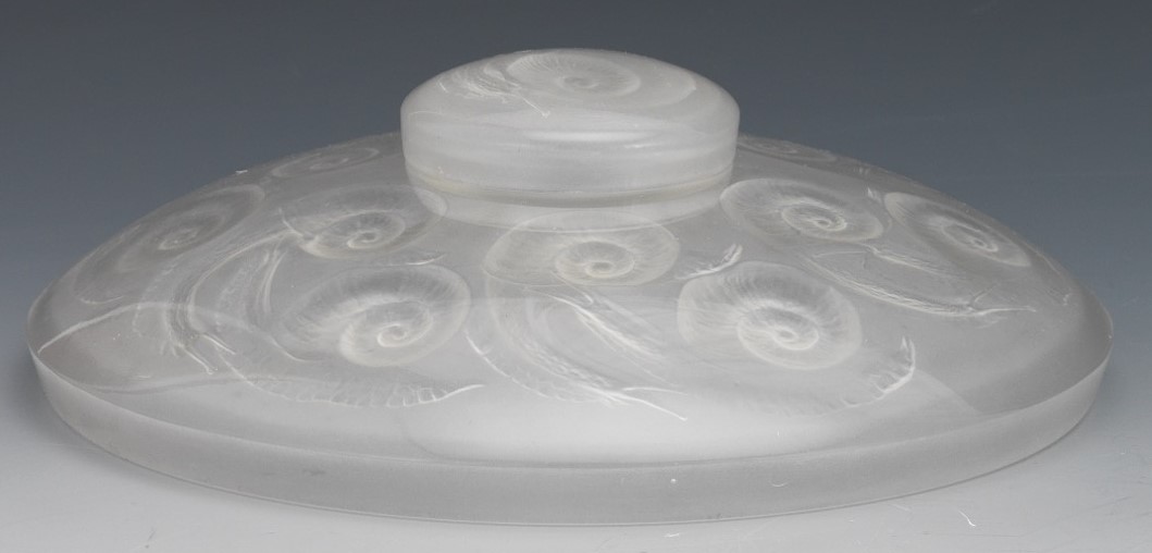 Rene Lalique escargot frosted glass inkwell – round snails motif with comporting cover for the central inkwell. “R. Lalique” etched signature on the side.