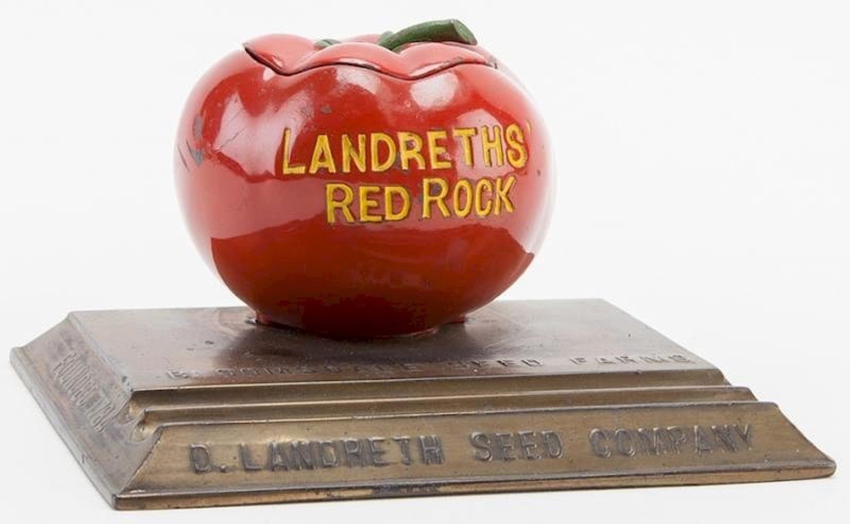 This inkstand advertises the Landreth Seed Company, one of the oldest companies founded in the U.S. Founded in 1784, the company sold crop seeds to George Washington and Thomas Jefferson, and introduced varieties of tomatoes, white potatoes, and the Zinnia plant to North America. The “Red Rock” variety was introduced in 1915 and is now an heirloom variety. The tomato’s stem is a finial for the hinged lid which opens to access the inkwell.