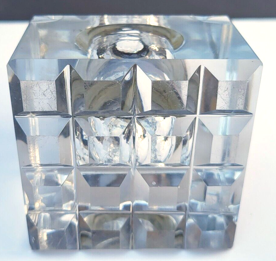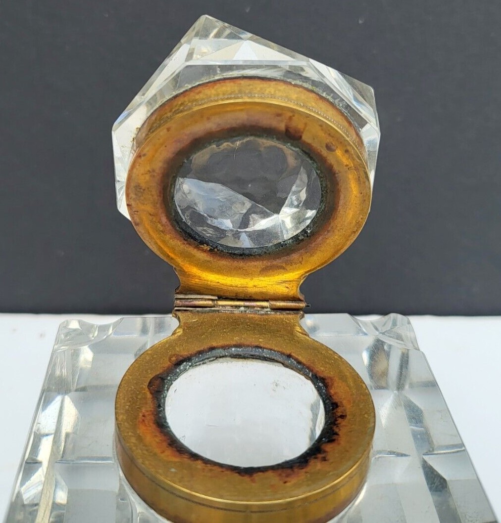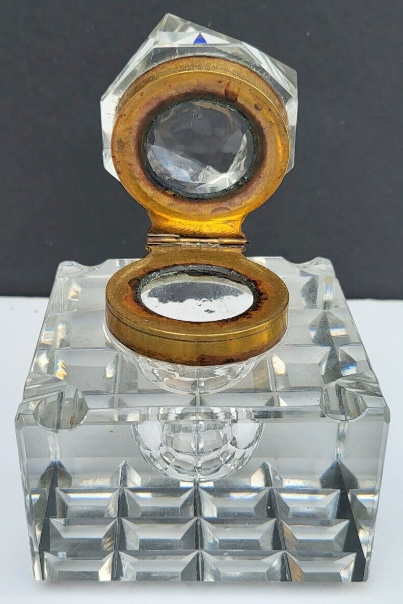 The bottom of this large cut crystal inkwell has a waffle-type design. The top corners have cut-out designs. The lid, facet cut, is like a prism. The fittings are brass.