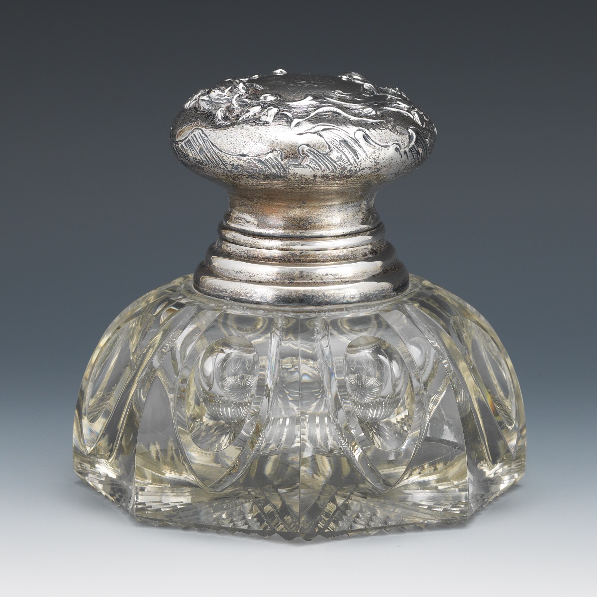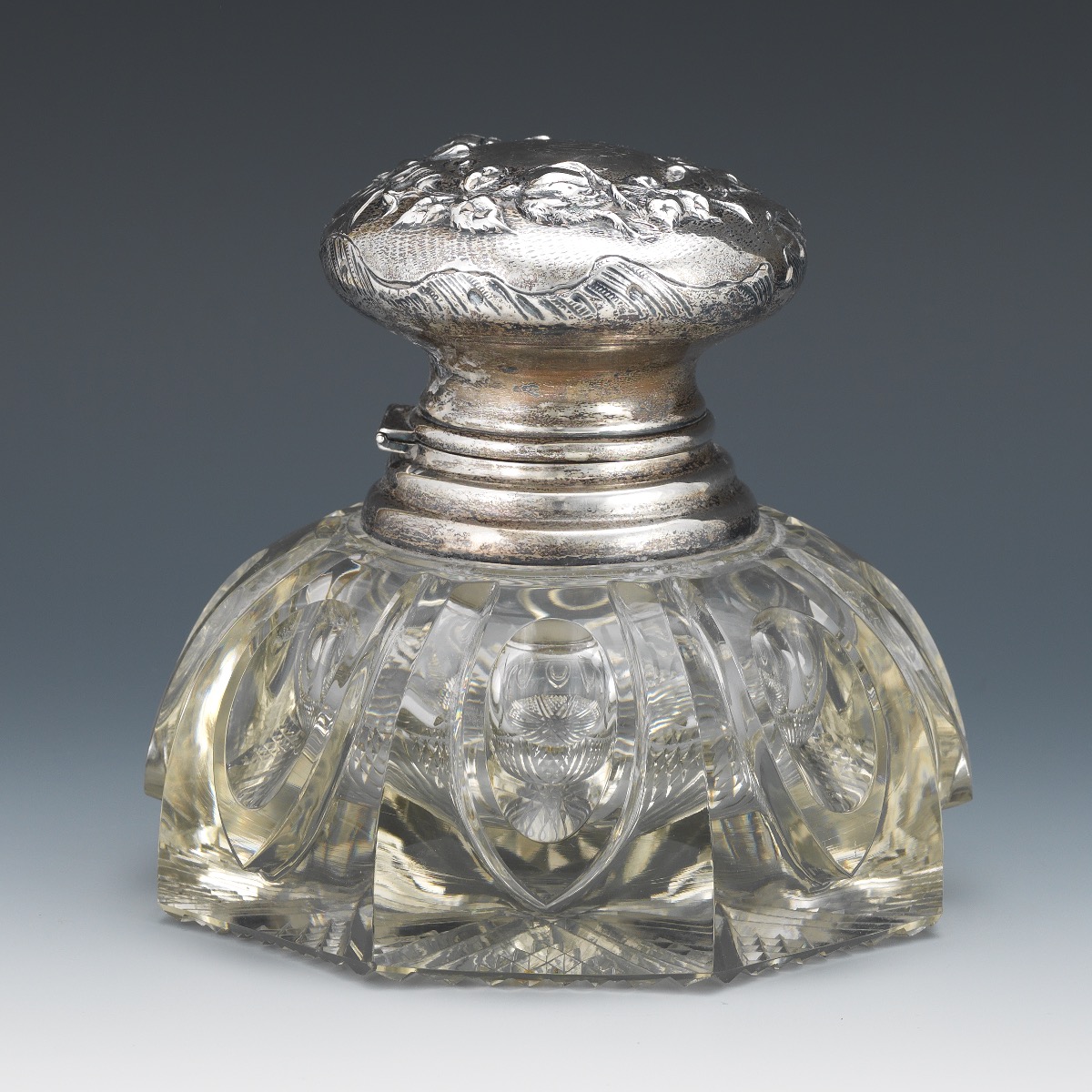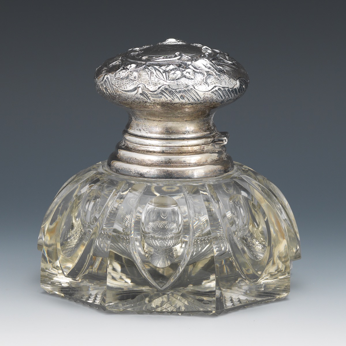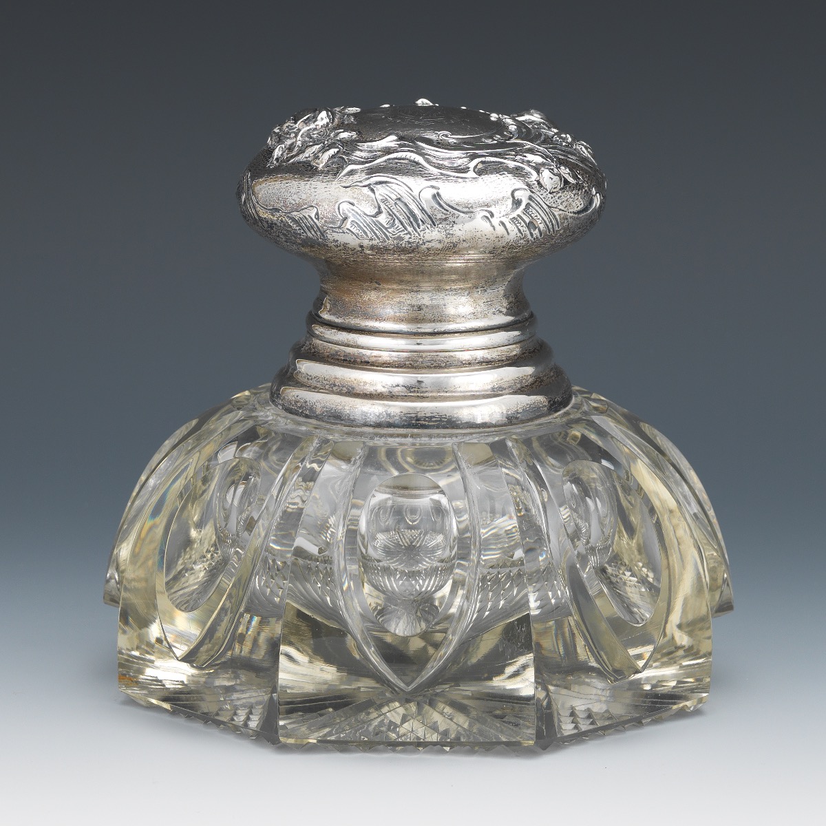 This large American brilliant cut glass inkwell has a repoussé floral sterling silver lid with a monogram. The mark for the Mauser Manufacturing Co. is located below the hinge.