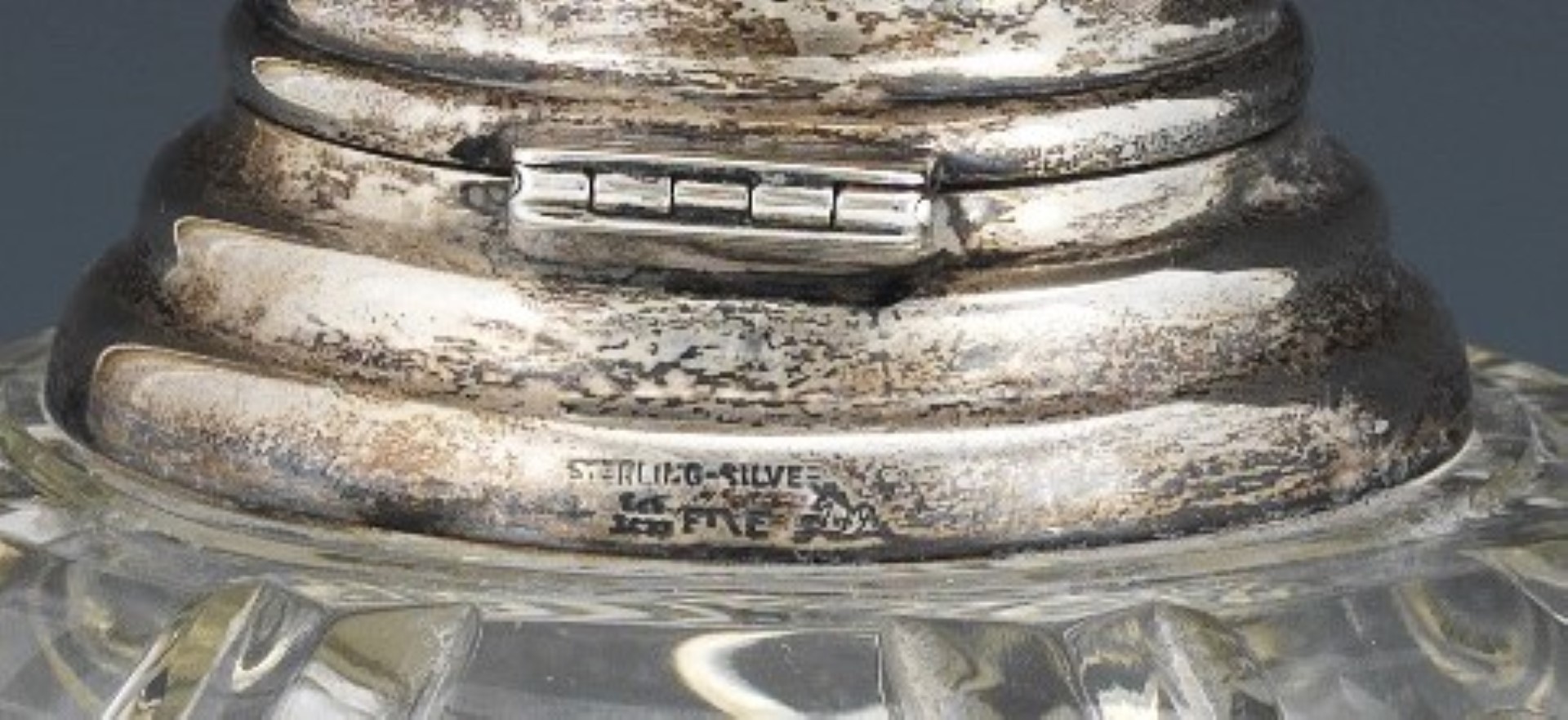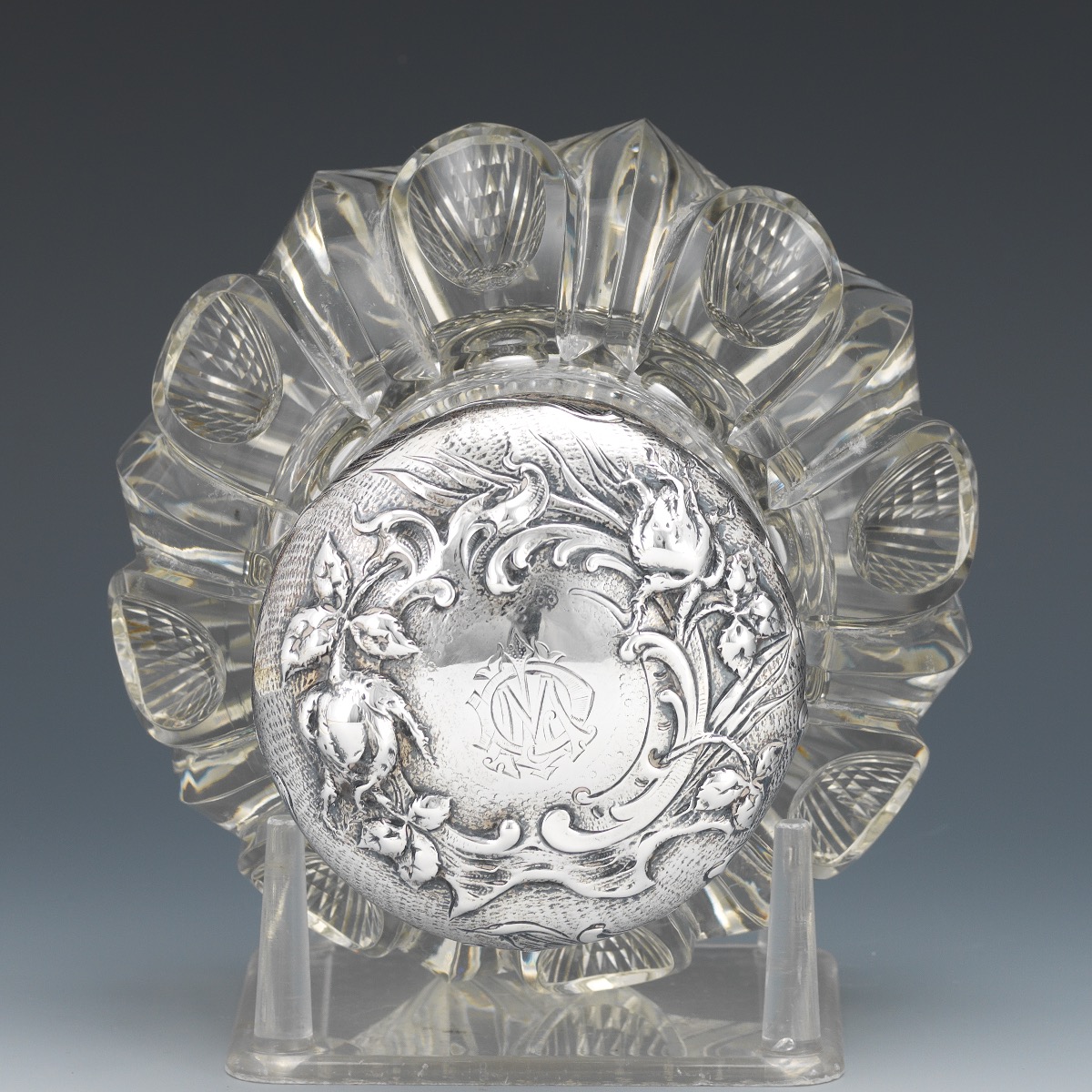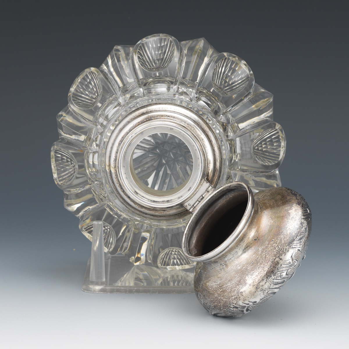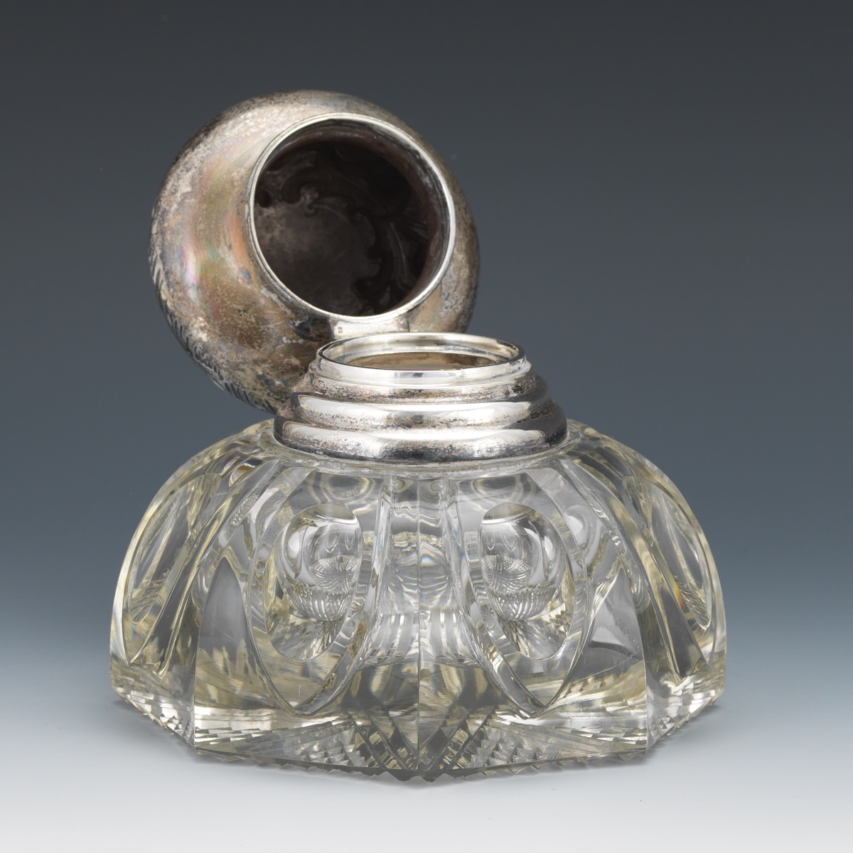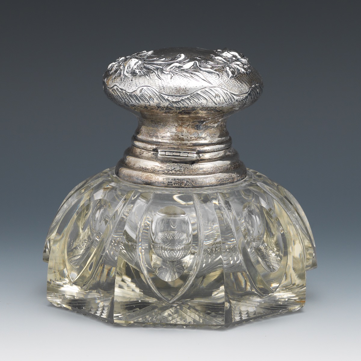 This large American brilliant cut glass inkwell has a repoussé floral sterling silver lid with a monogram. The mark for the Mauser Manufacturing Co. is located below the hinge.