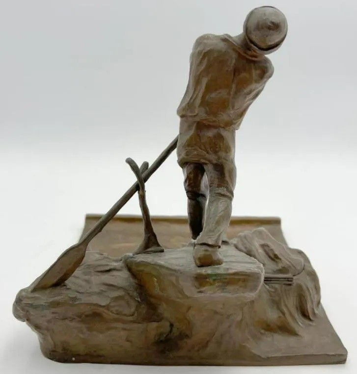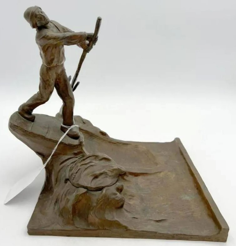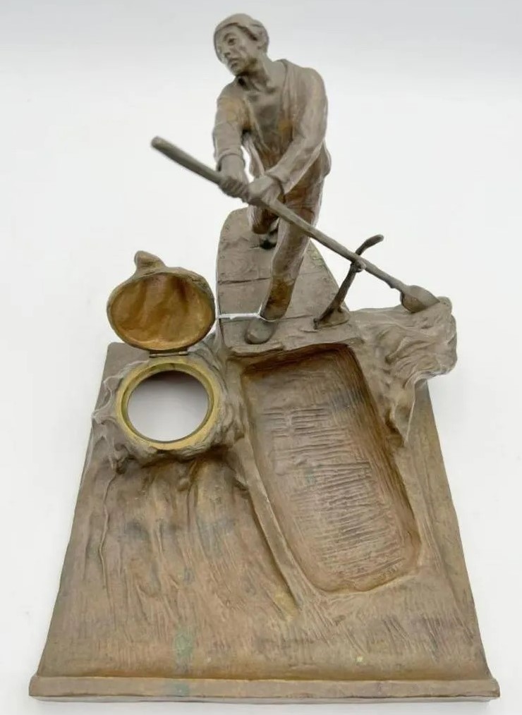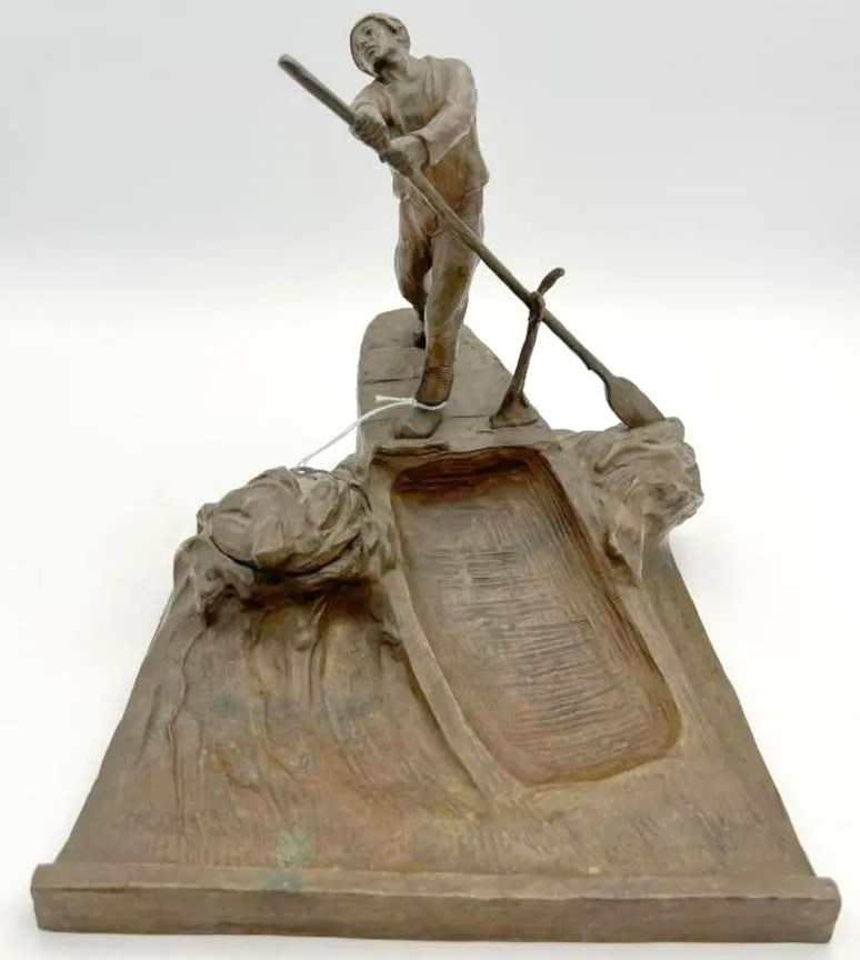 Large bronze inkwell of an oarsman on boat/gondola rowing. The inkwell is under the rock (insert is missing)
