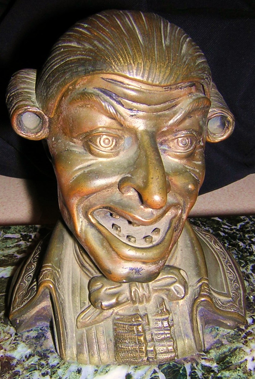 Comical (grotesque) depiction of a lawyer (solicitor / barrister) attached to a marble base with pen channel.