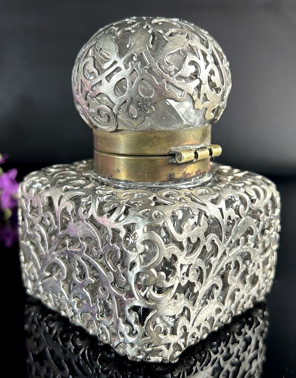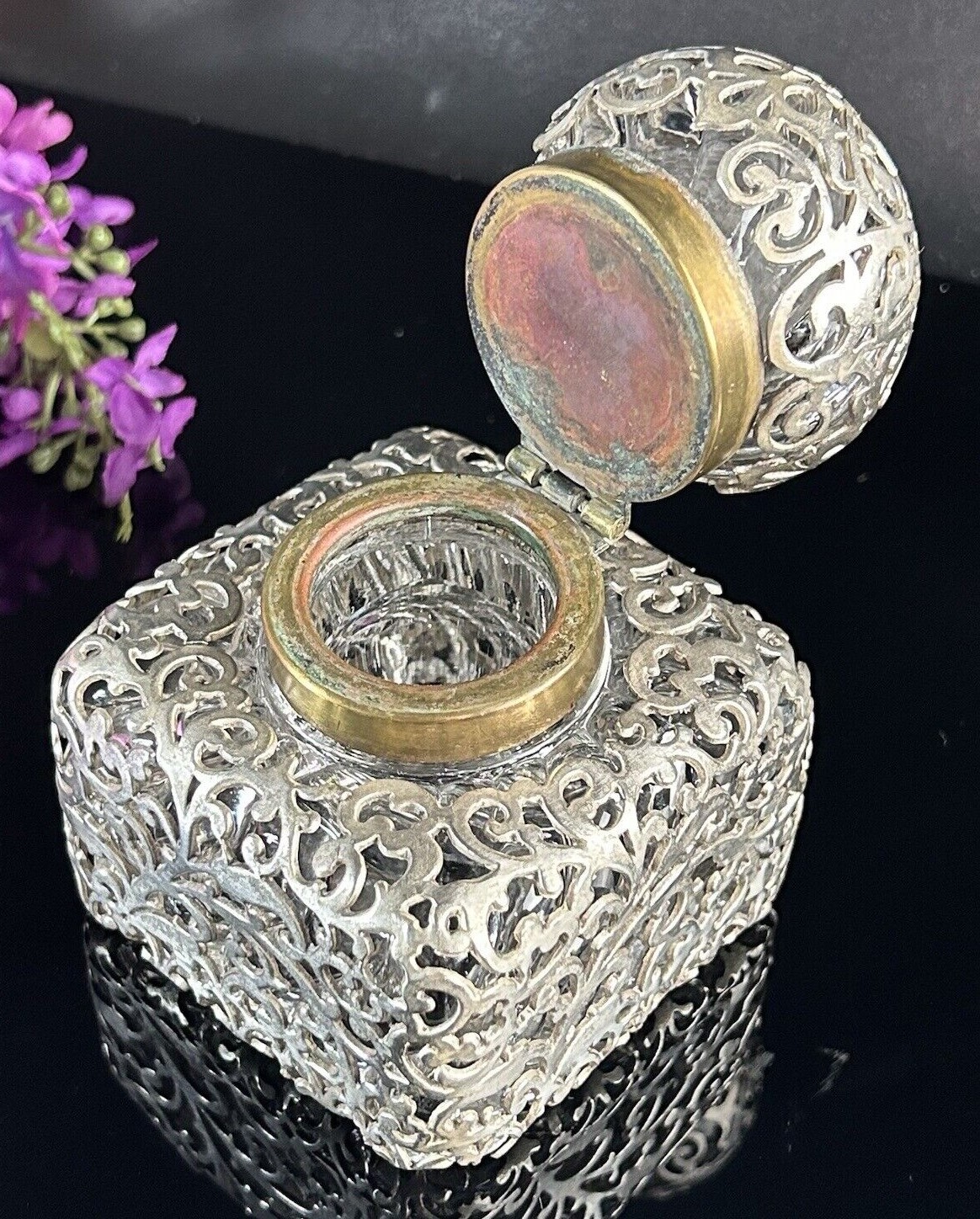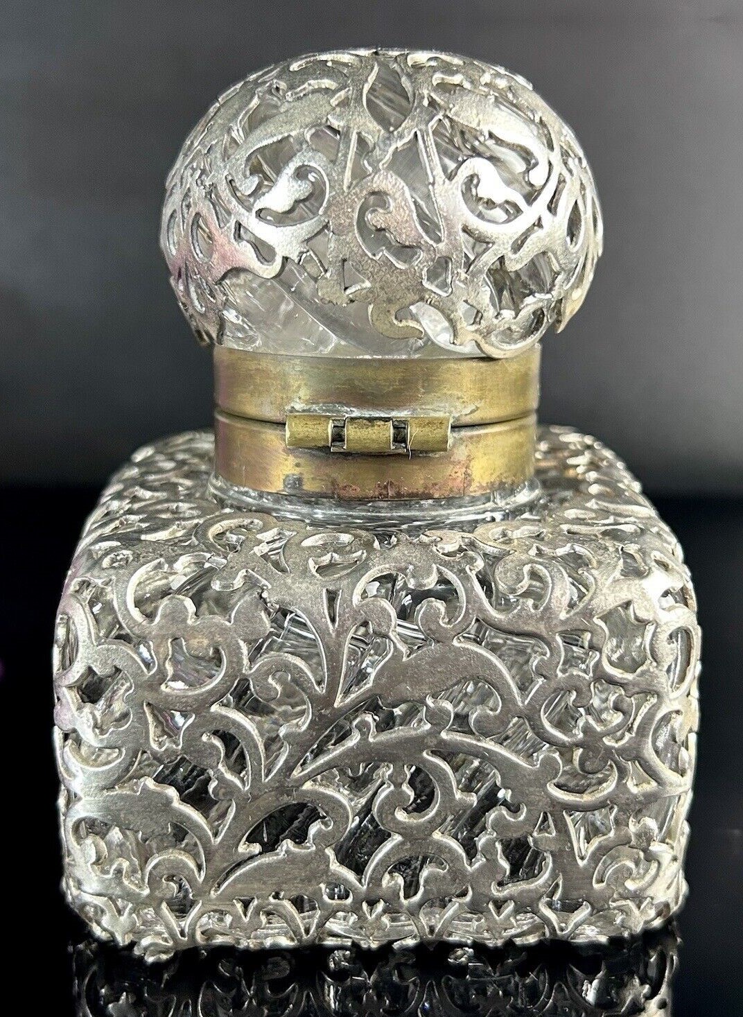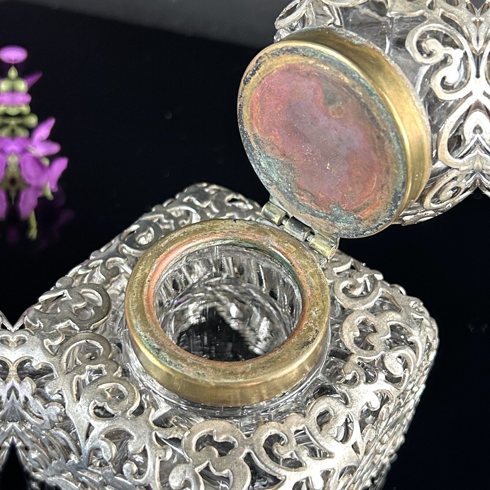 A large cut glass inkwell with a hinged lid encased with ornate metalwork.