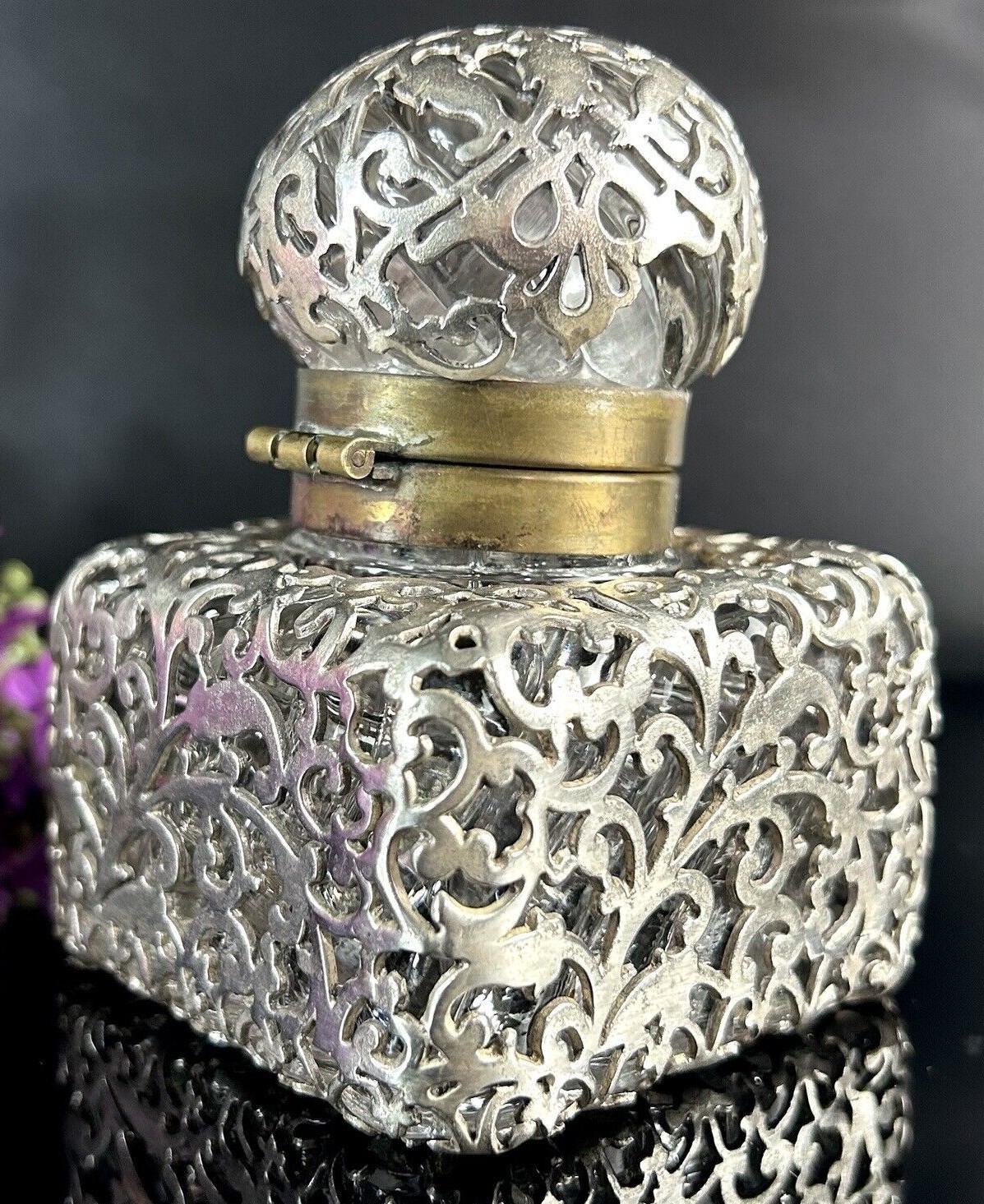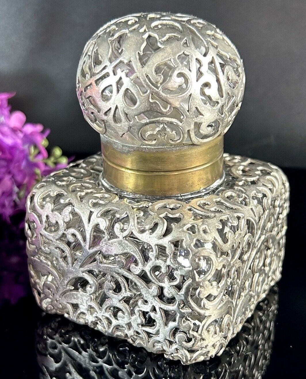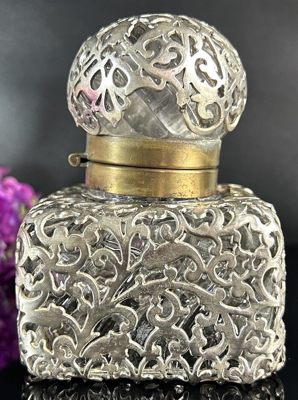A large cut glass inkwell with a hinged lid encased with ornate metalwork.