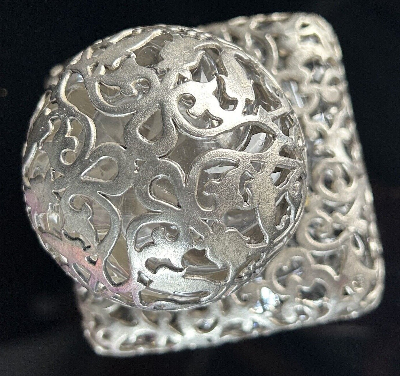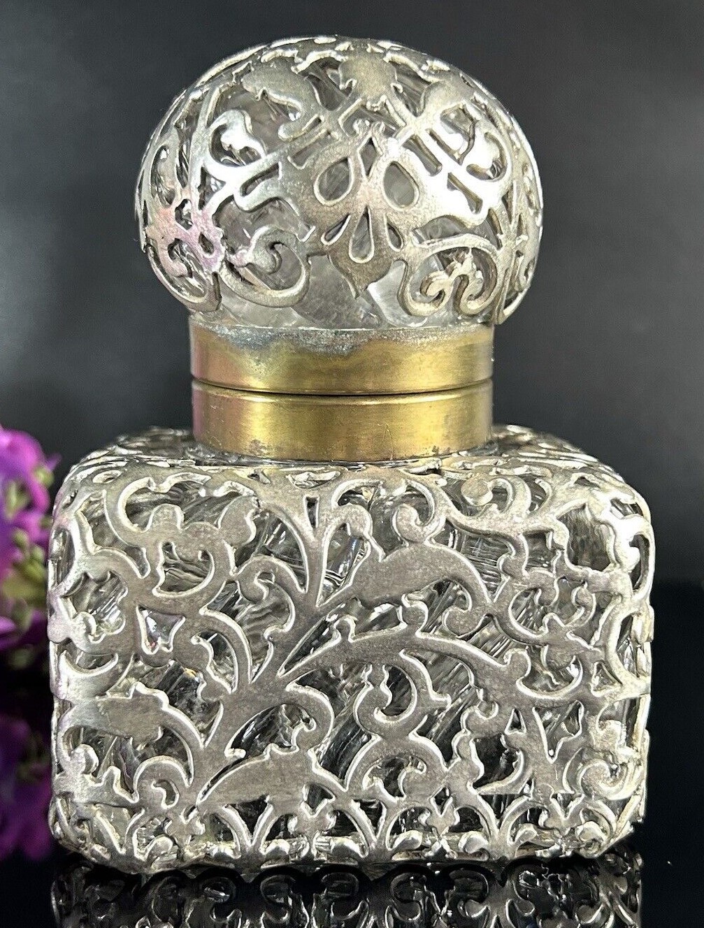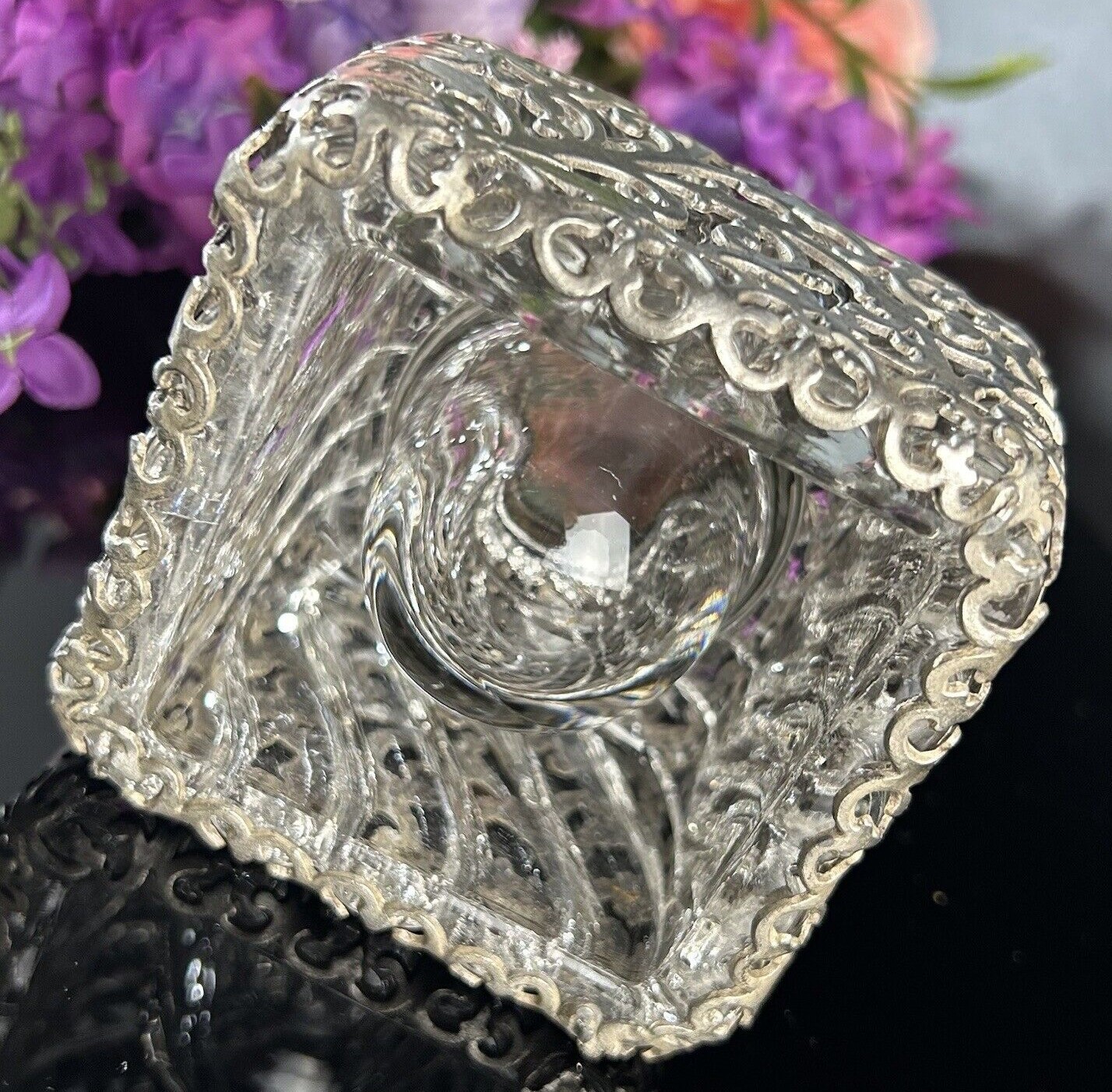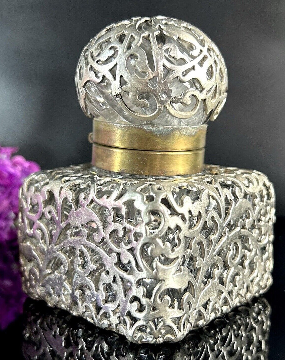 A large cut glass inkwell with a hinged lid encased with ornate metalwork.