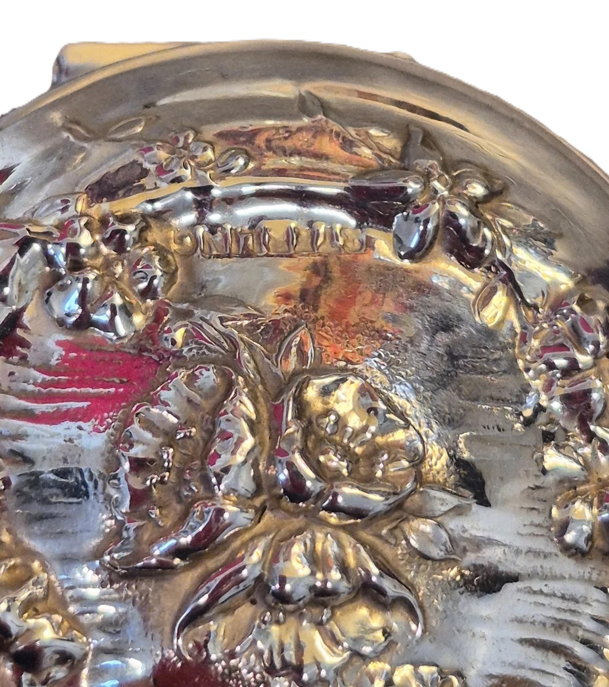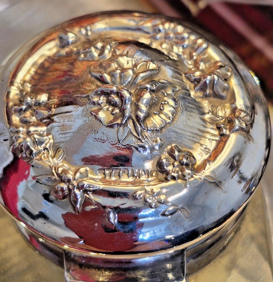 • The Webster Company (North Attleboro, MA): Webster was prolific in producing small sterling desk and vanity items. They frequently used a dense, high-relief floral pattern very similar to this. Their hallmark is often a small “W” inside a geometric bracket, which can sometimes be found near the word “STERLING” or hidden inside the lid’s rim.