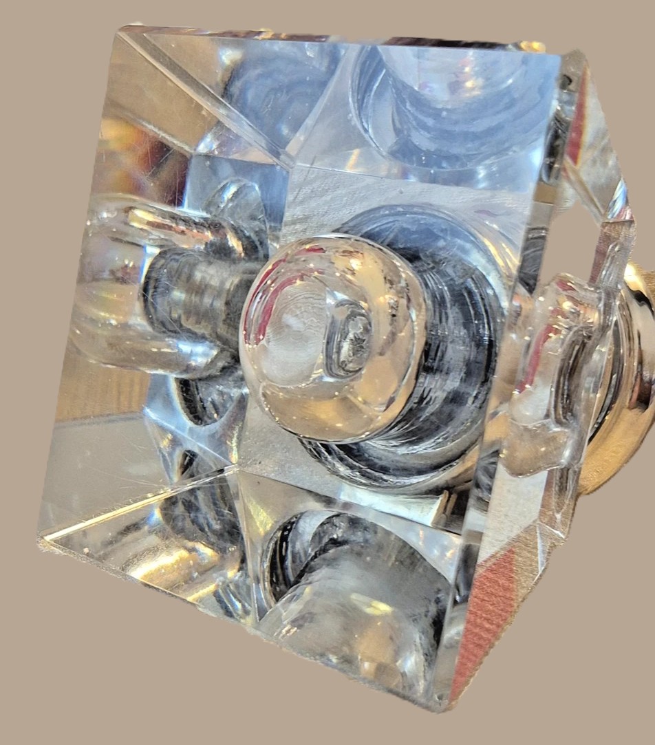 • The Base: The inkwell is crafted from a solid block of clear glass or crystal, cut into a truncated square pyramidal shape. The thick, beveled edges create brilliant light refraction, a hallmark of high-quality lead crystal. The interior ink reservoir is a deep, rounded bulb or “well” suspended within the solid glass block.