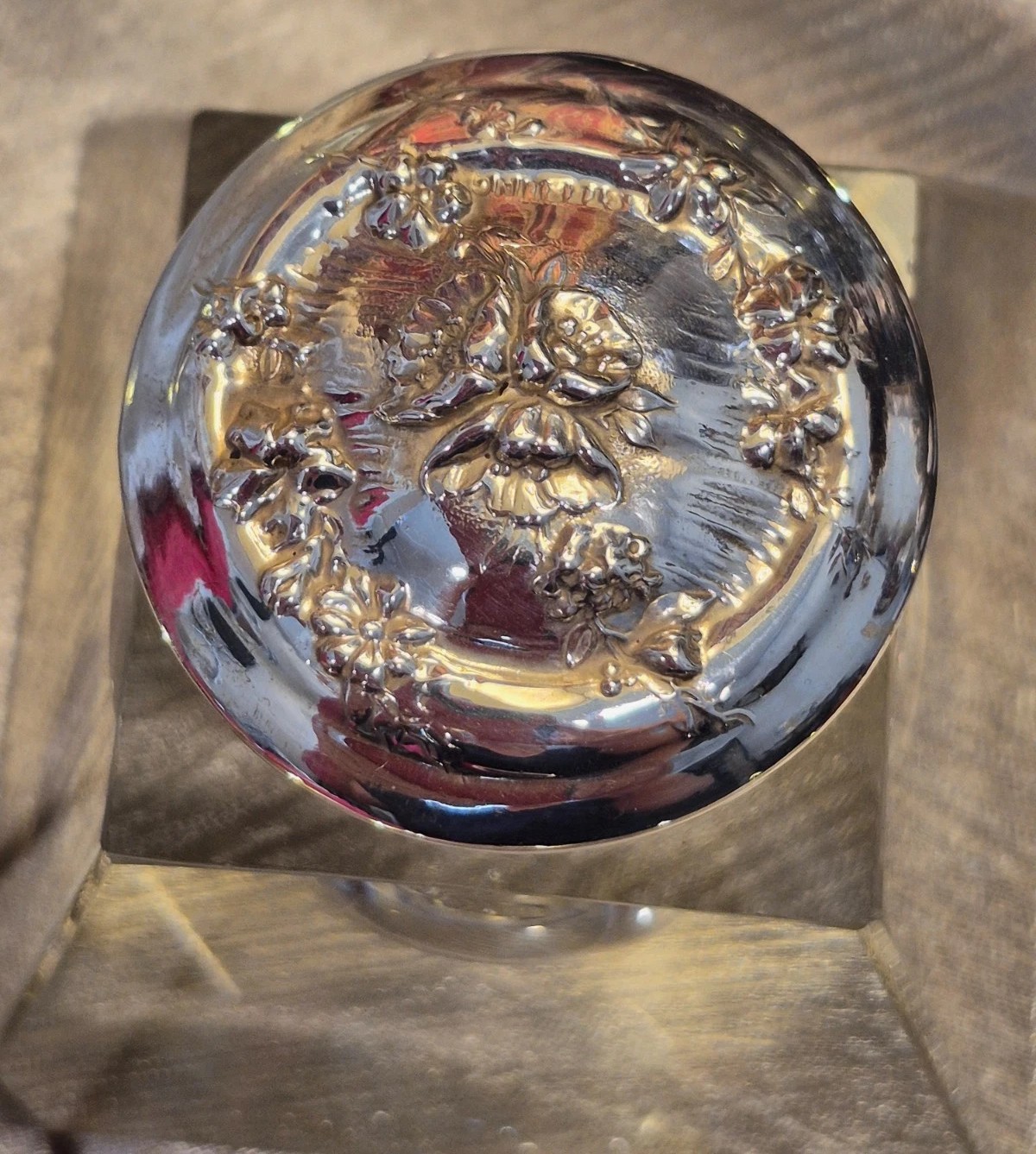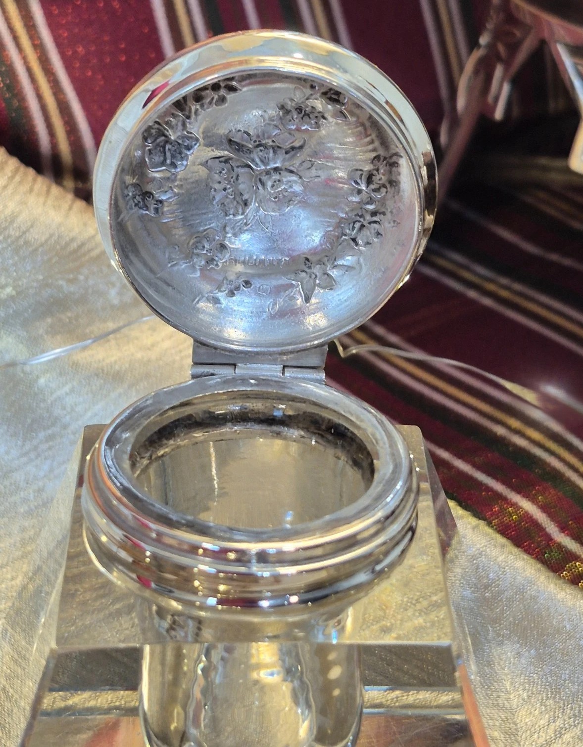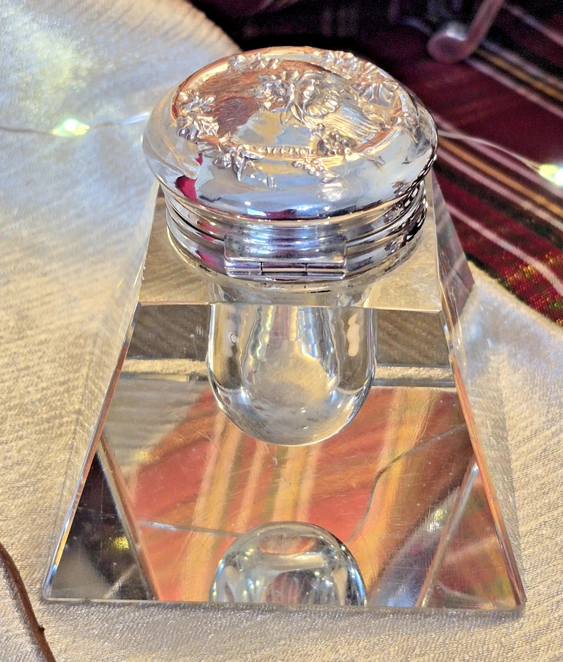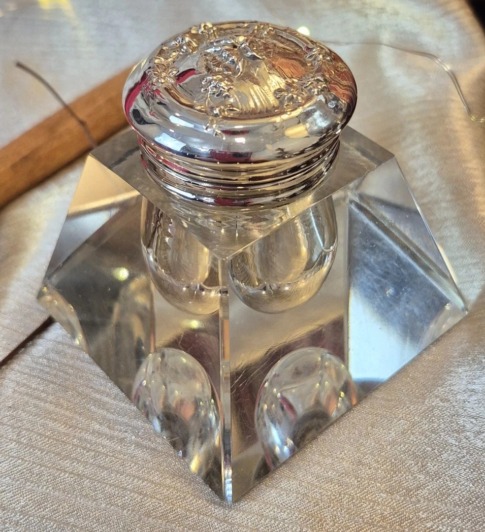 Lead Crystal Inkwell with Sterling Silver Repoussé Lid