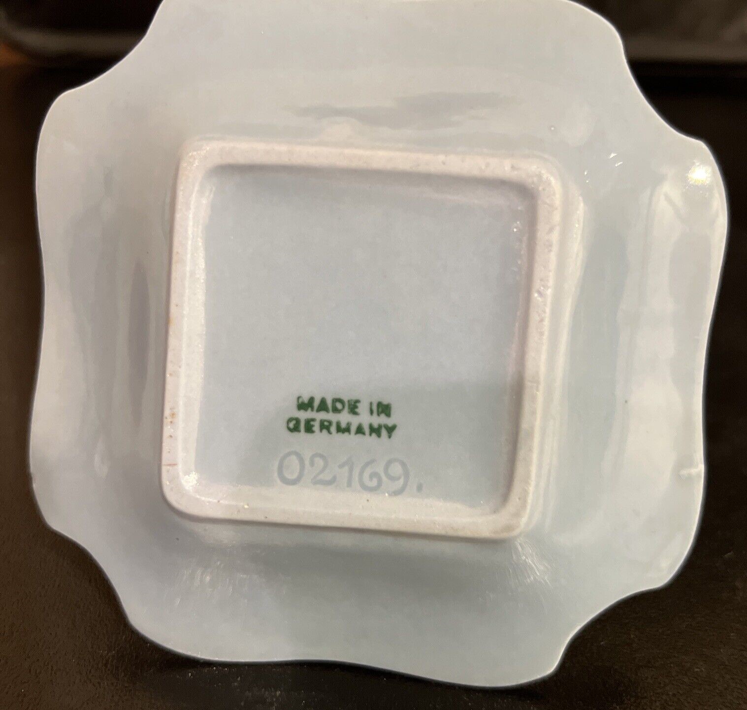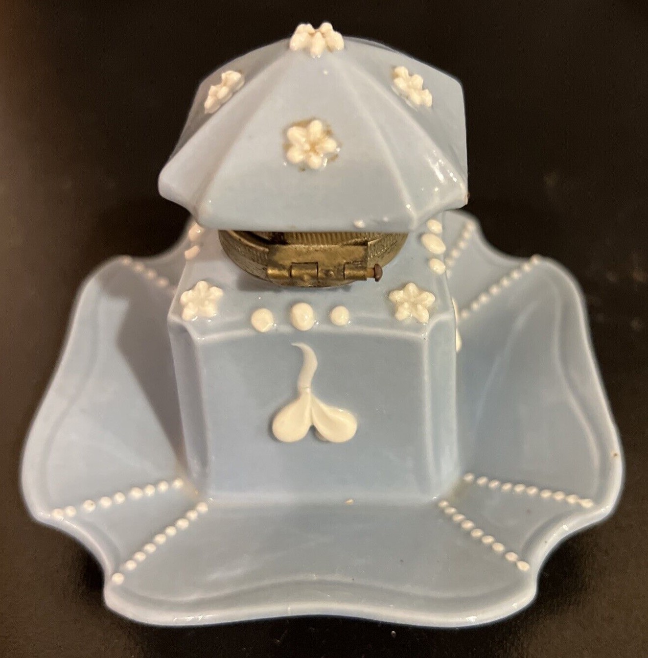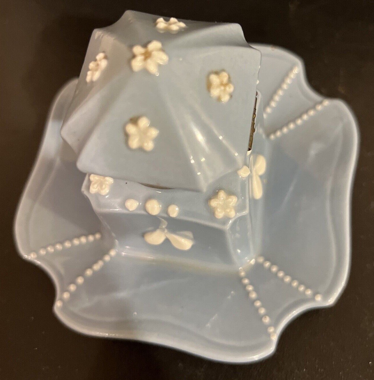 Blue porcelain with applied white flowers and beads attached to a saucer base. The lid is hinged with a brass collar. Marked “02169 Made in Germany”.