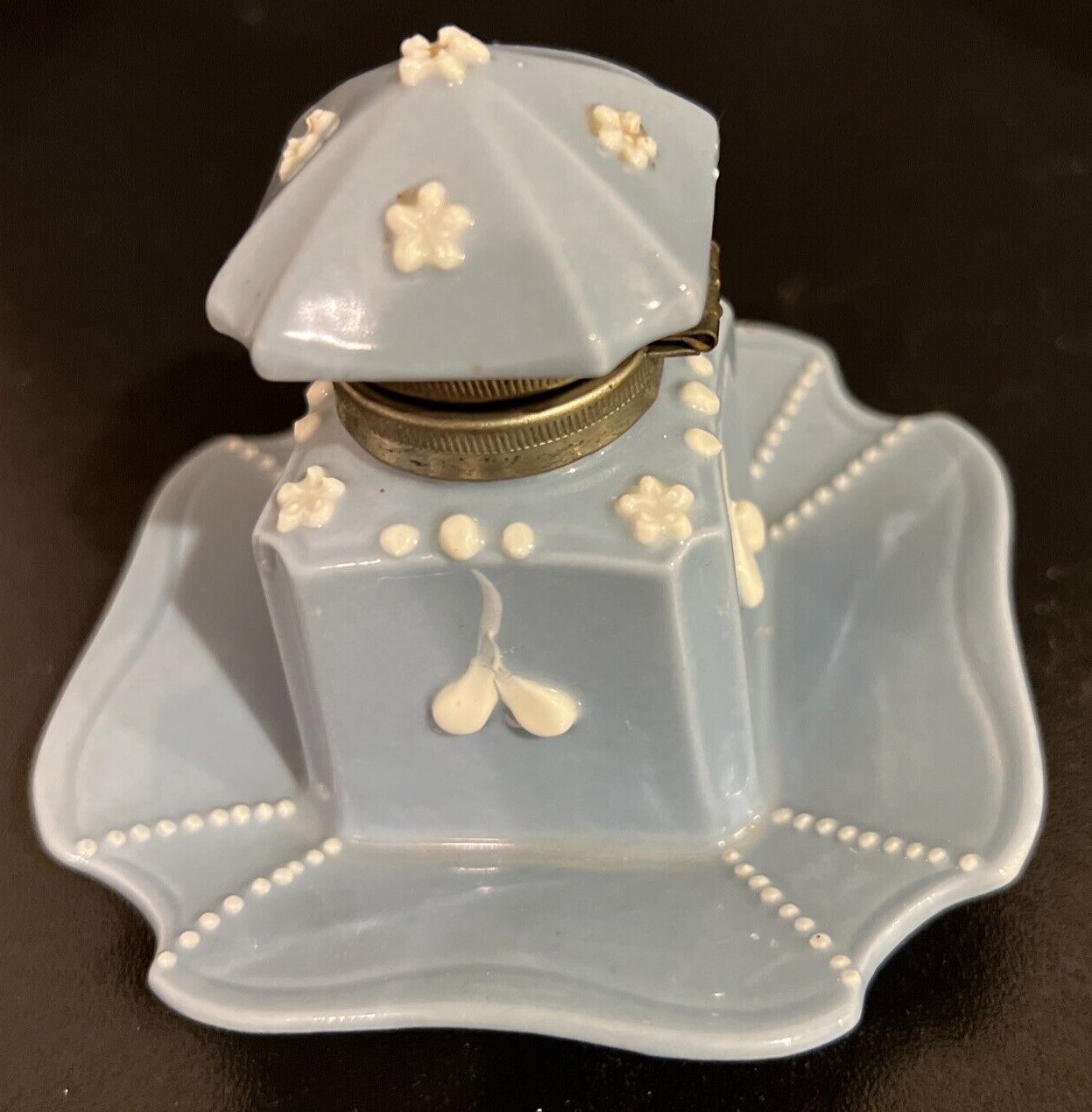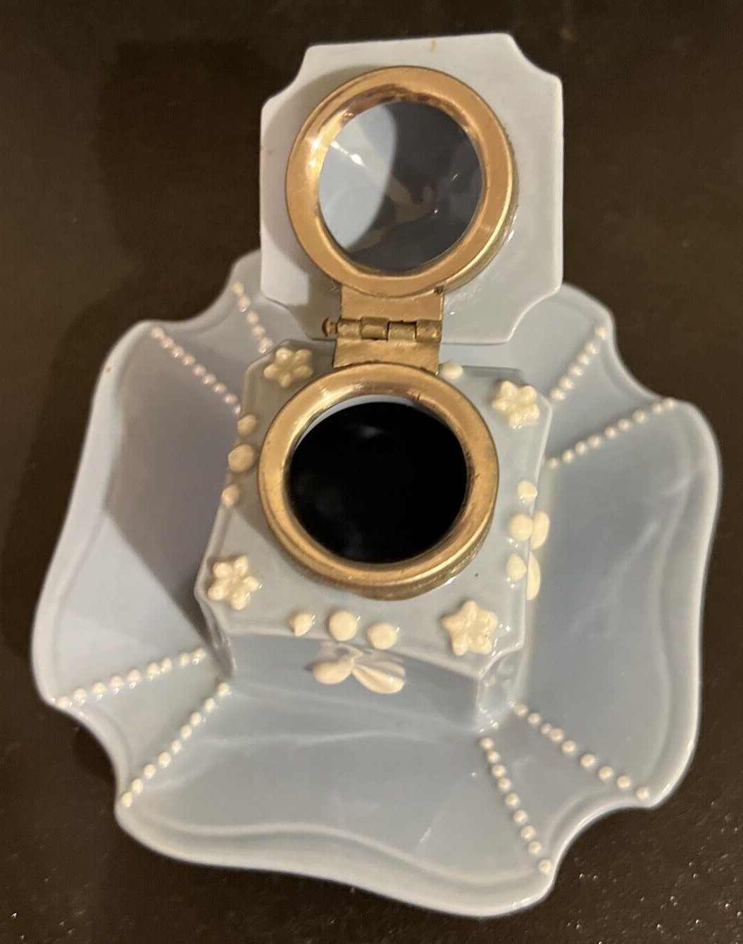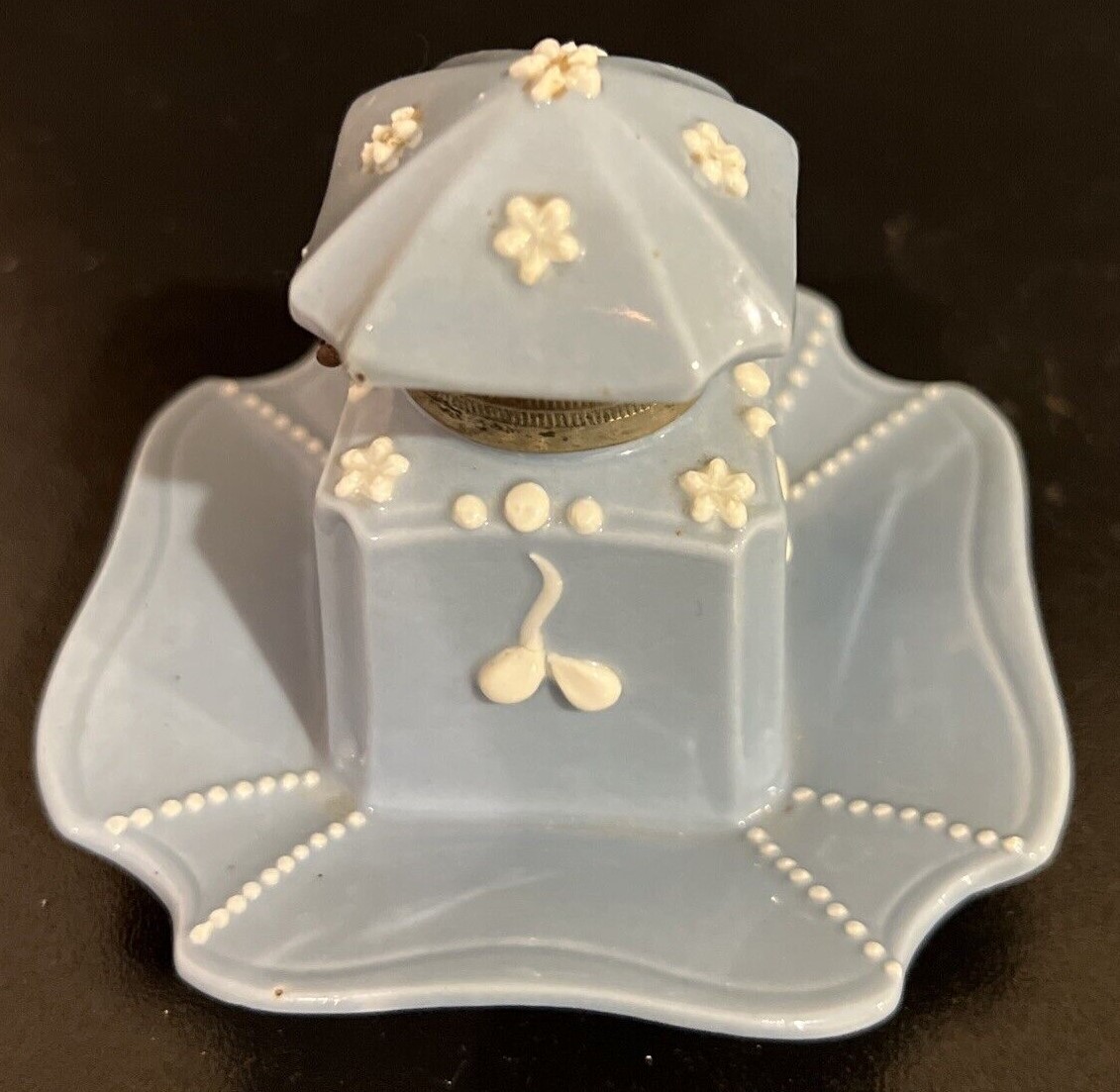 Blue porcelain with applied white flowers and beads attached to a saucer base. The lid is hinged with a brass collar. Marked “02169 Made in Germany”.