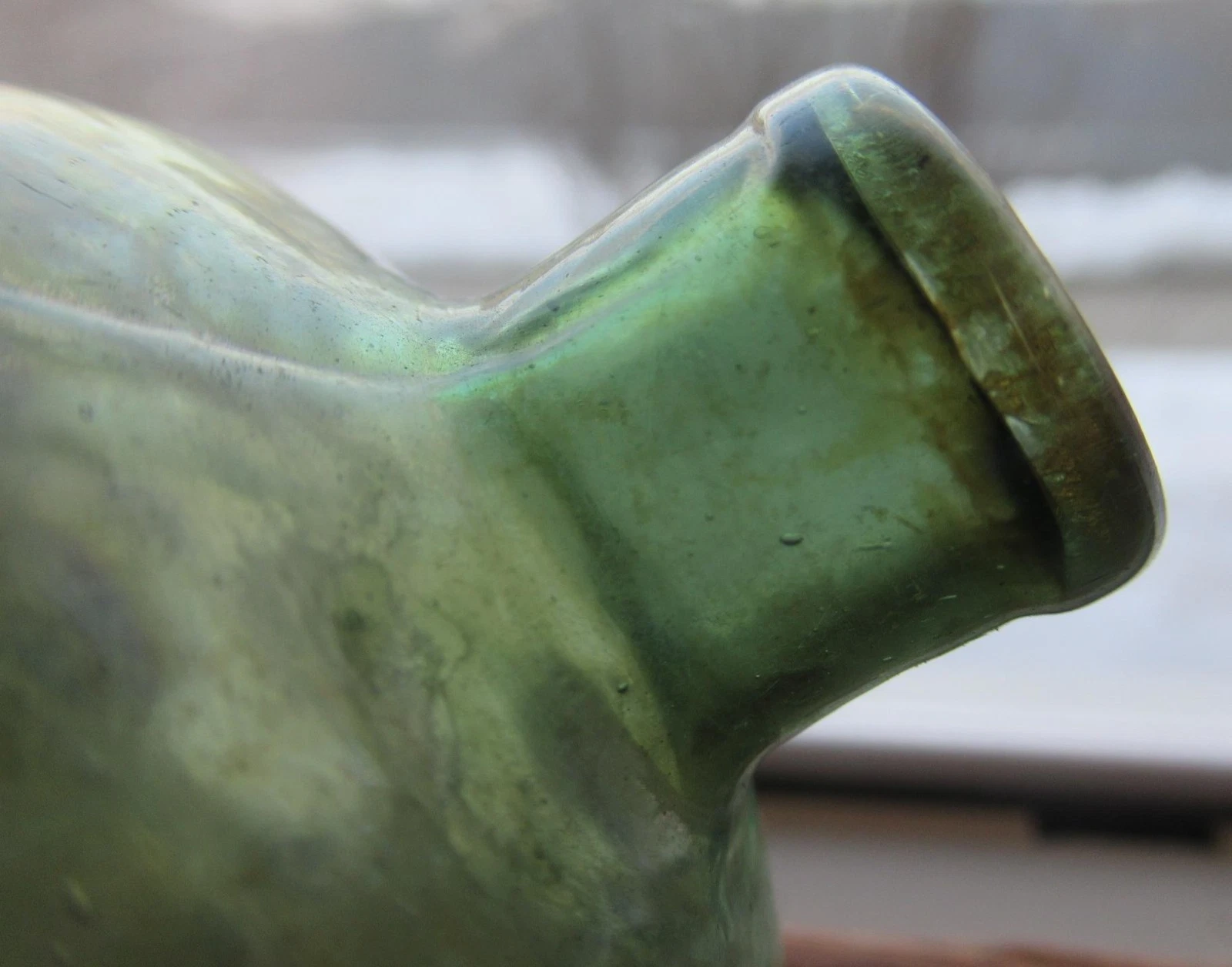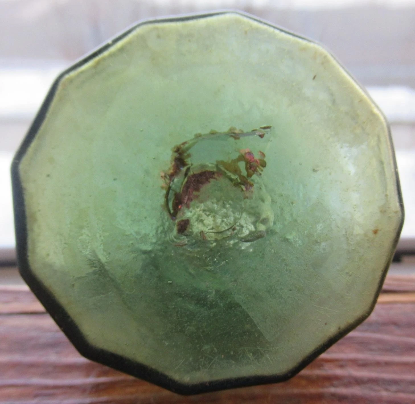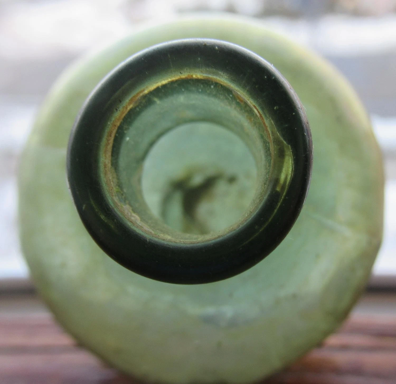 - Interior: There is some light, spotty haze remaining on the inside, which is typical for bottles recovered from the ground, but it does not detract from the overall display quality or the vibrant green hue.