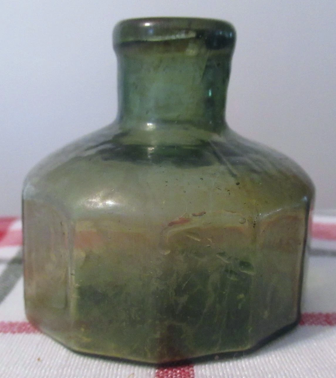 - Glass Texture: The bottle exhibits a distinct whittled or “orange peel” texture across the facets, indicating it was blown into a cool metal mold.