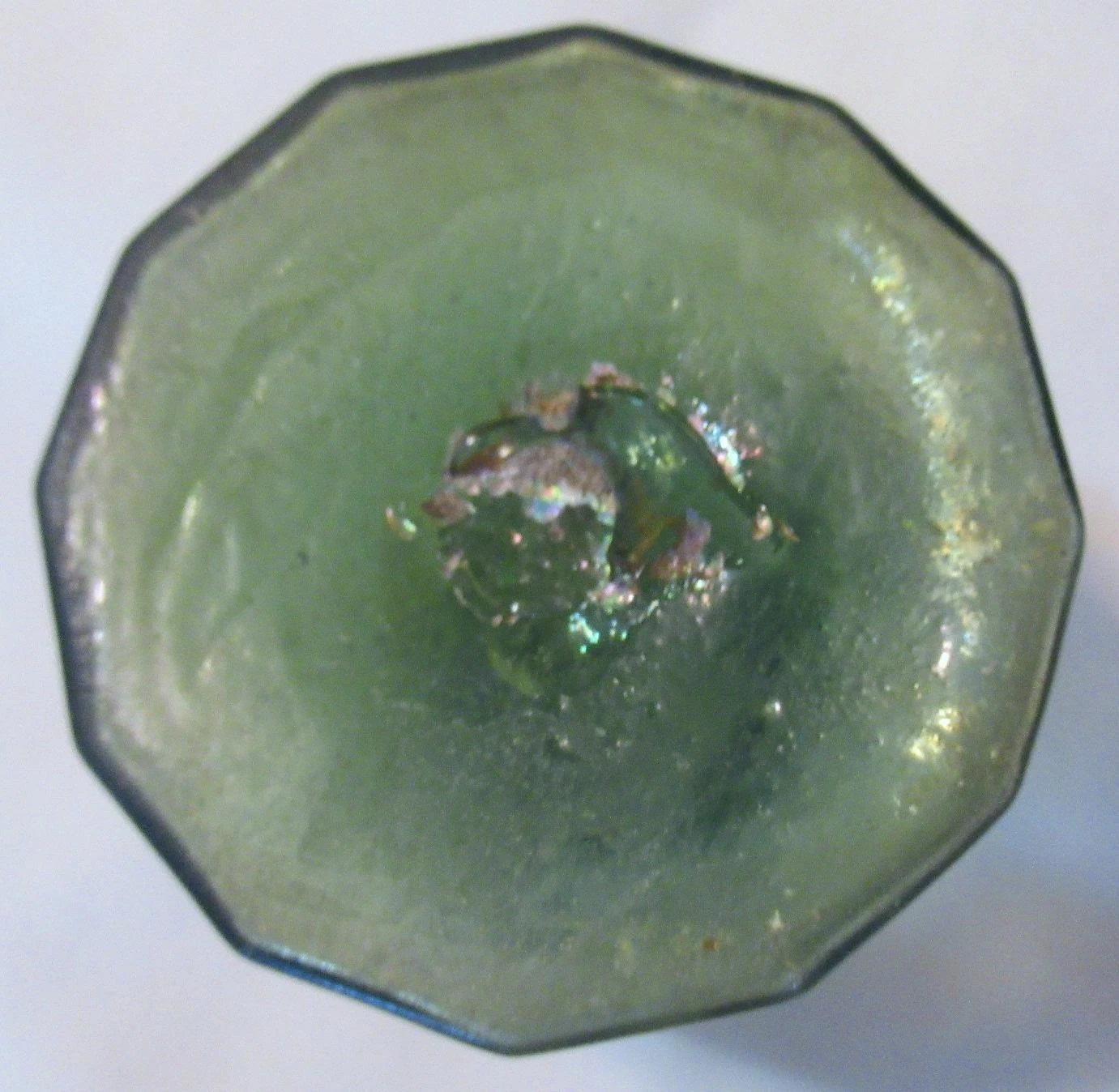 - Color: Striking light olive green. The glass is filled with tiny “seeds” (micro-bubbles), characteristic of early glass batches.