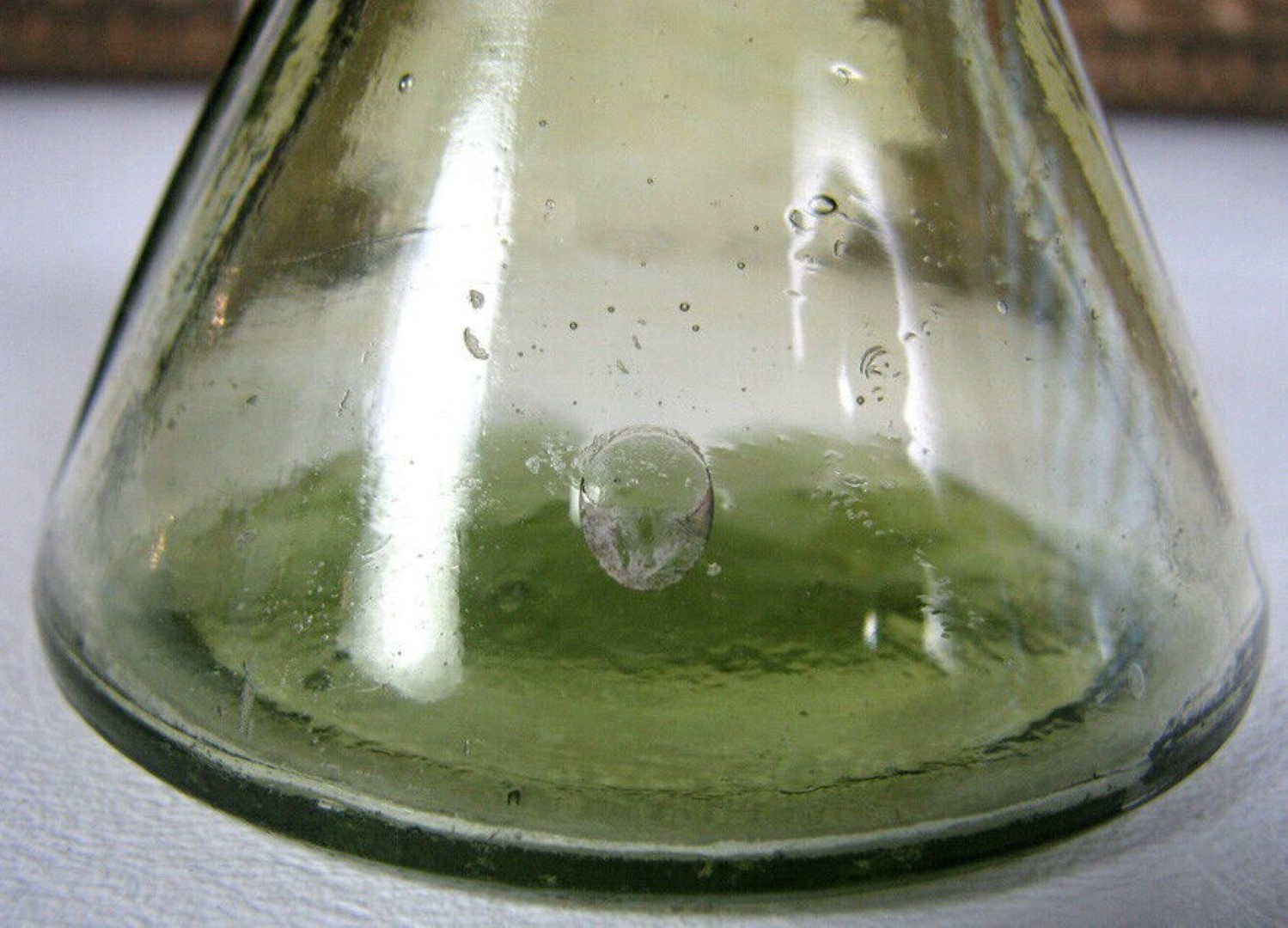 Hand-blown, tooled top, unembossed conical ink bottle in an unusual yellow green color.